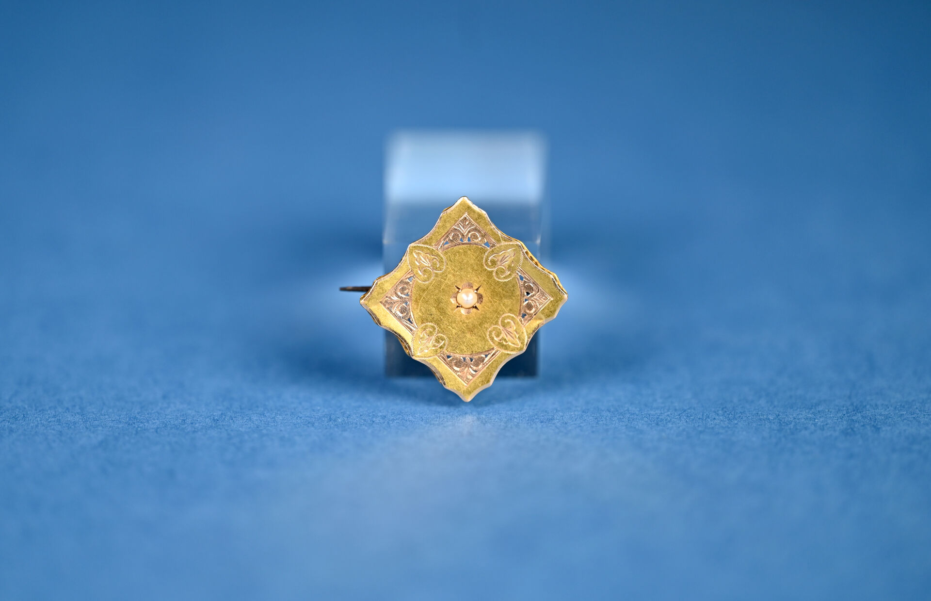 Broche en deux ors 18K 750/1000e et petite perle. Aiguille en métal. Poids brut. : 1,3 g.
