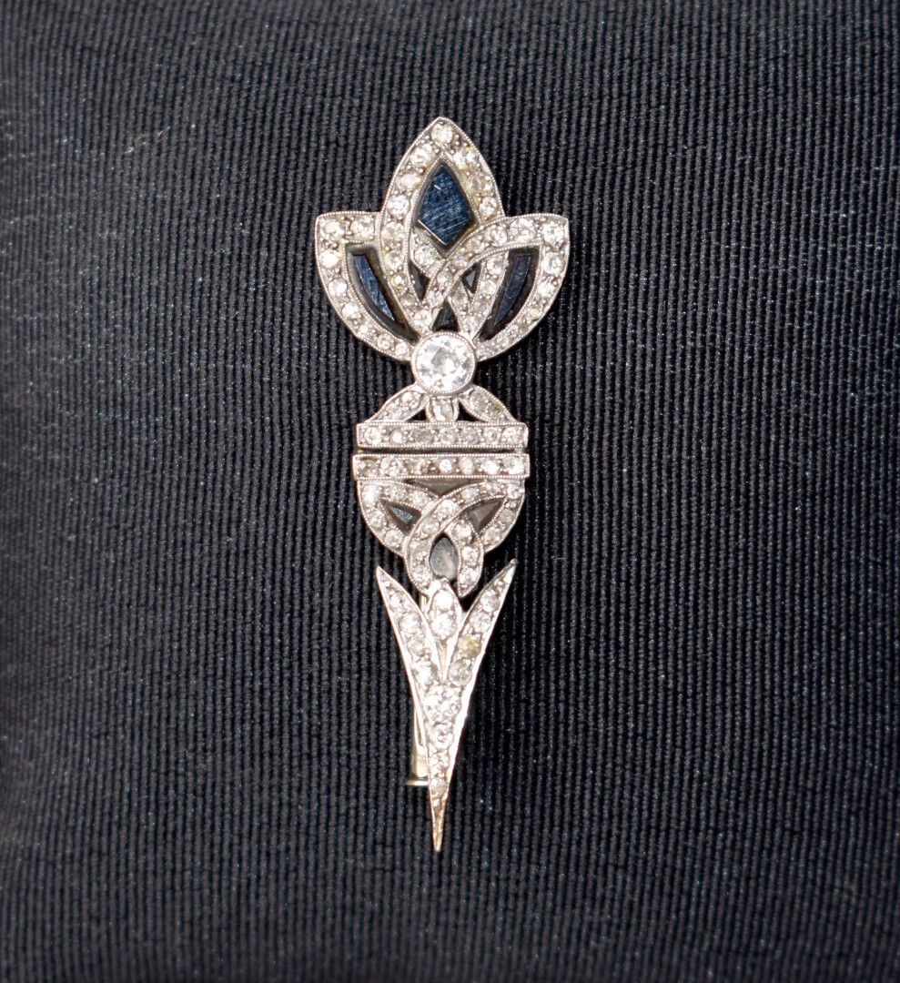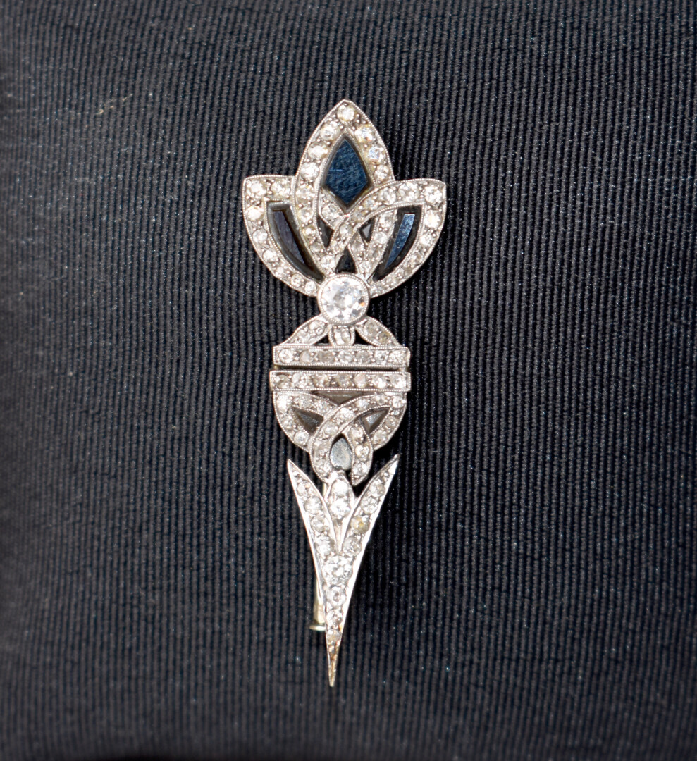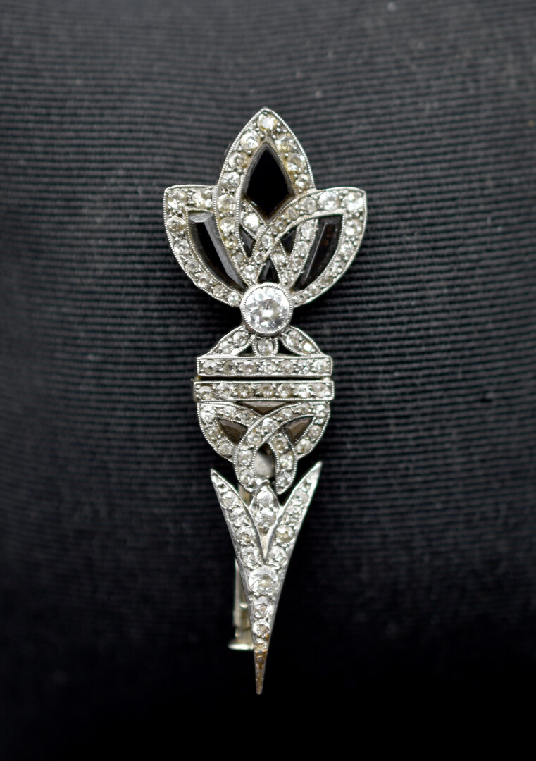 Broche en or gris et platine 800/1000e en forme de flèche. Elle est sertie en son centre d’un diamant de taille ancienne d’environ 0,18 carat, pavage de petits éclats de diamants et pierre dure noire (petits manques). Travail Art déco, vers 1920. Poids brut : 7,12 g.