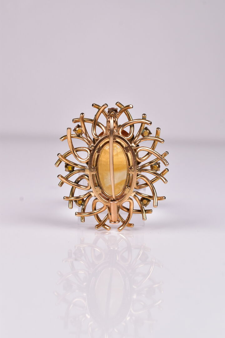 Broche en or jaune 18K 750/1000e centrée d’une citrine ovale facettée dans un entourage d’entrelacs et de petits citrines. Long. : 4 cm – Haut. : 3,5 cm. Poids brut. : 18 g.