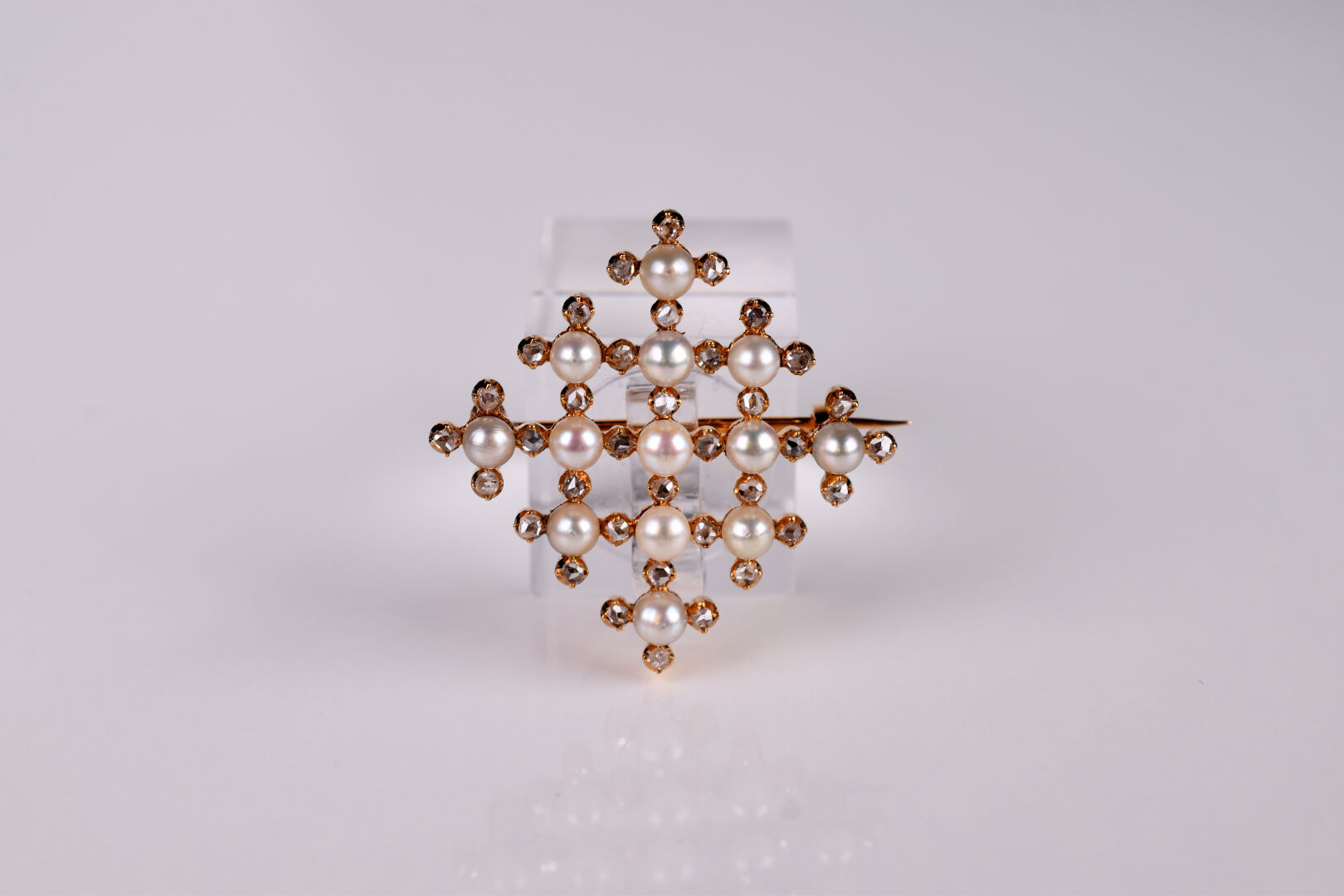 Broche en or jaune 18K 750/1000e de forme losange sur un quadrillage de petites perles de cultures blanches et de diamants taille rose. Dim. : 3 x 3 cm. Poids brut. : 8 g.