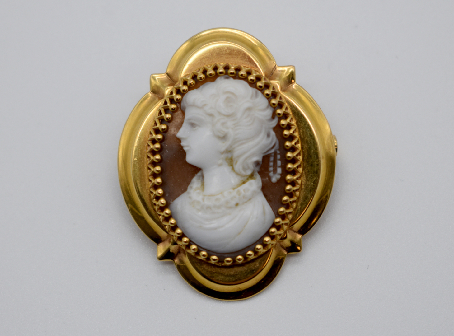 Broche en or jaune 18K 750/1000e ornée d’un camée coquillage à figure d’une femme de profil. Poids brut. : 6,30 g.