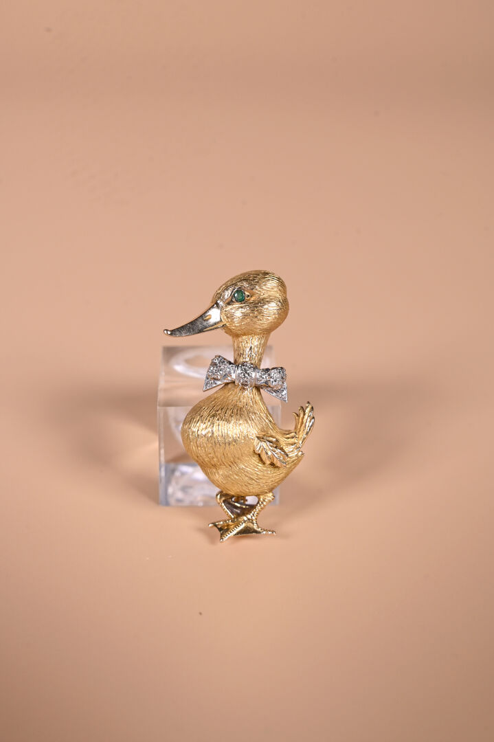 Broche en or jaune 18K 750/1000e représentant un canard au noeud papillon, l’oeil serti d’une émeraude et le noeud orné de diamants. Poinçon tête d’aigle. Haut. : 4,5 cm. Poids brut. : 13,25 g.