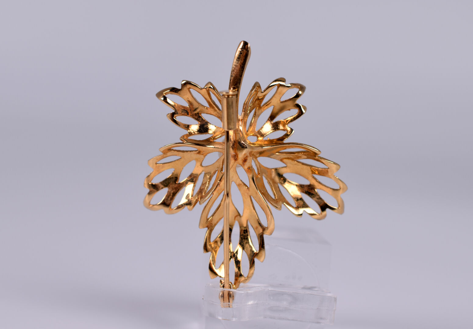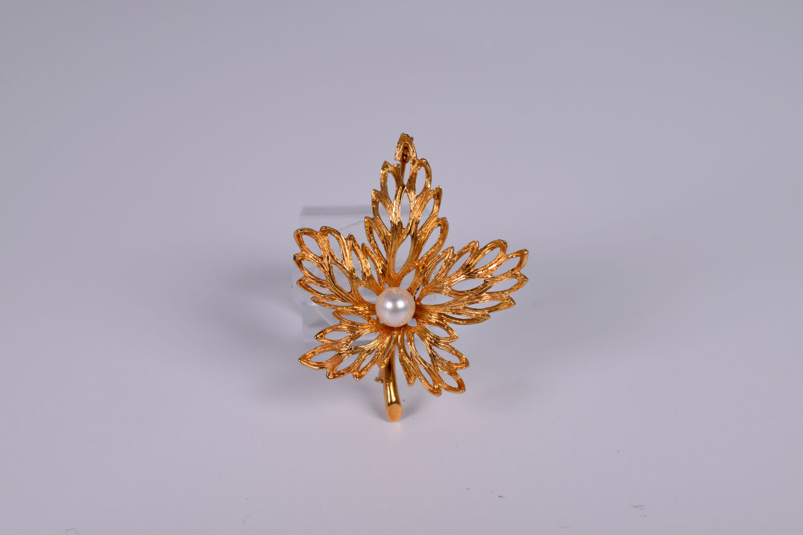 Broche feuille en or jaune 18K 750/1000e ajournée et centrée d’une perle de synthèse. Poids brut. : 6,56 g.