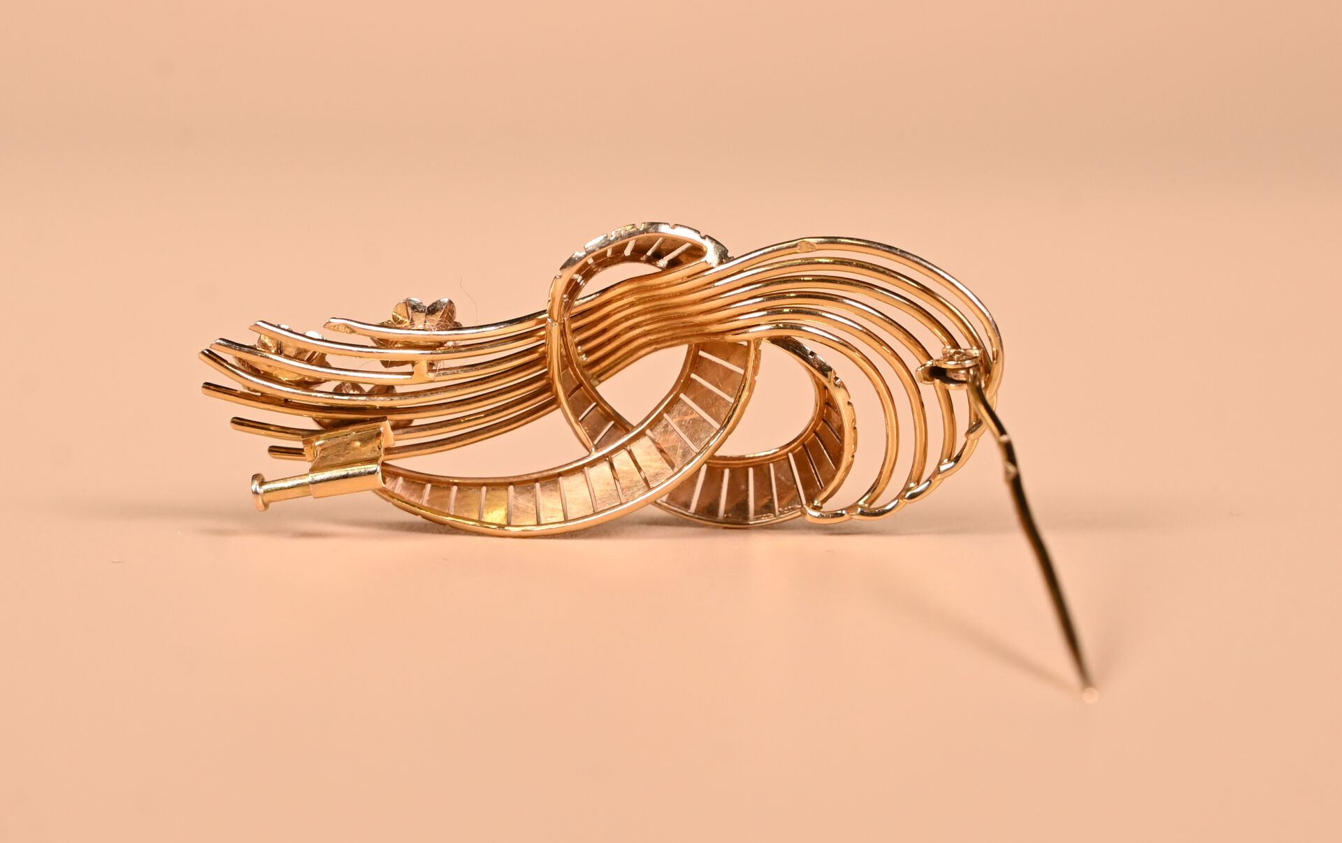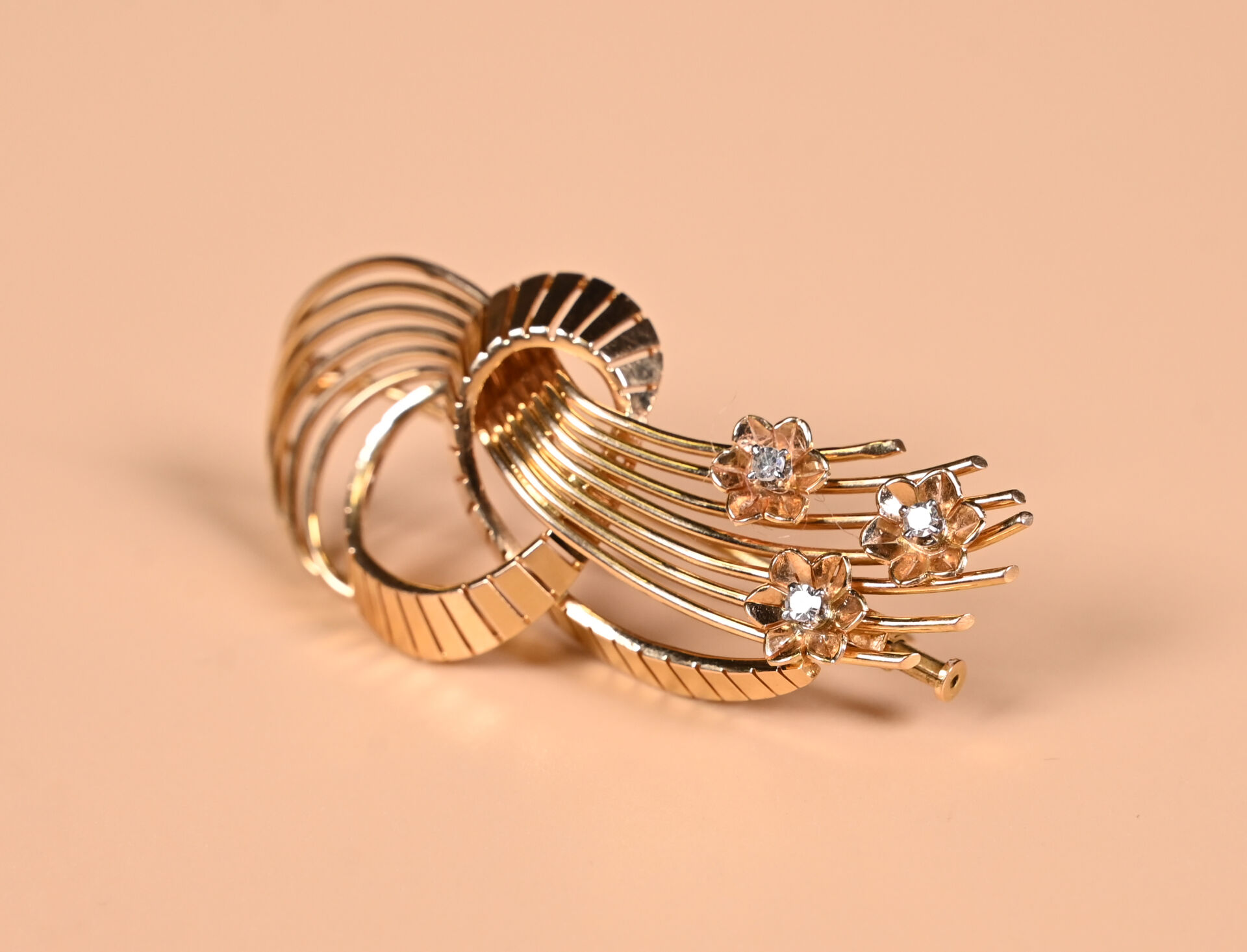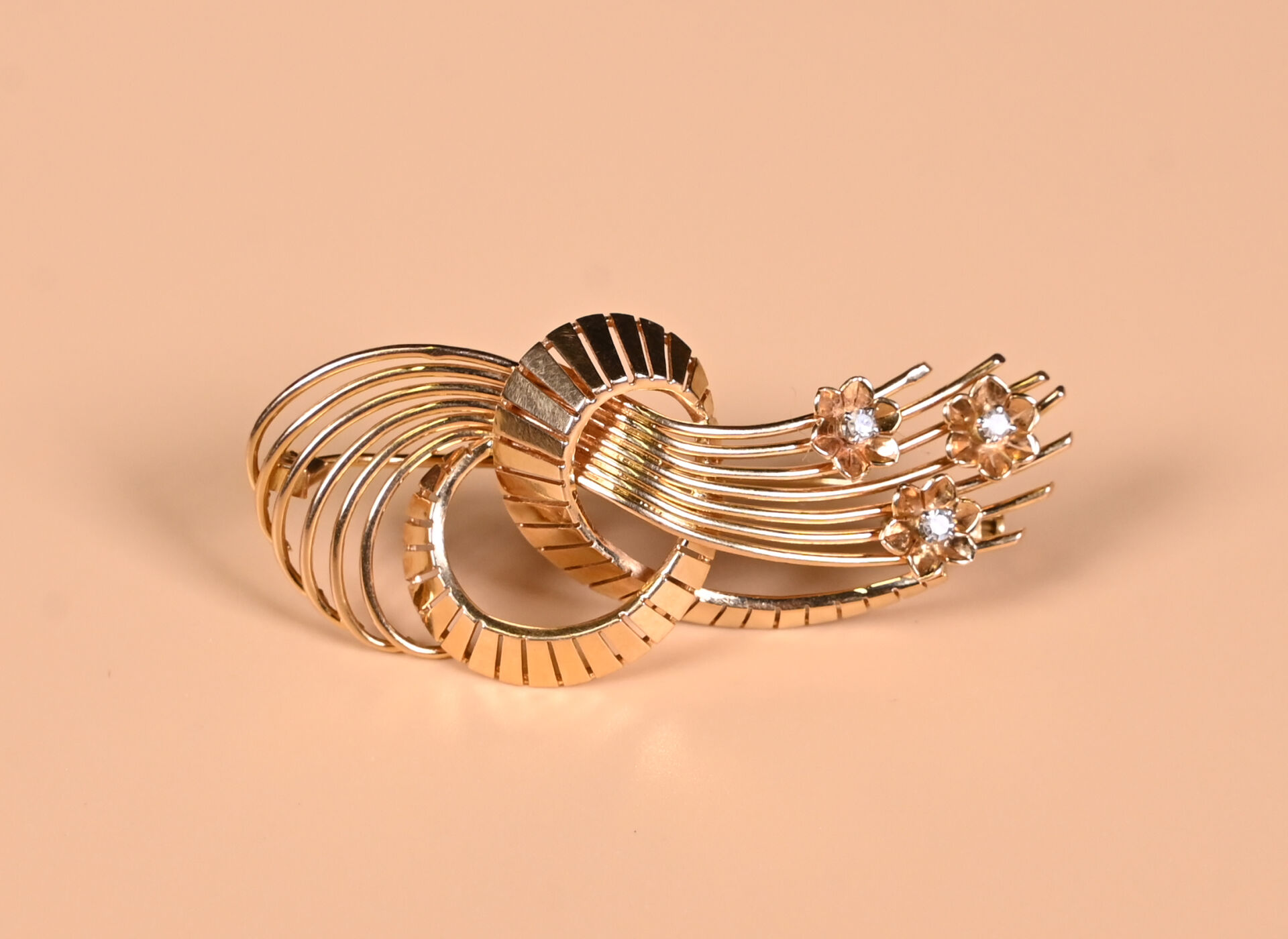 Broche gerbe en or jaune 18K 750/1000e sertie de trois petits diamants de taille brillant. Poids brut : 9,98 g.