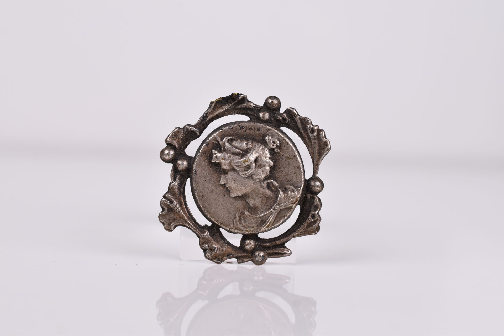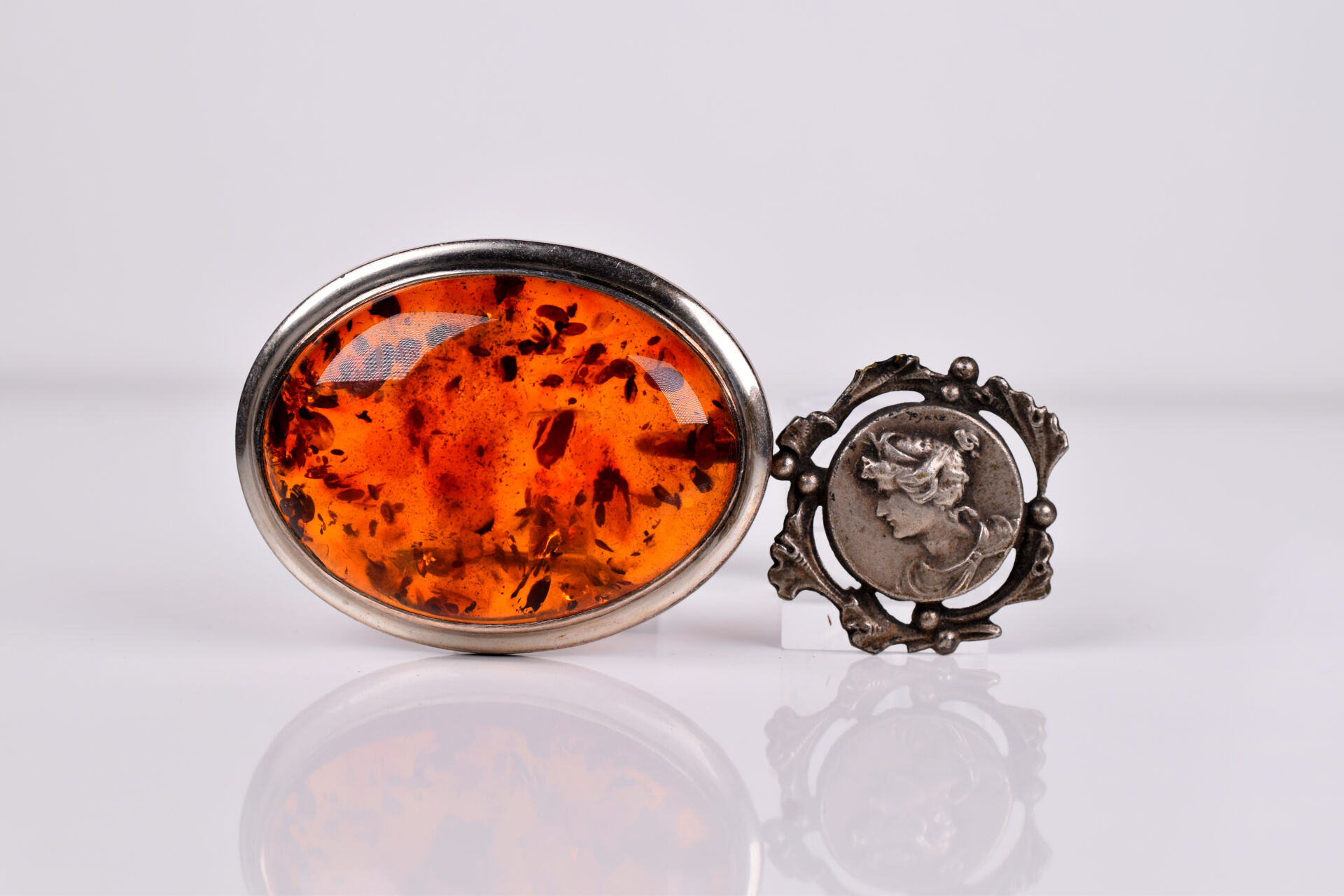 Broche ovale en argent 925/1000e et cabochon d’ambre (possibilité de la porter en pendentif). Dim. : 4 x 5 cm. Poids brut. :21,7 g. On joint un élément de médaille en argent 800/1000e (période Art Nouveau). Haut. : 2,5 cm. Poids. : 1,6 g.