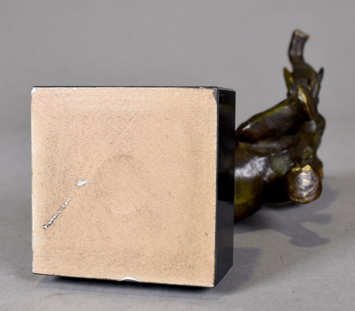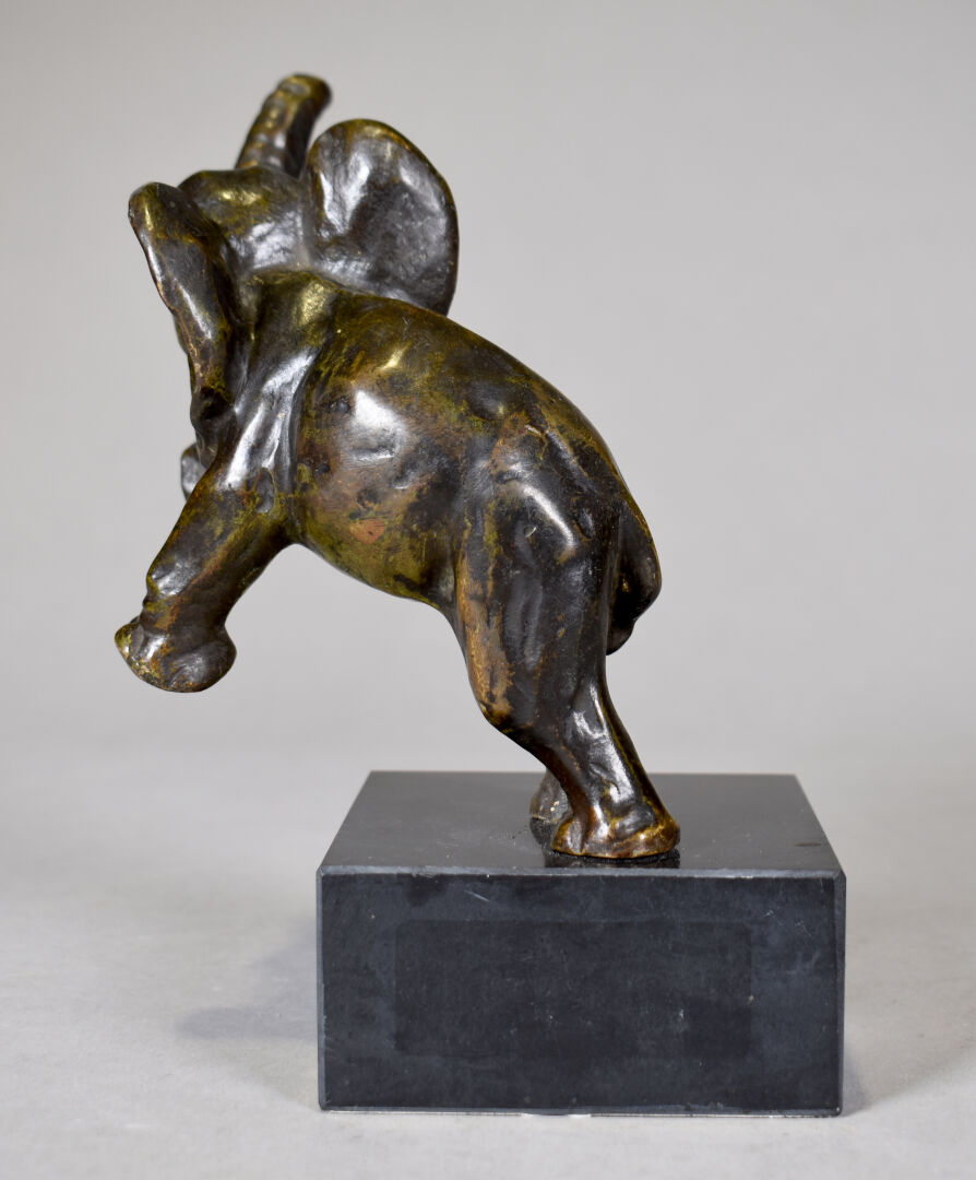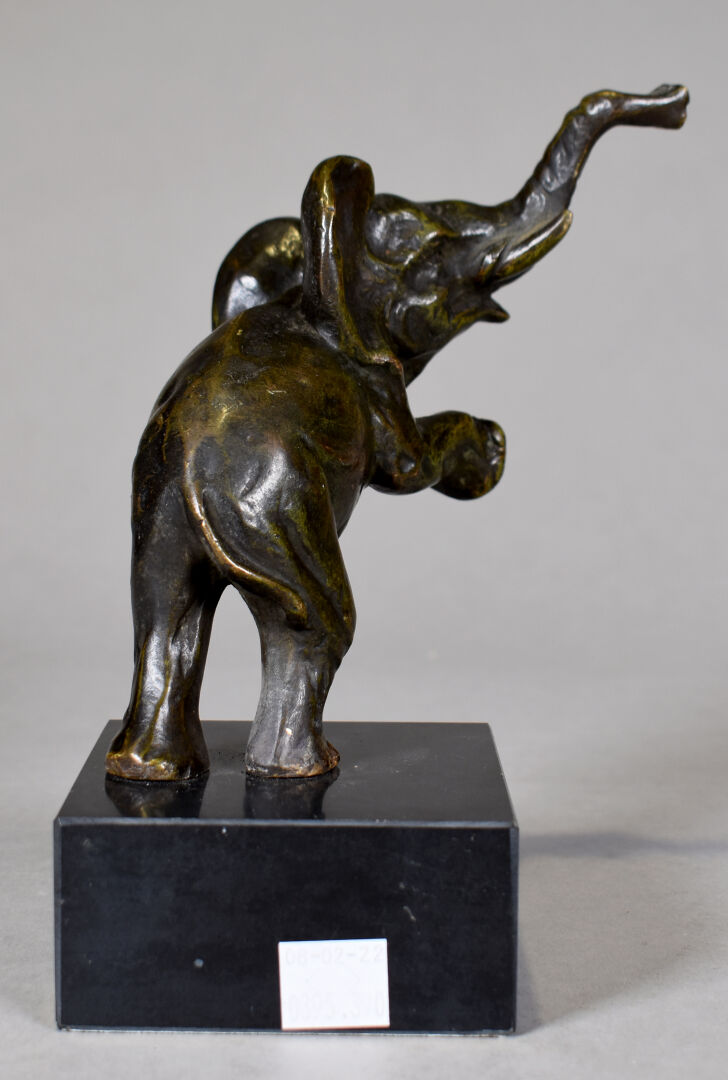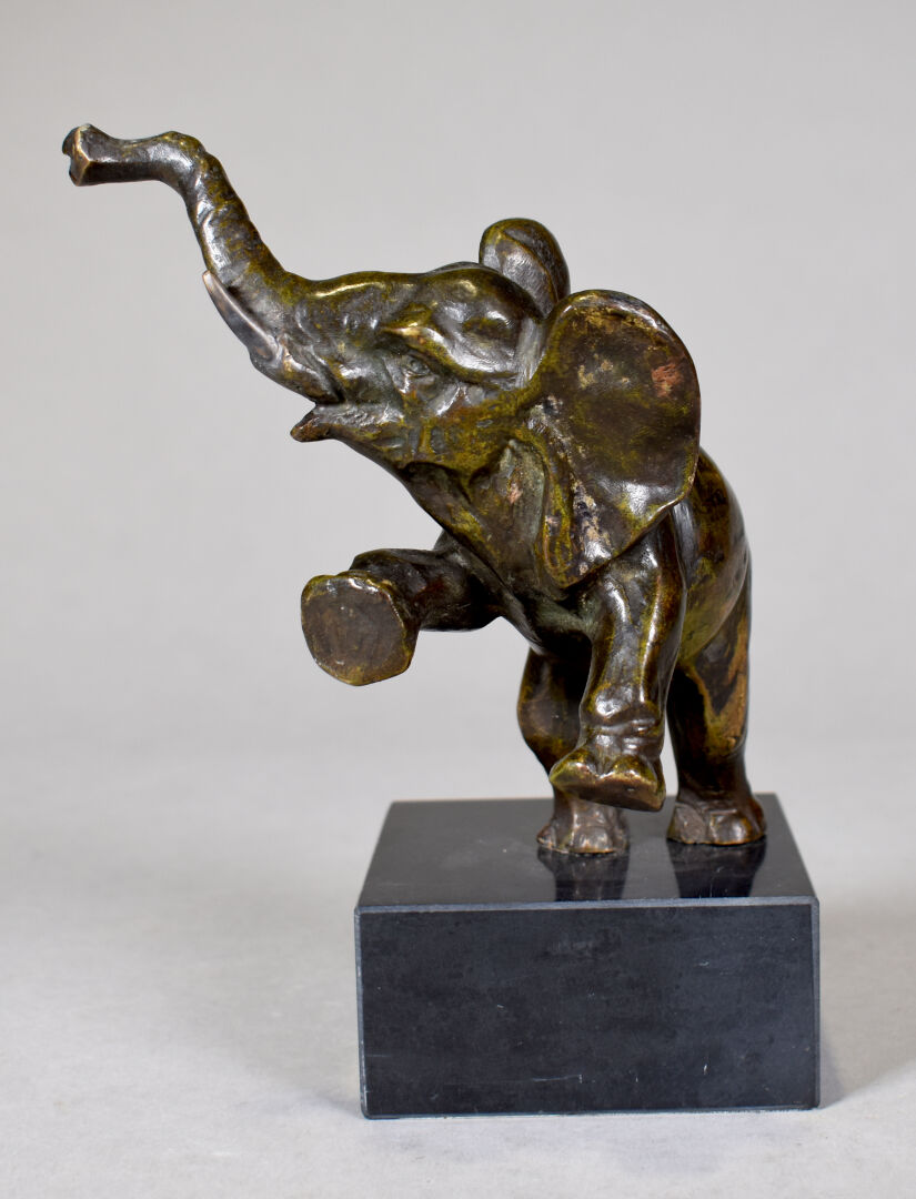 Bronze à patine brun représentant un éléphant barrissant. Socle de pierre dure noir. Haut. : 18.5 cm.