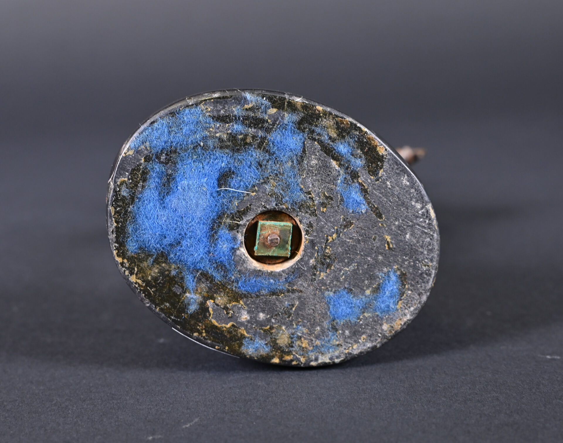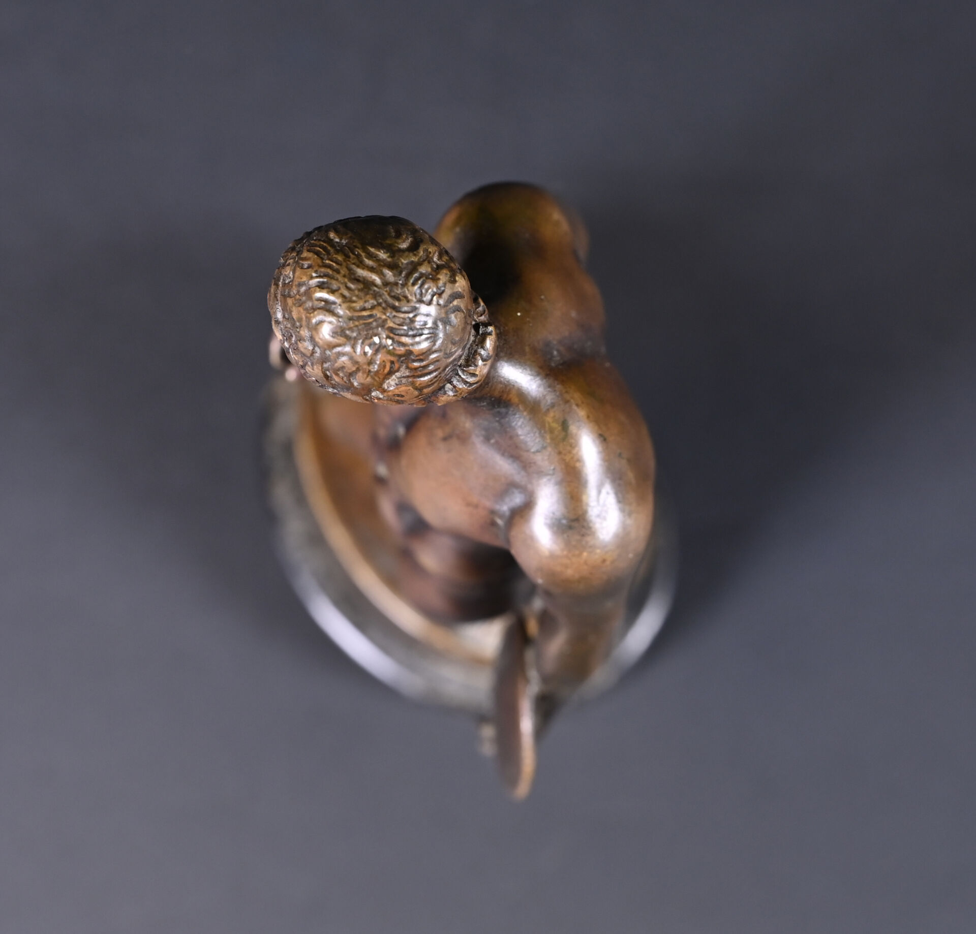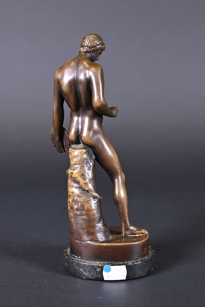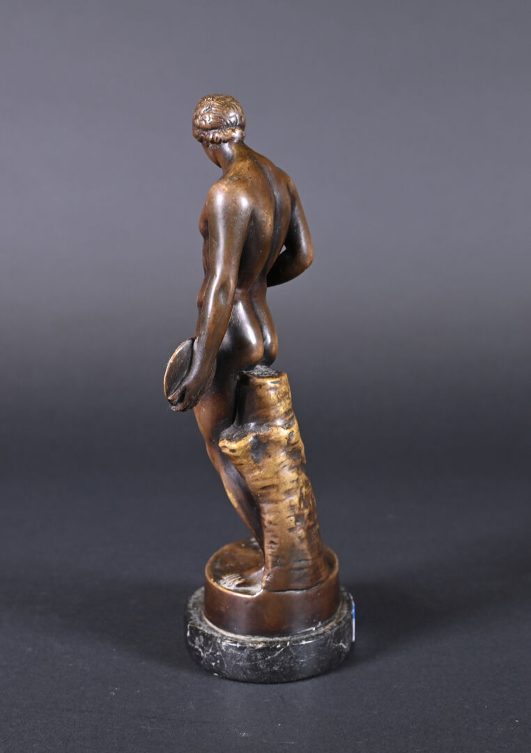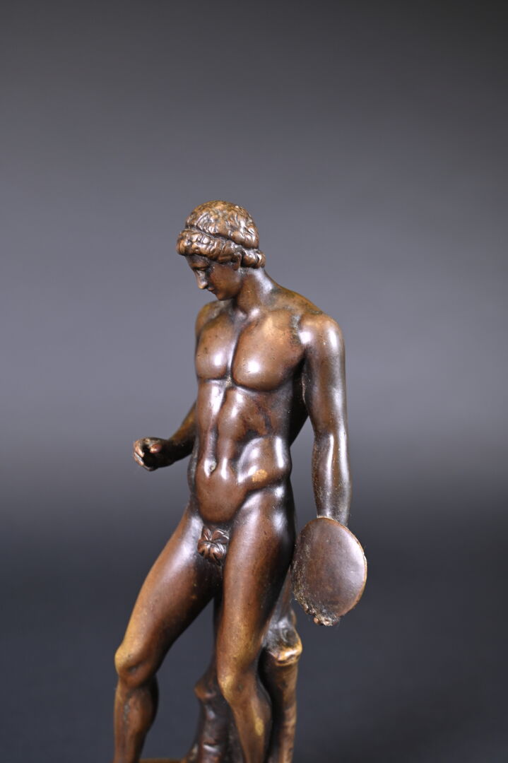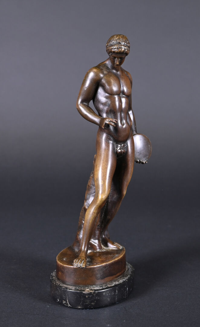 Bronze patiné brun reprenant le discophore de Naucydès. Socle de pierre dure noire. Haut. : 27,5 cm.