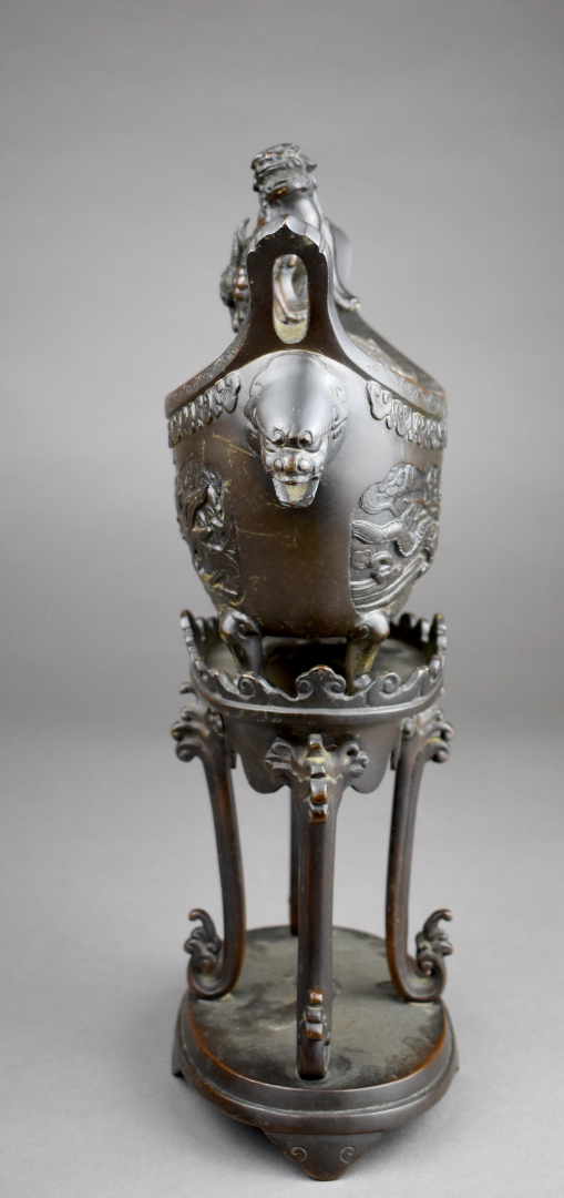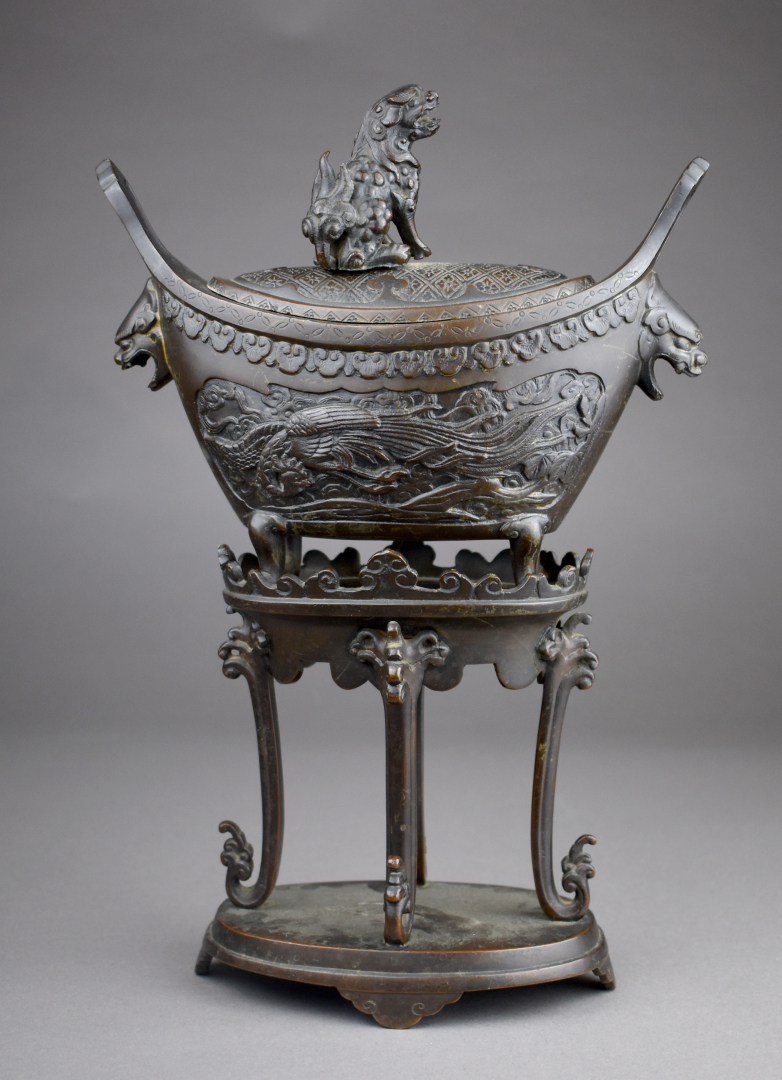 Brûle-parfum en bronze. Le couvercle à prise figurant un chien de phö, la panse ornée d’un phoenix. Piétement quadripode. Chine, XXe siècle. Haut. : 31 cm.