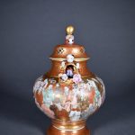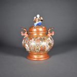 Brûle-parfum en porcelaine et pot couvert à décor de personnages en polychromie sur fond or (une restauration sur une prise et à l’intérieur du couvercle). Les anses formées de personnages acrobates. Satzuma, Japon vers 1900. Haut. : 28 cm.