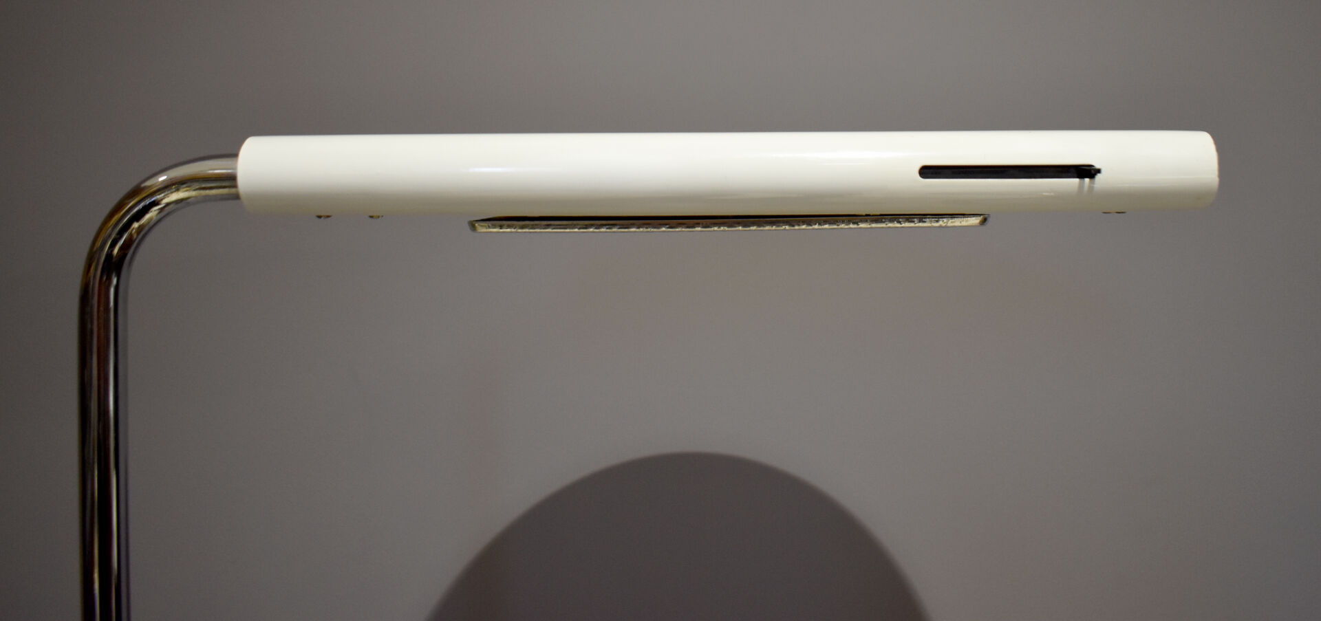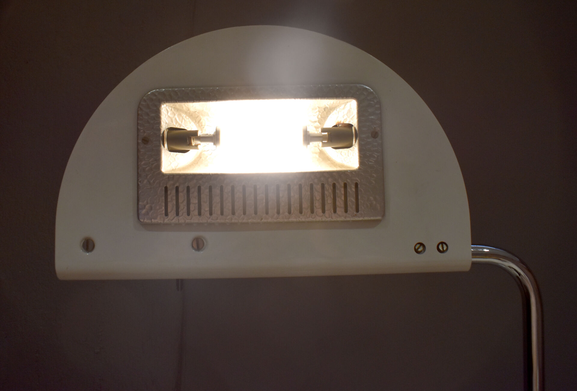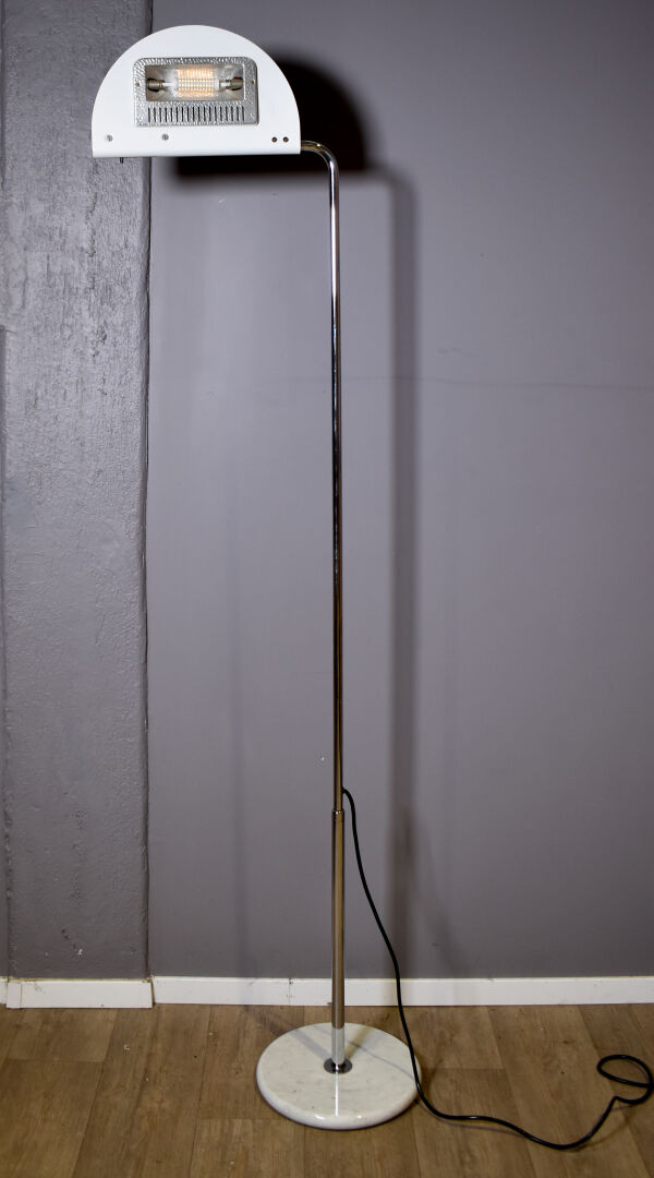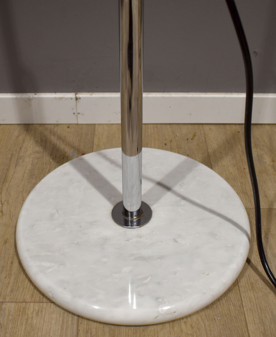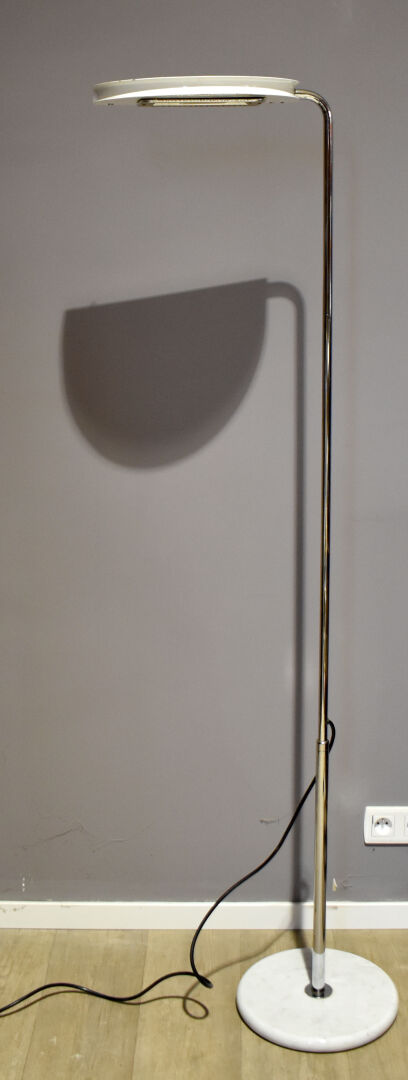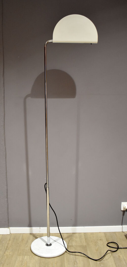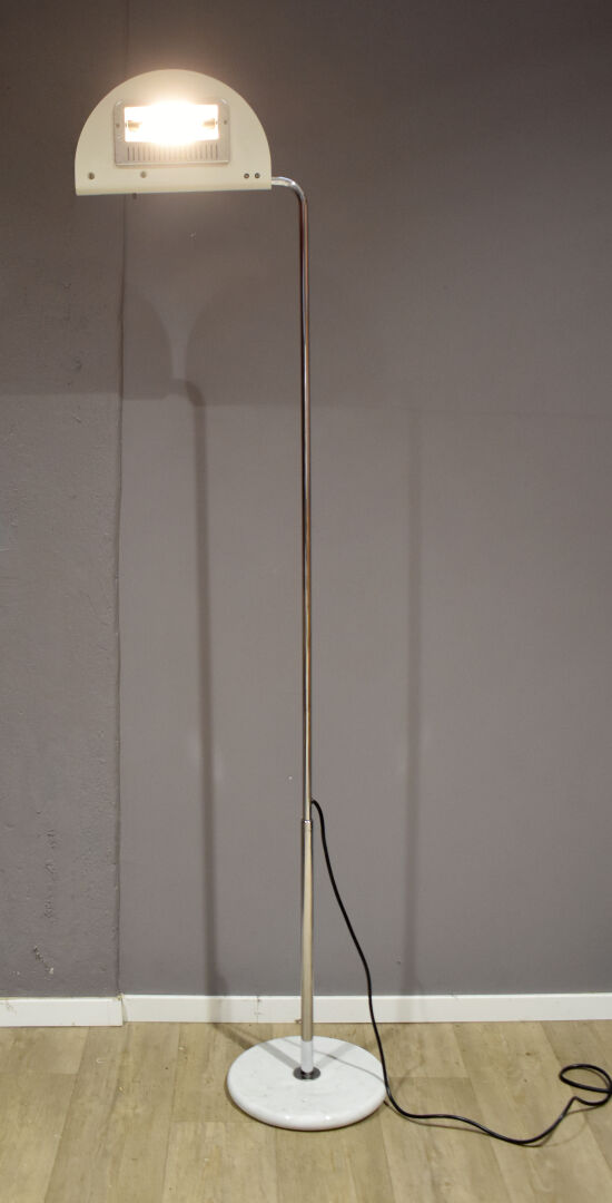 Bruno GECCHELIN (Né en 1939) SKIPPER éditeur. Lampadaire modèle « Mezza Luna » à réflecteur pivotant en tôle laquée crème,, le fût cylindrique en métal chromé à hauteur ajustable, base circulaire en marbre gris. Haut. maximale: 229 cm.