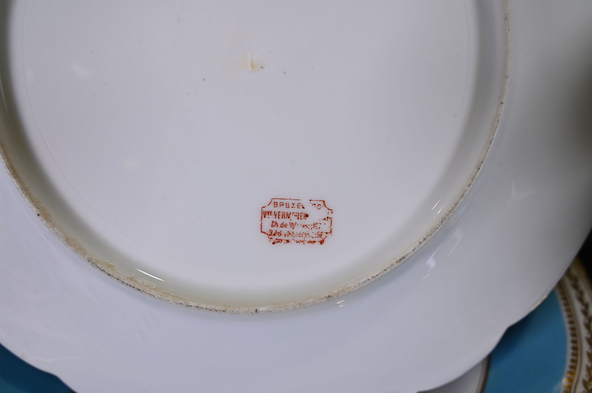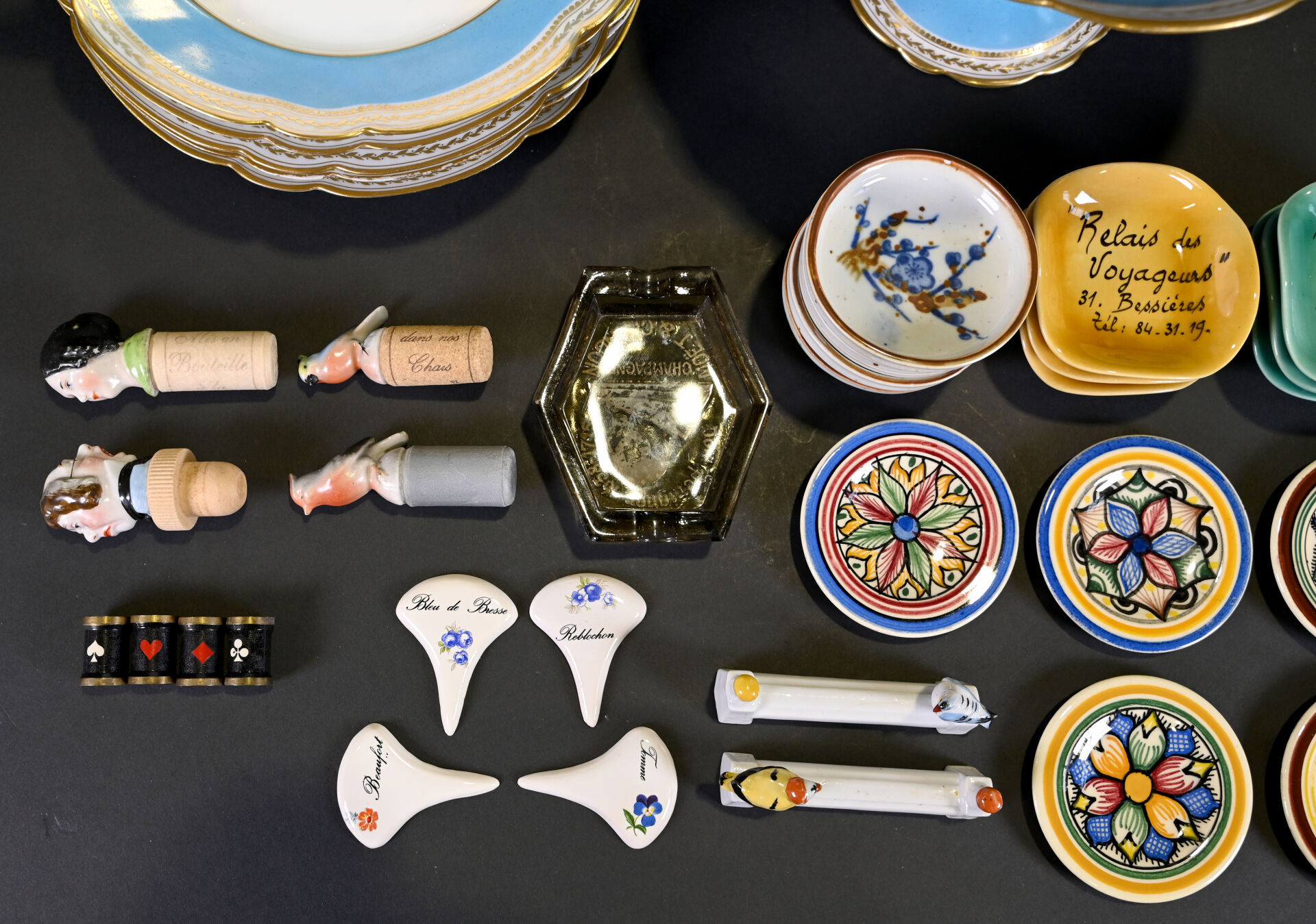 BRUXELLES VEUVE VERMEREN COCHE. Partie de service de table en porcelaine à bordure turquoise et or, le bassin chiffré comprenant 6 assiettes et deux compotiers. Marqués. On joint des bouchons à têtes en porcelaine, des vide-poches en faïence de Henriot Quimper et divers.