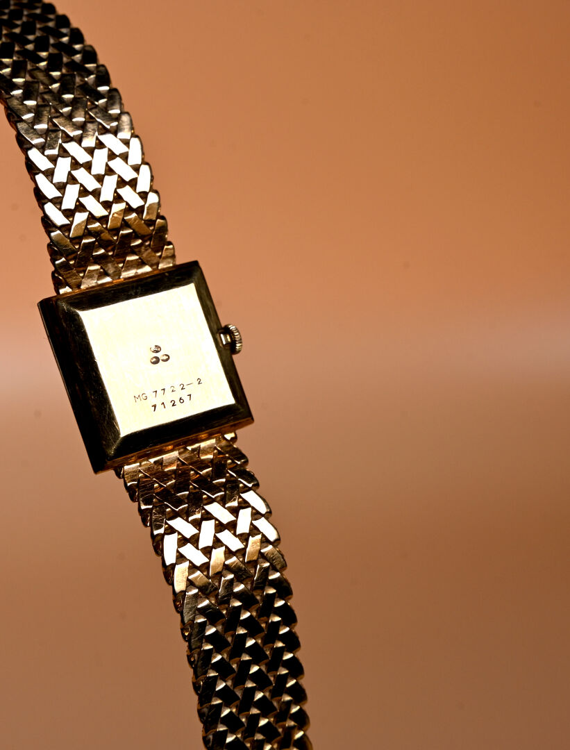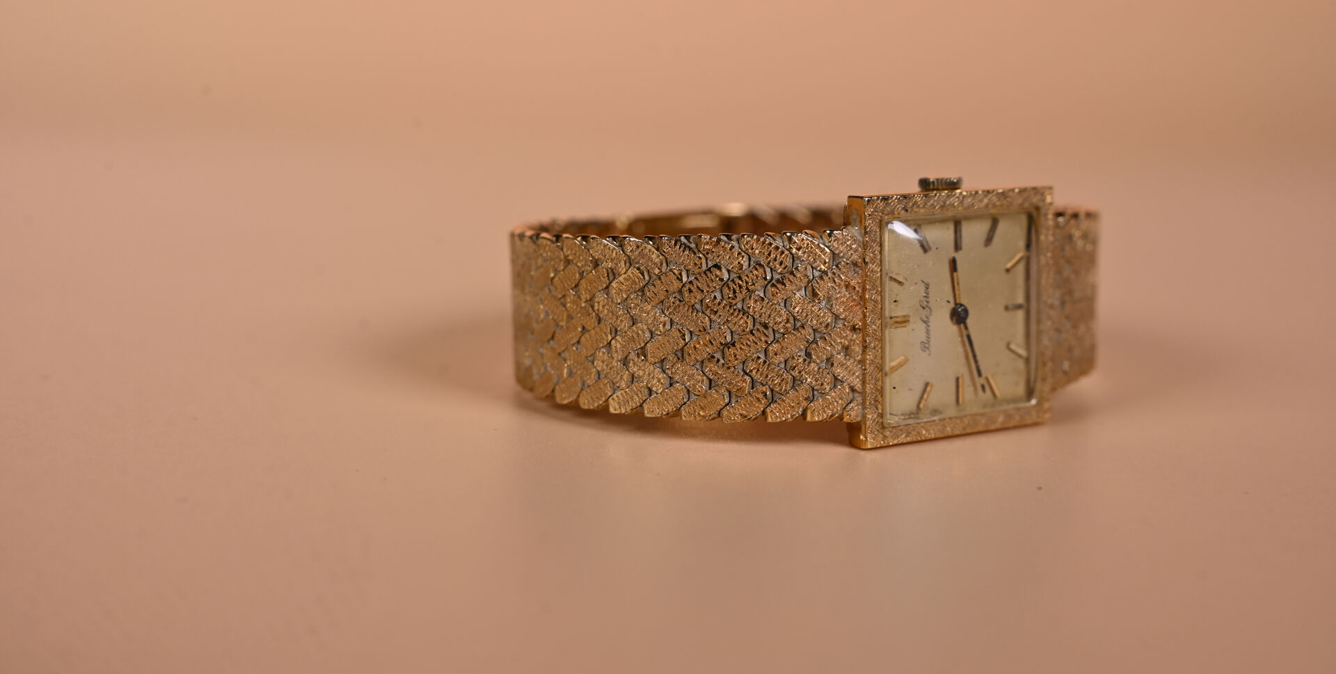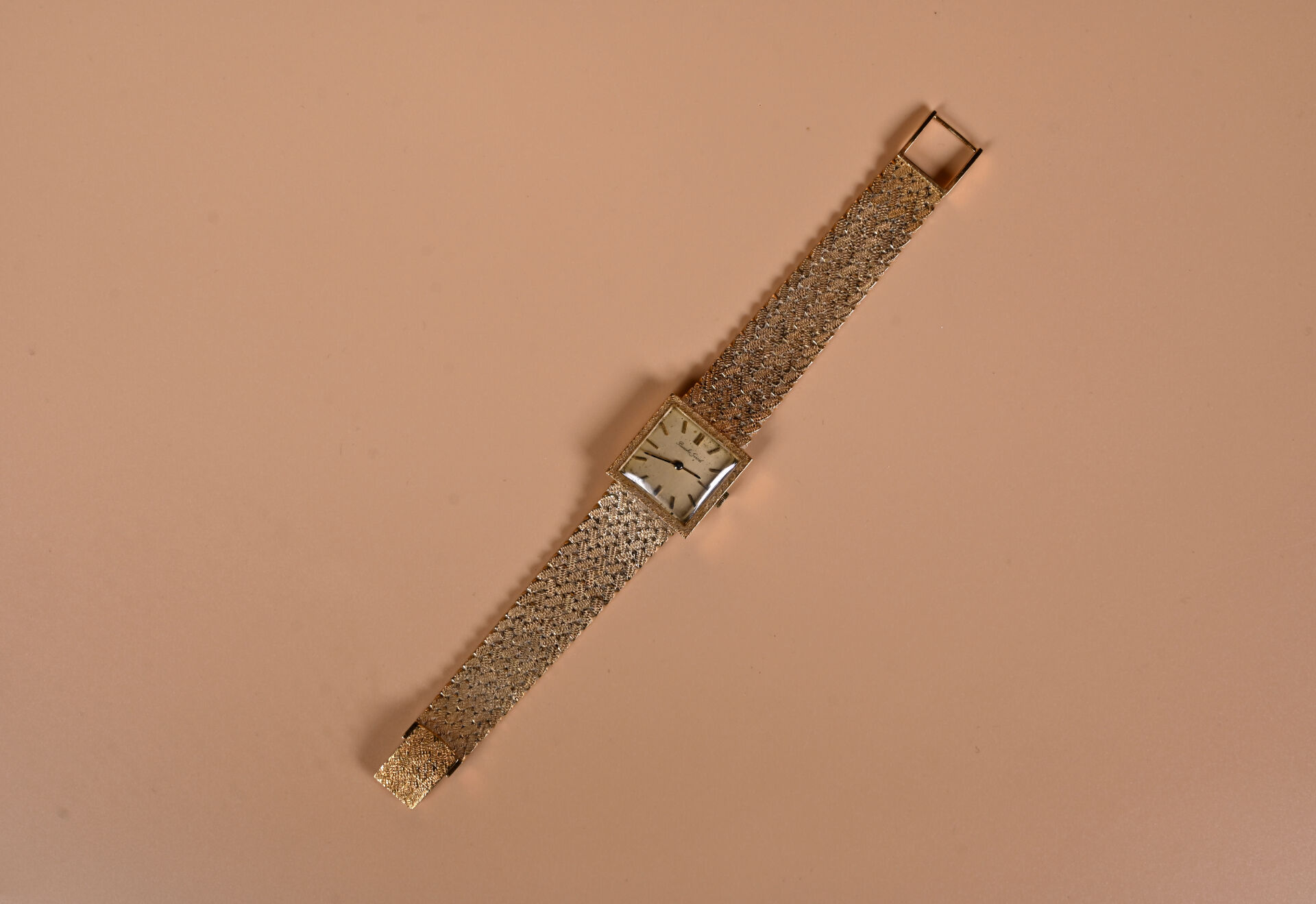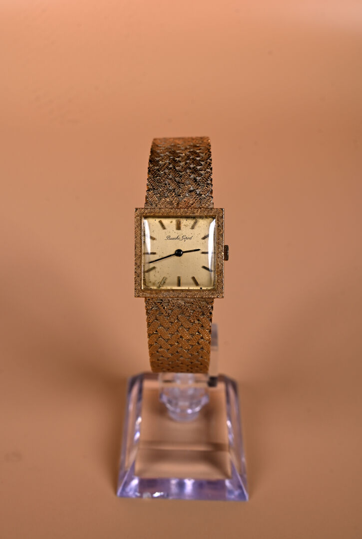 BUECHE-GIROD. Montre d’homme en or jaune 750 millièmes (18k). Cadran à fond crème avec index des heures bâtons dorés avec aiguilles en partie émaillées de noir. Mouvement mécanique à remontage manuel signé. Bracelet à maille tressée texturée. Longueur : 18 cm. Largeur : 1,5 cm. Boîtier : 22 mm. Poids brut : 64 g. Fonctionne ( manques à l’émail des aiguilles, cadran taché en bordure).