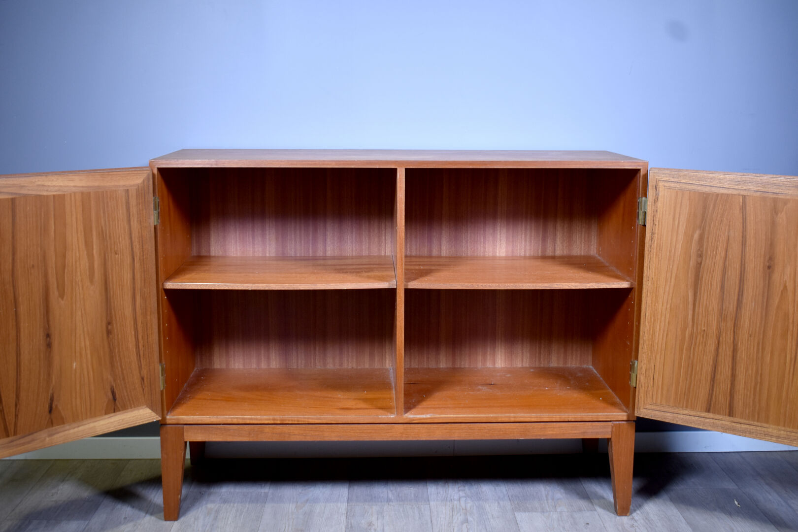 Buffet en aggloméré plaqué de bois exotique ouvrant à deux portes (mouillures, usures d’usage) . Vers1950