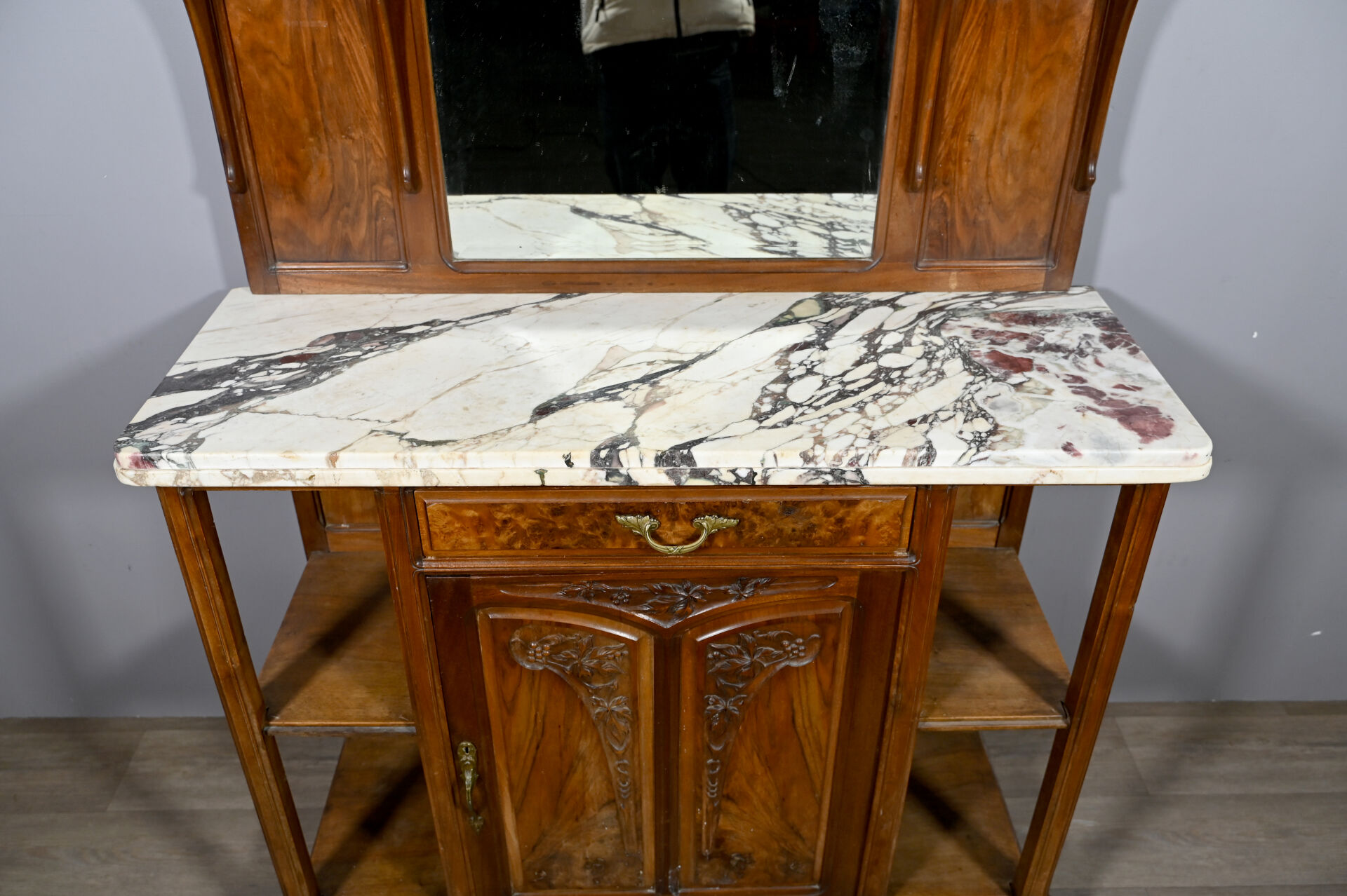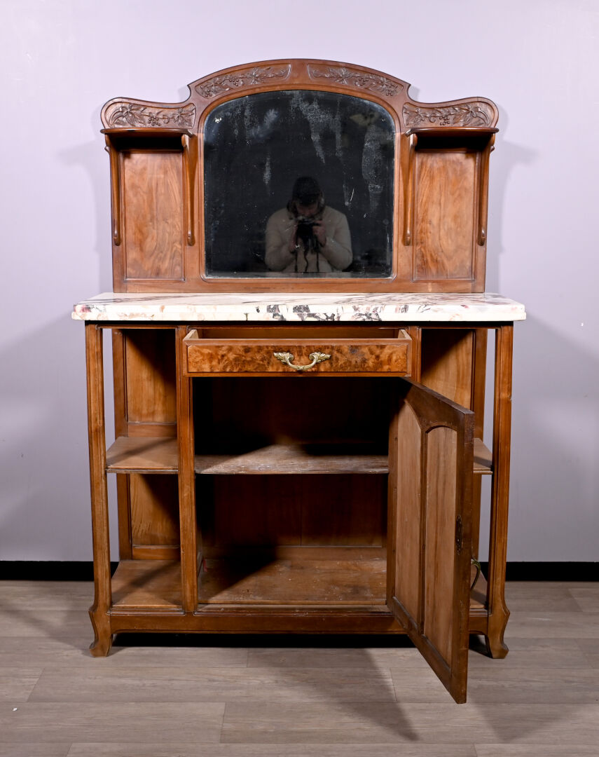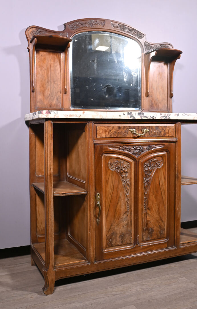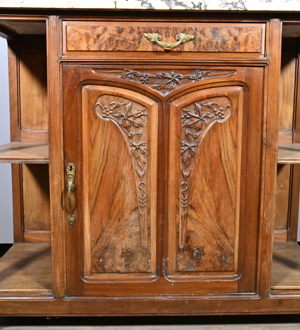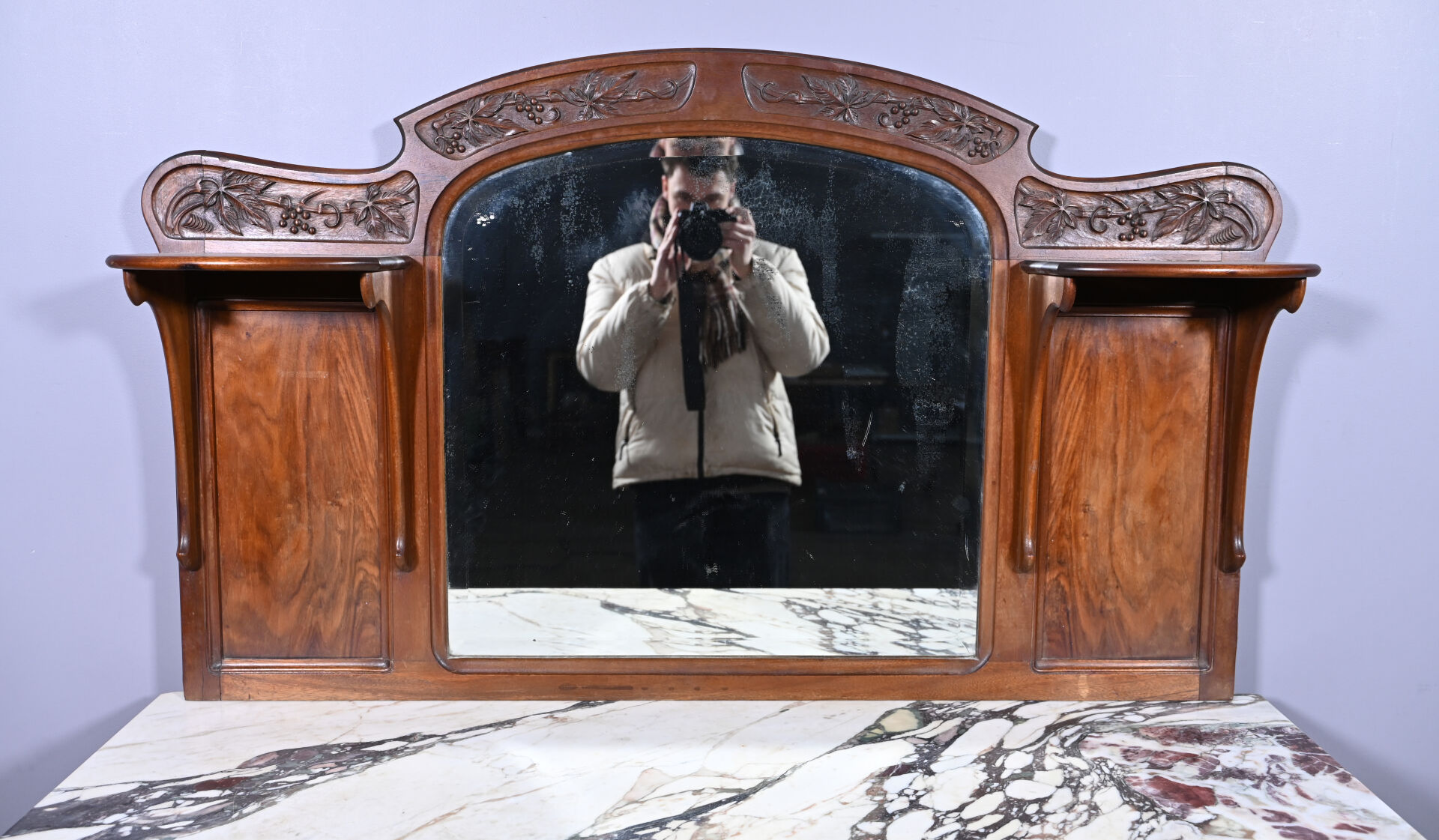 Buffet ou meuble de toilette en acajou, noyer sculpté et bois de placage (usures et soulèvements). La partie haute à deux étagères et glace biseautée, le plateau double en marbre blanc veiné mauve, la partie basse ouvrant à un tiroir et un ventail. Décor sculpté d’Ampélopsis. Epoque Art Nouveau. Haut. : 175 cm – Larg. : 126 cm – Prof. : 45 cm.