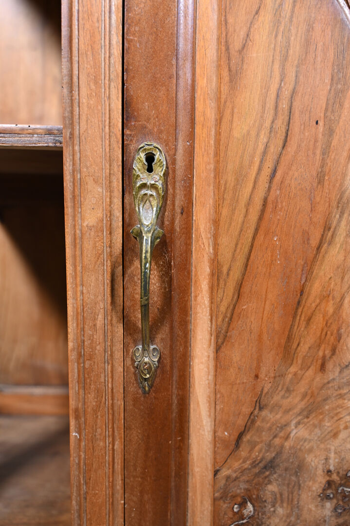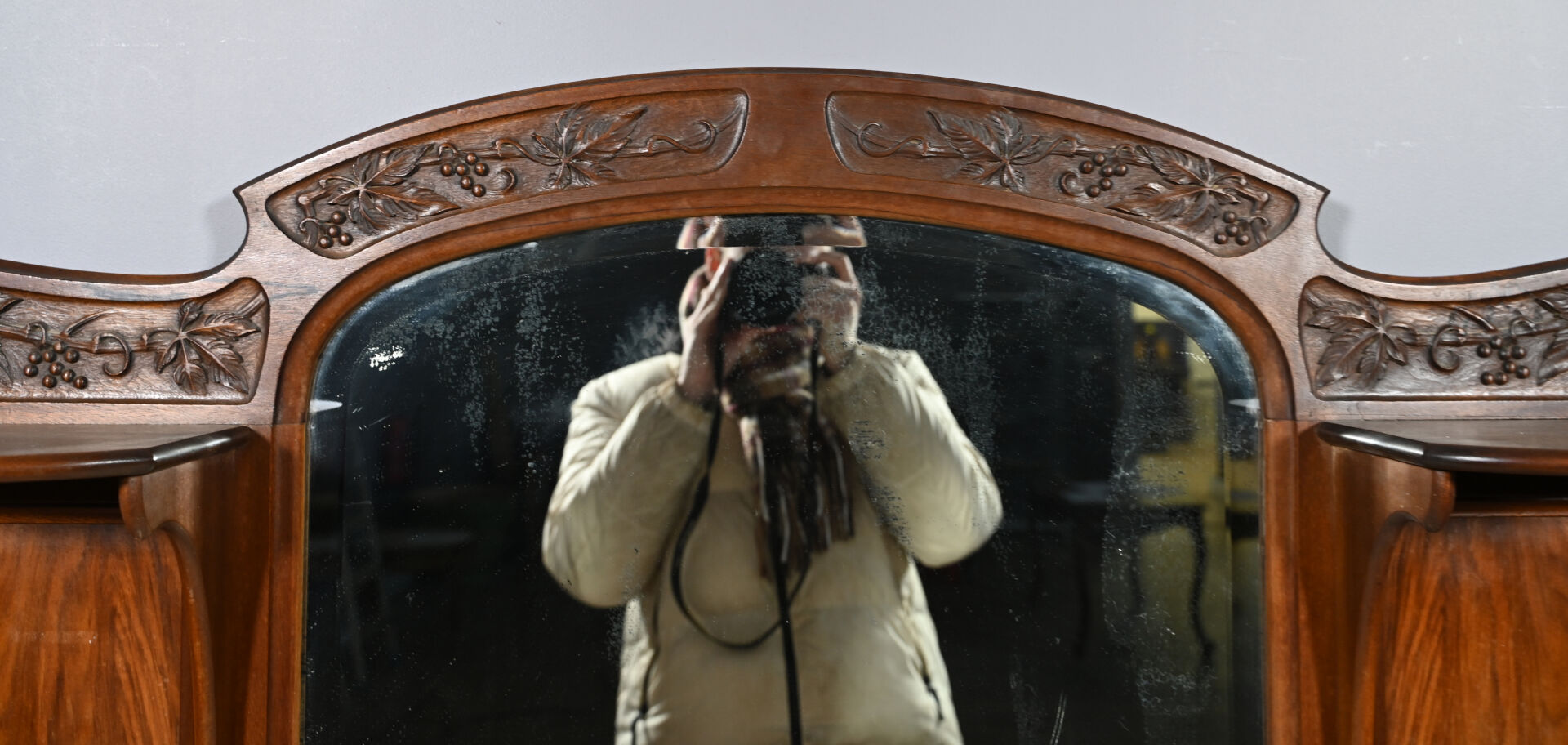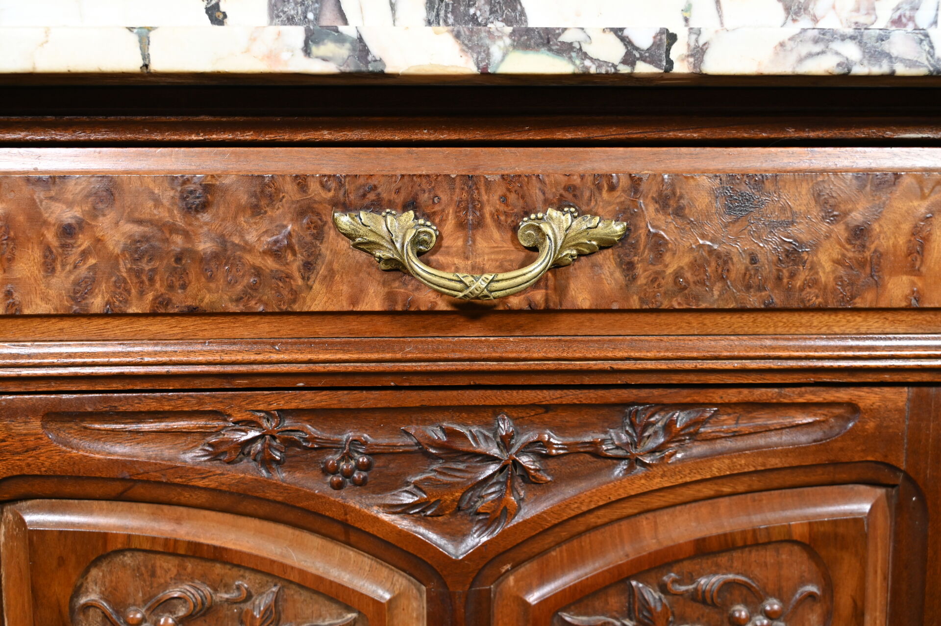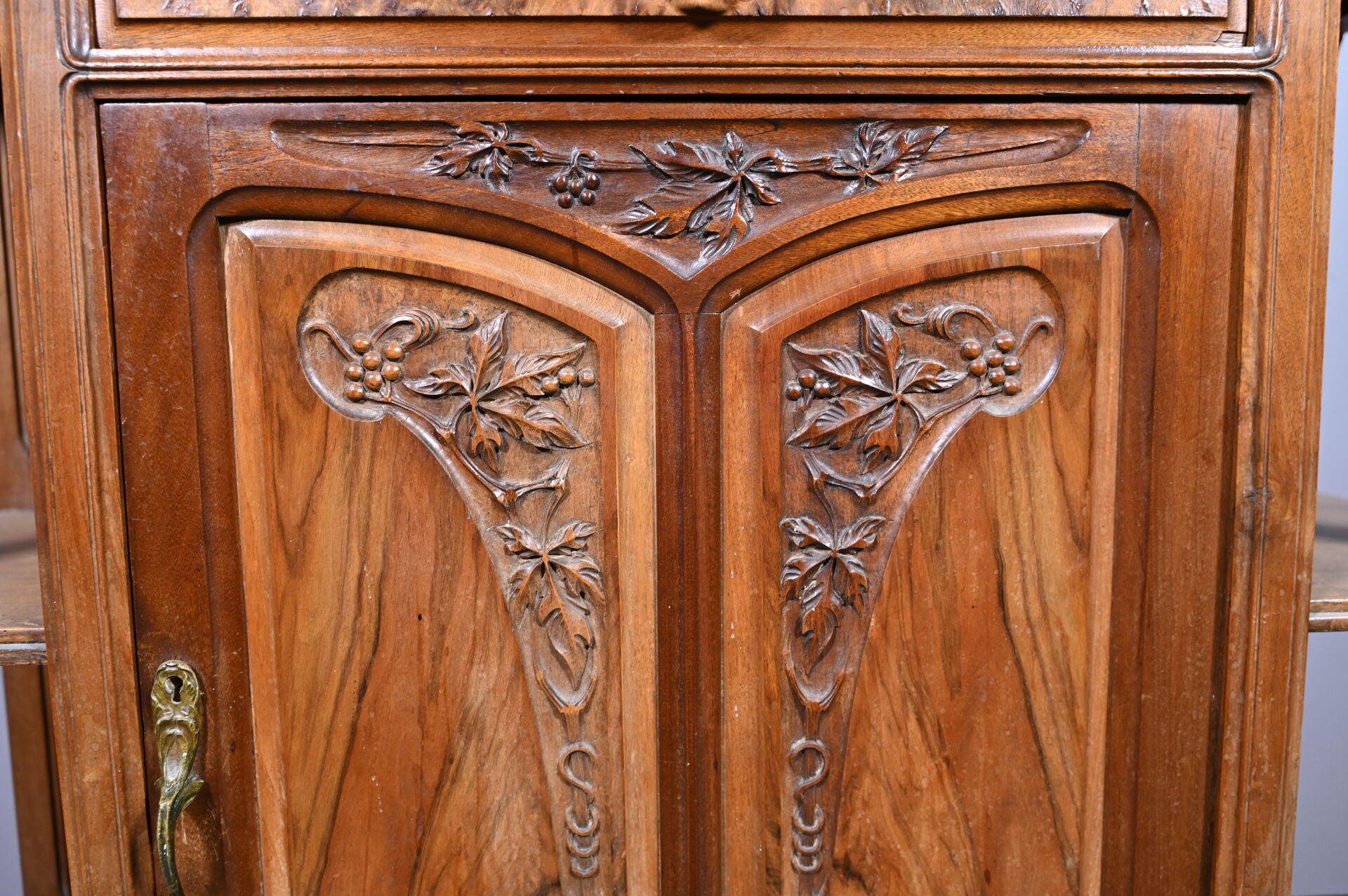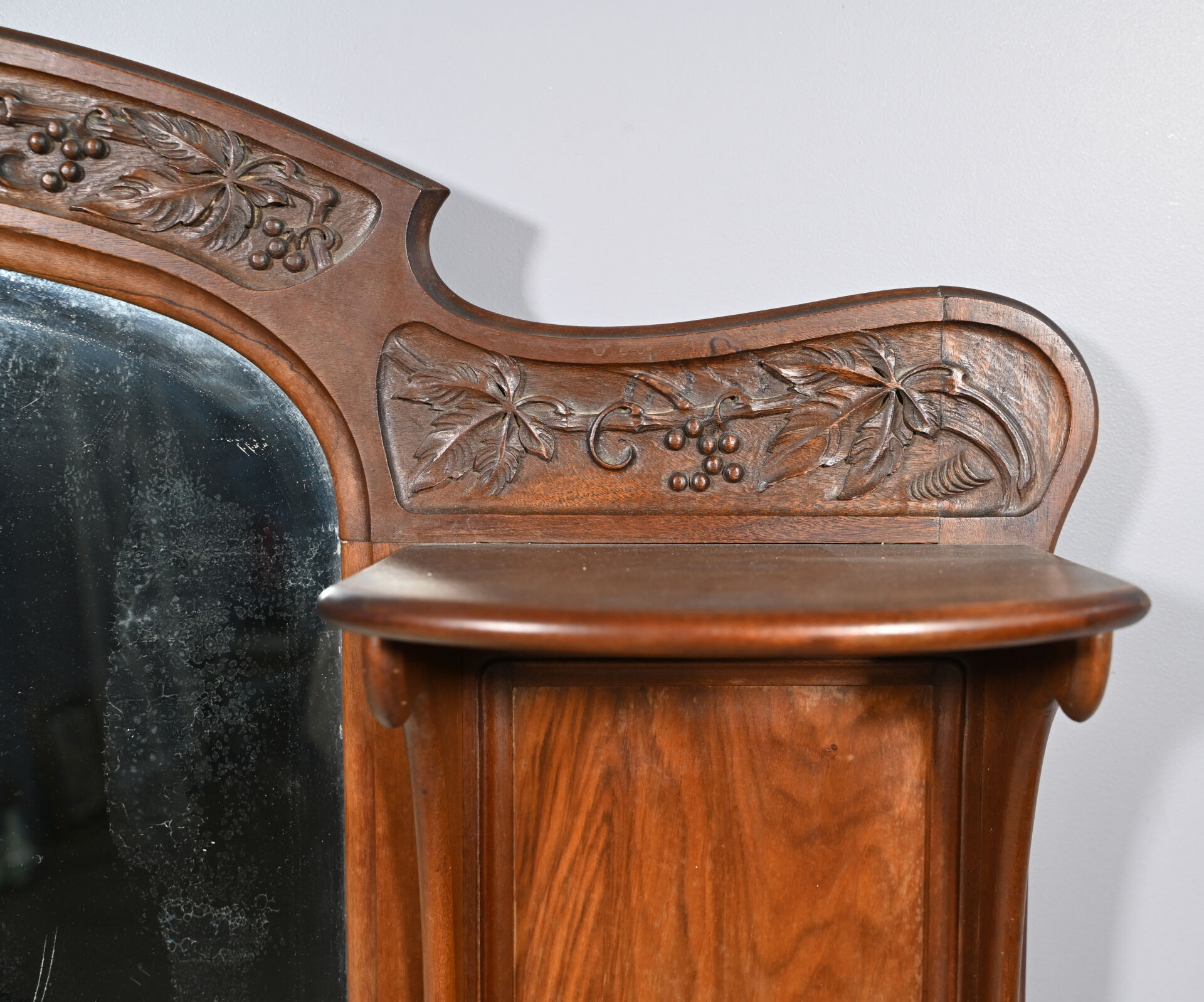 Buffet ou meuble de toilette en acajou, noyer sculpté et bois de placage (usures et soulèvements). La partie haute à deux étagères et glace biseautée, le plateau double en marbre blanc veiné mauve, la partie basse ouvrant à un tiroir et un ventail. Décor sculpté d’Ampélopsis. Epoque Art Nouveau. Haut. : 175 cm – Larg. : 126 cm – Prof. : 45 cm.