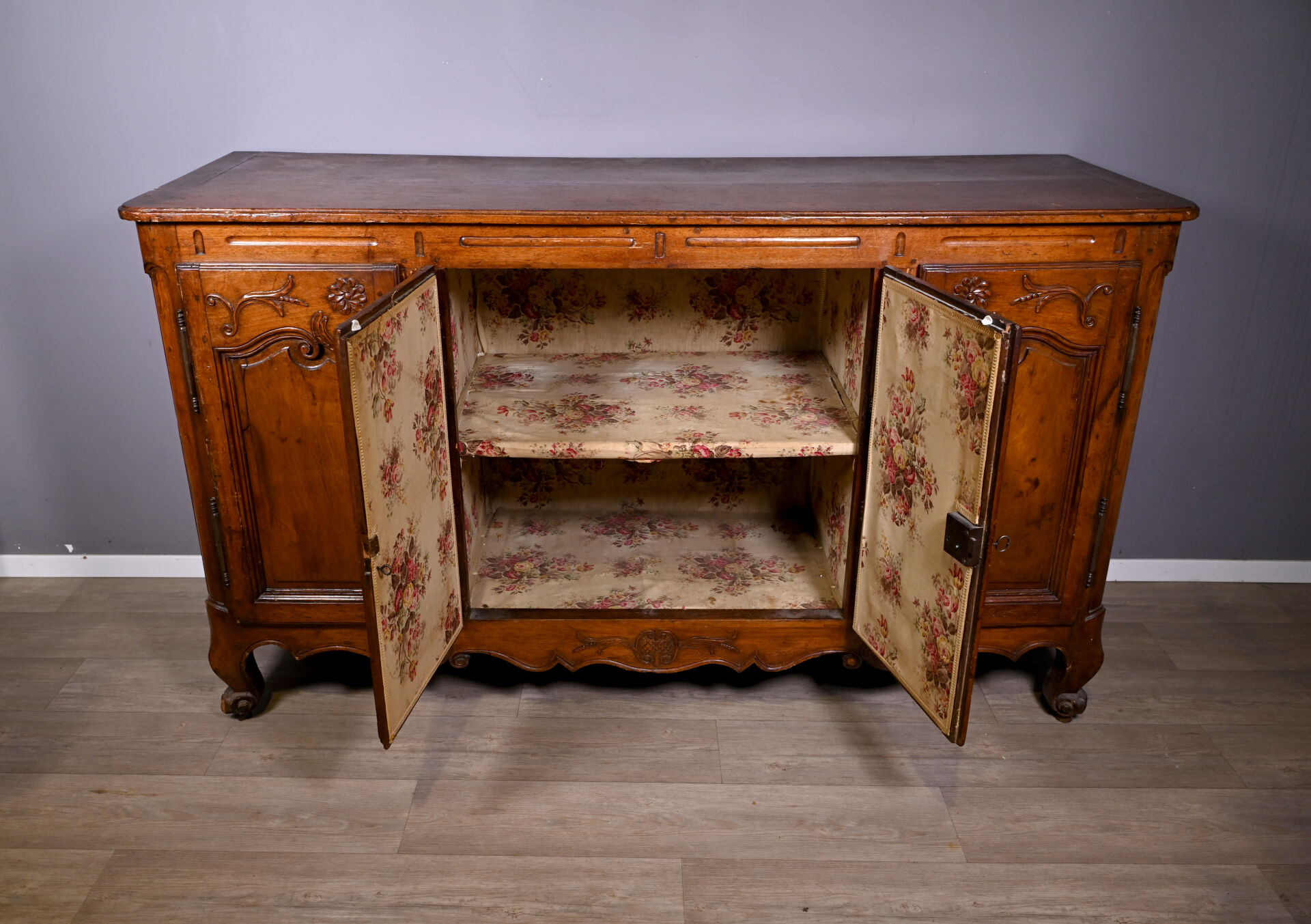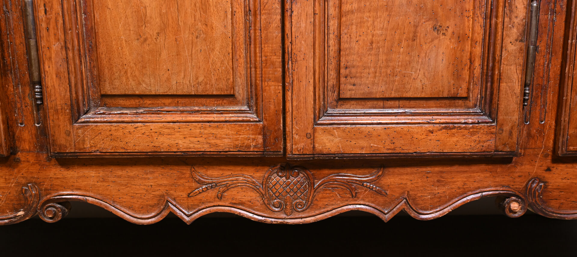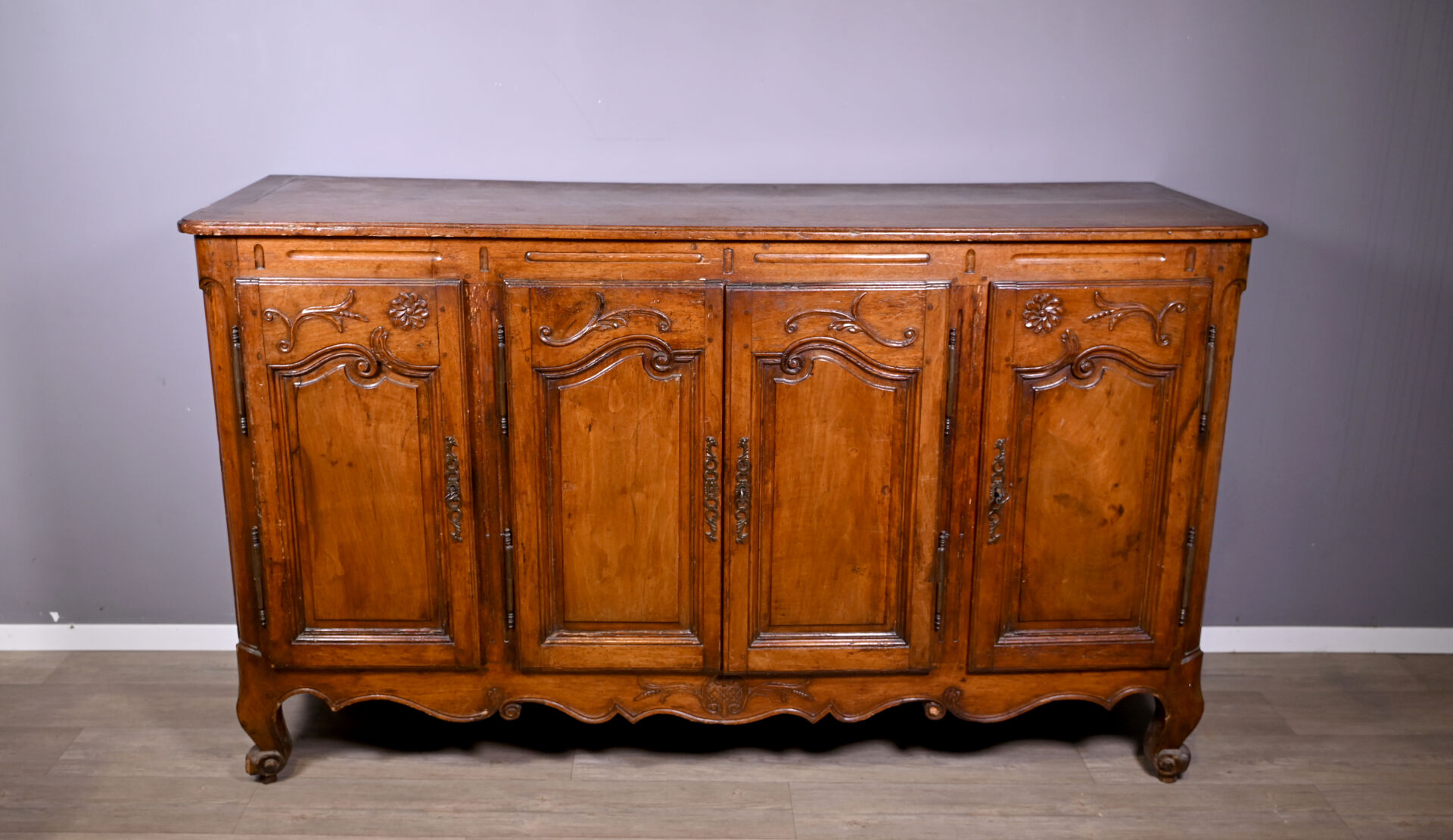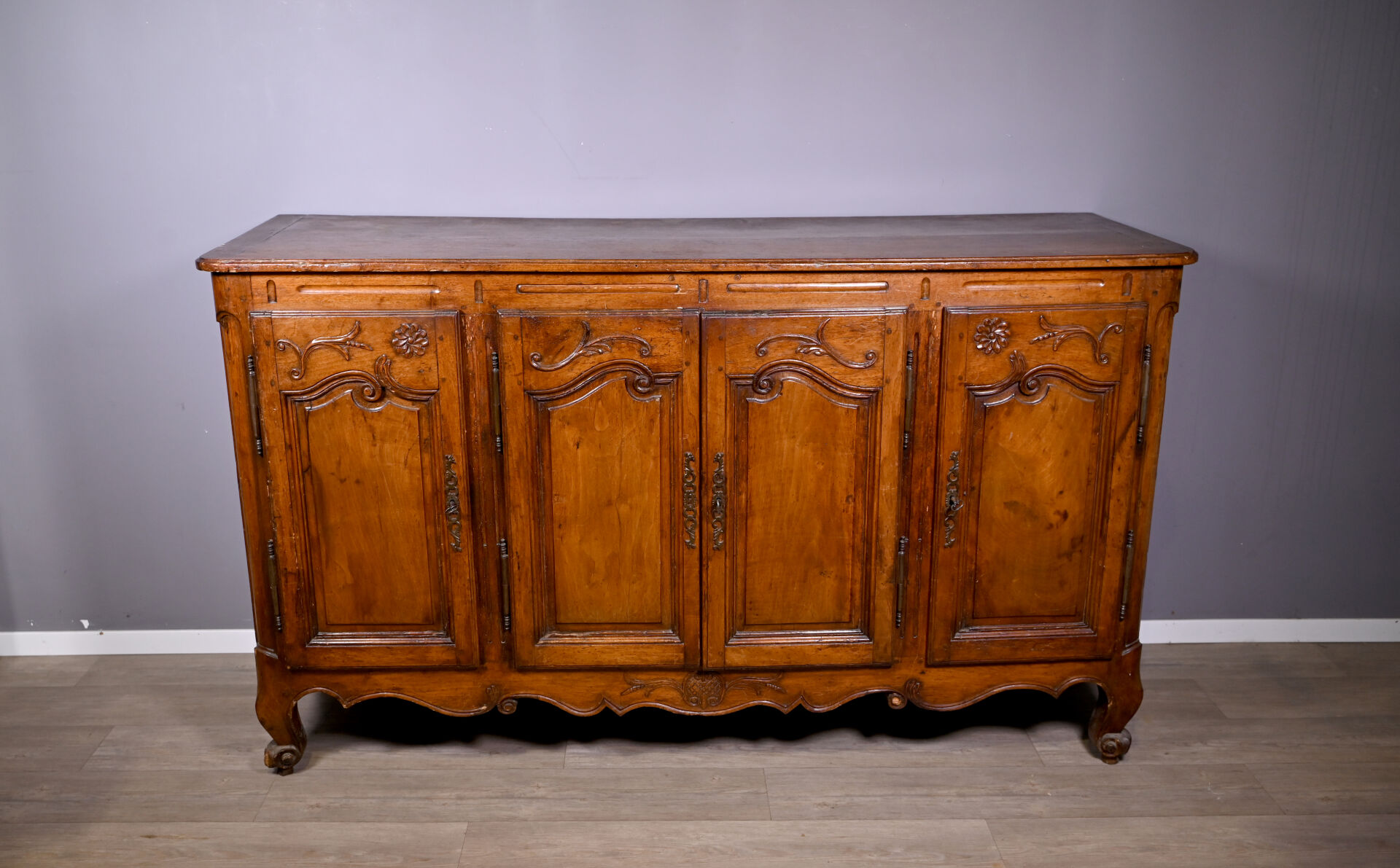 Buffet rustique en noyer mouluré sculpté. Il ouvre à quatre vantaux et repose sur quatre pieds, les antérieurs cambrés terminés par des enroulements, les postérieurs droits portes (usures d’usage, manques, restaurations). Epoque Louis XV. Haut. : 106,5 cm – Larg. : 184 cm – Prof. : 65,5 cm.