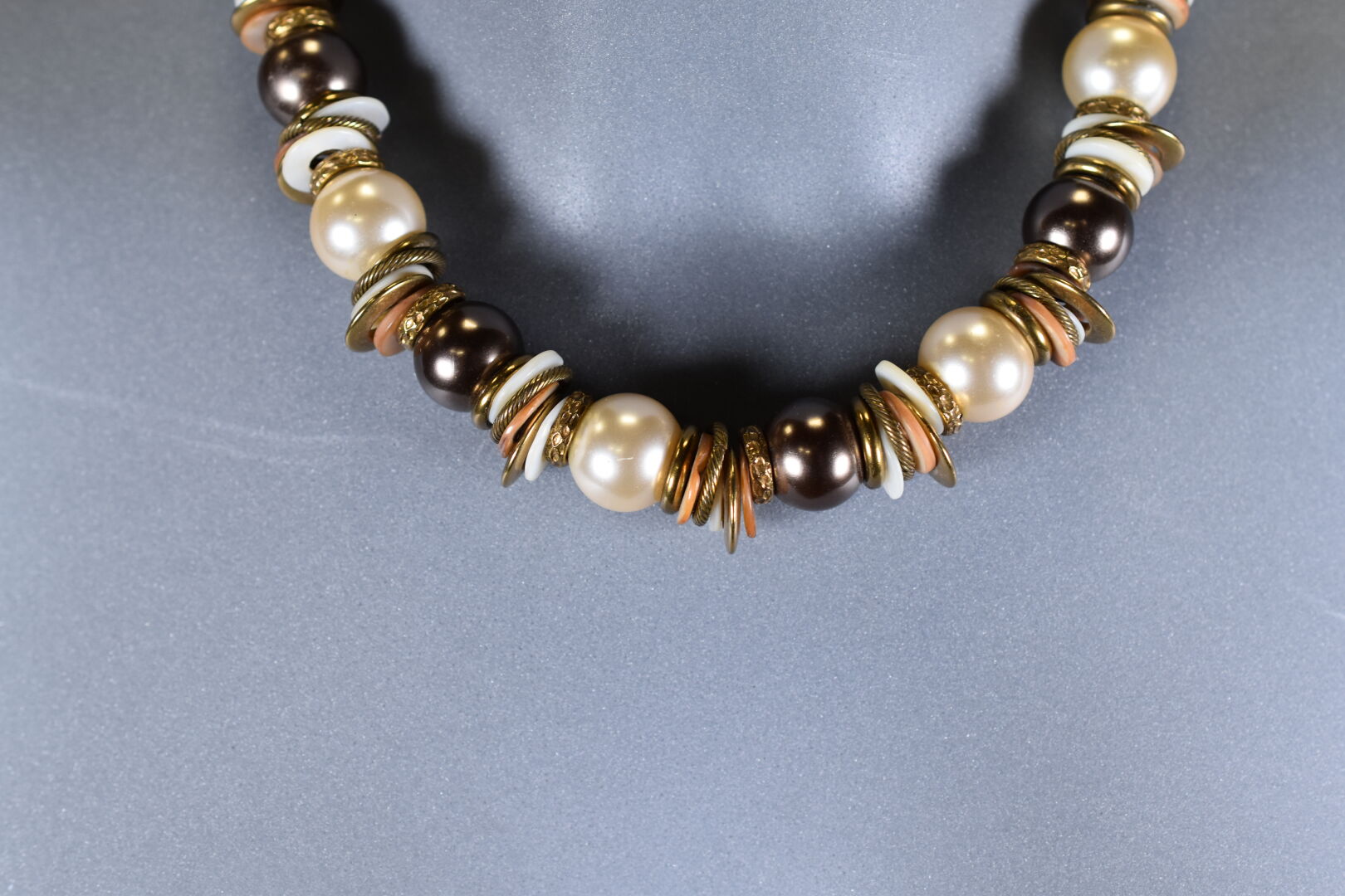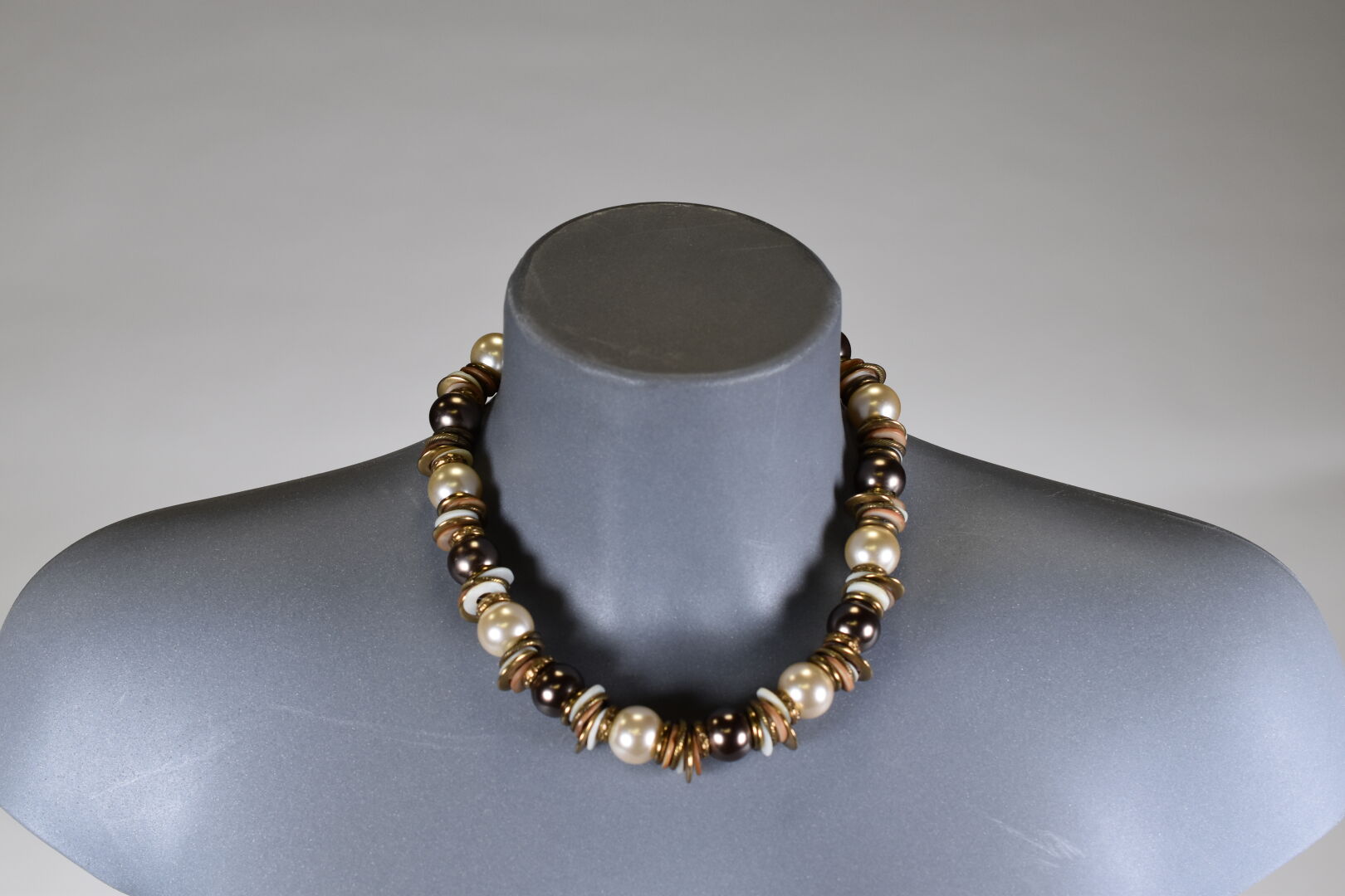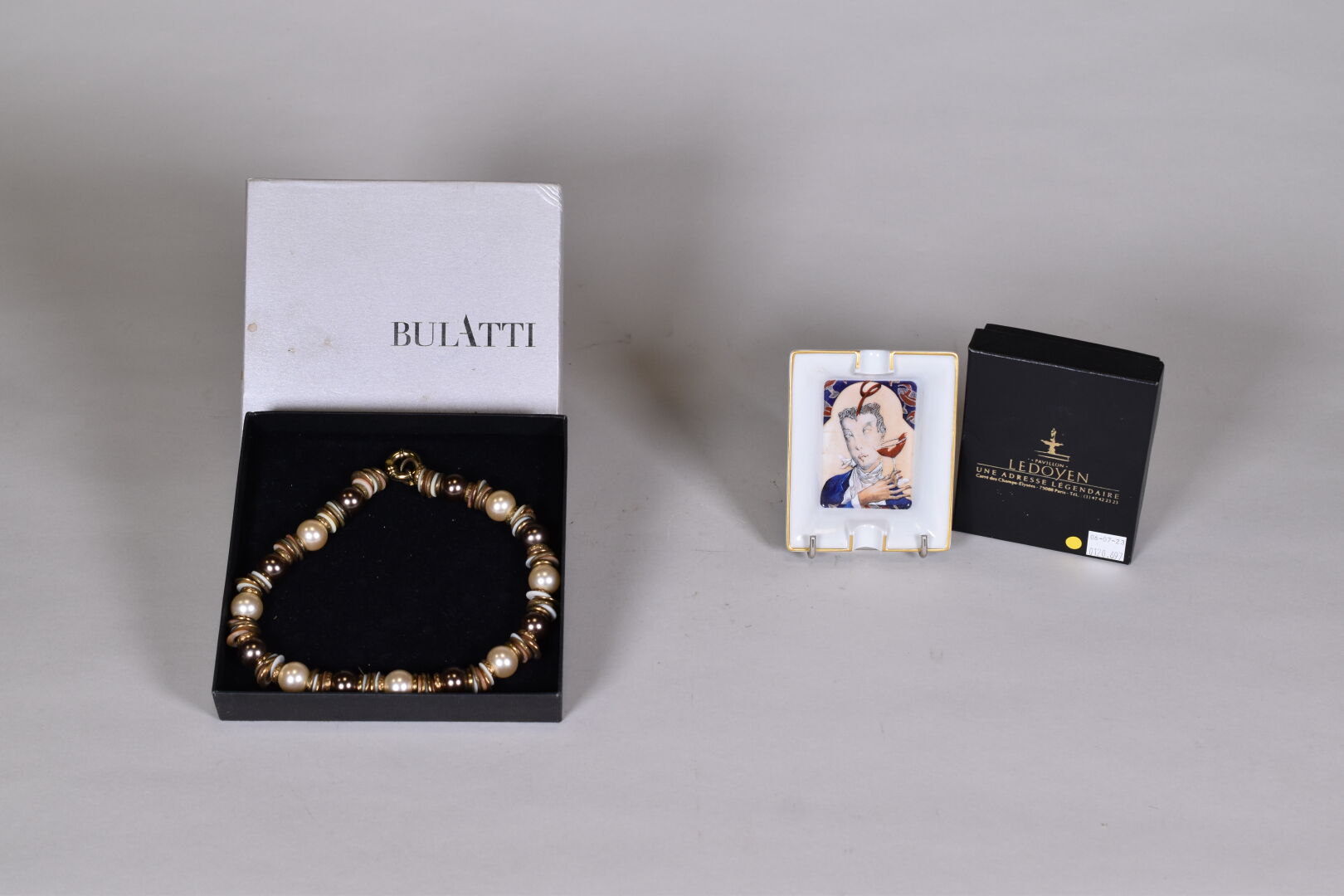 BULATI. Collier fantaisie en métal et plastique. Boite. On joint un cendrier en porcelaine « Pavillon LEDOYEN » décor par JP CEYTAIRE. Boite.
