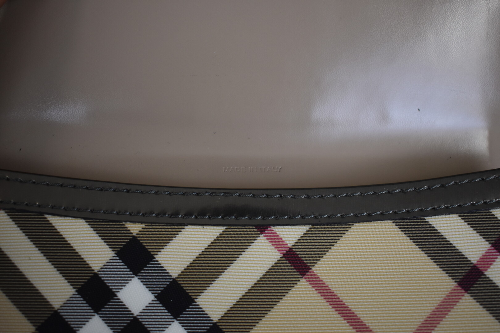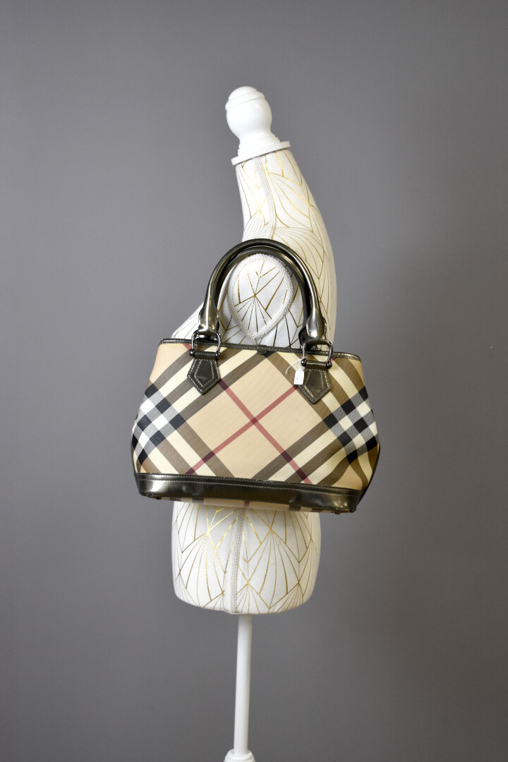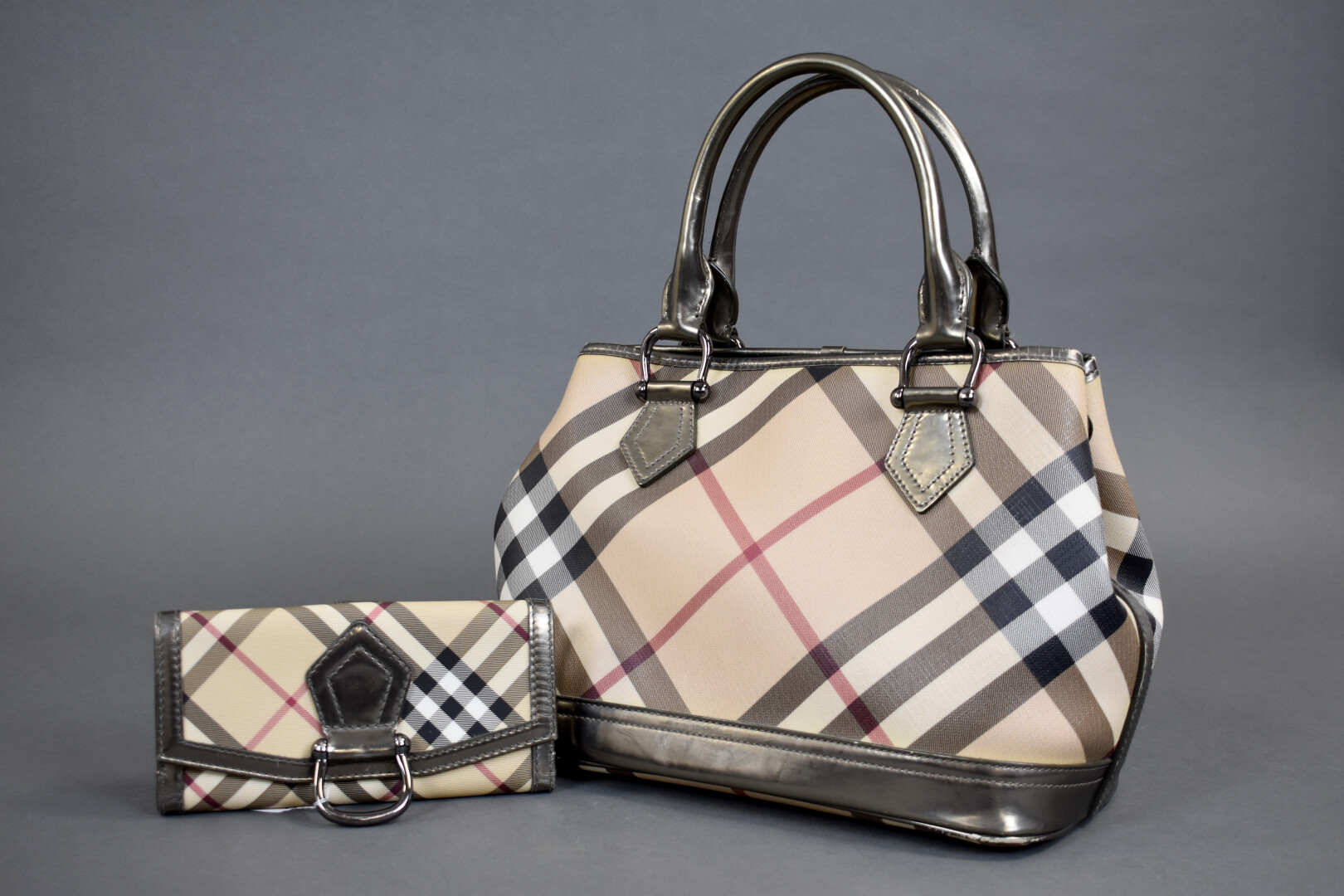 BURBERRY. Sac à main et portefeuille en toile enduite imprimée tartan beige et skaï argenté (quelques usures). Dim. sac : Haut. : 23 cm – Larg. : 30 cm – Prof. : 16 cm