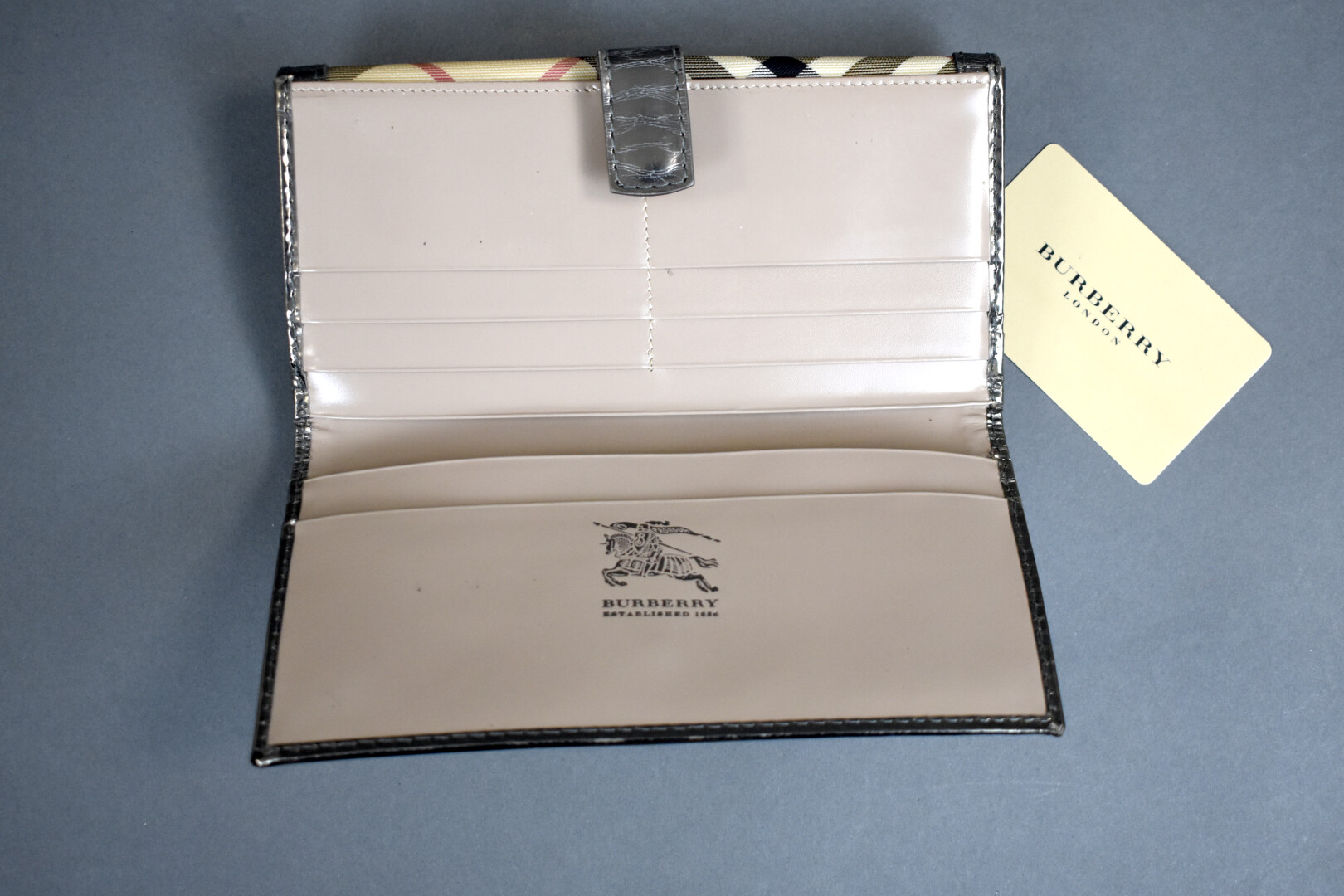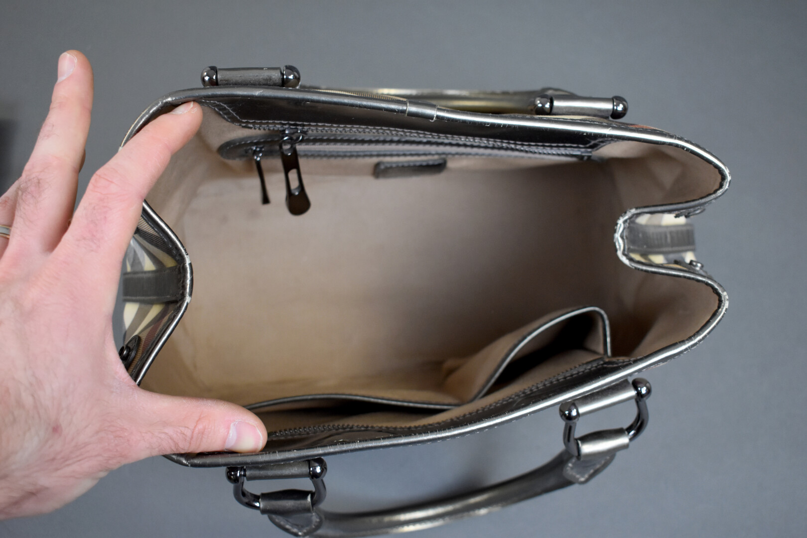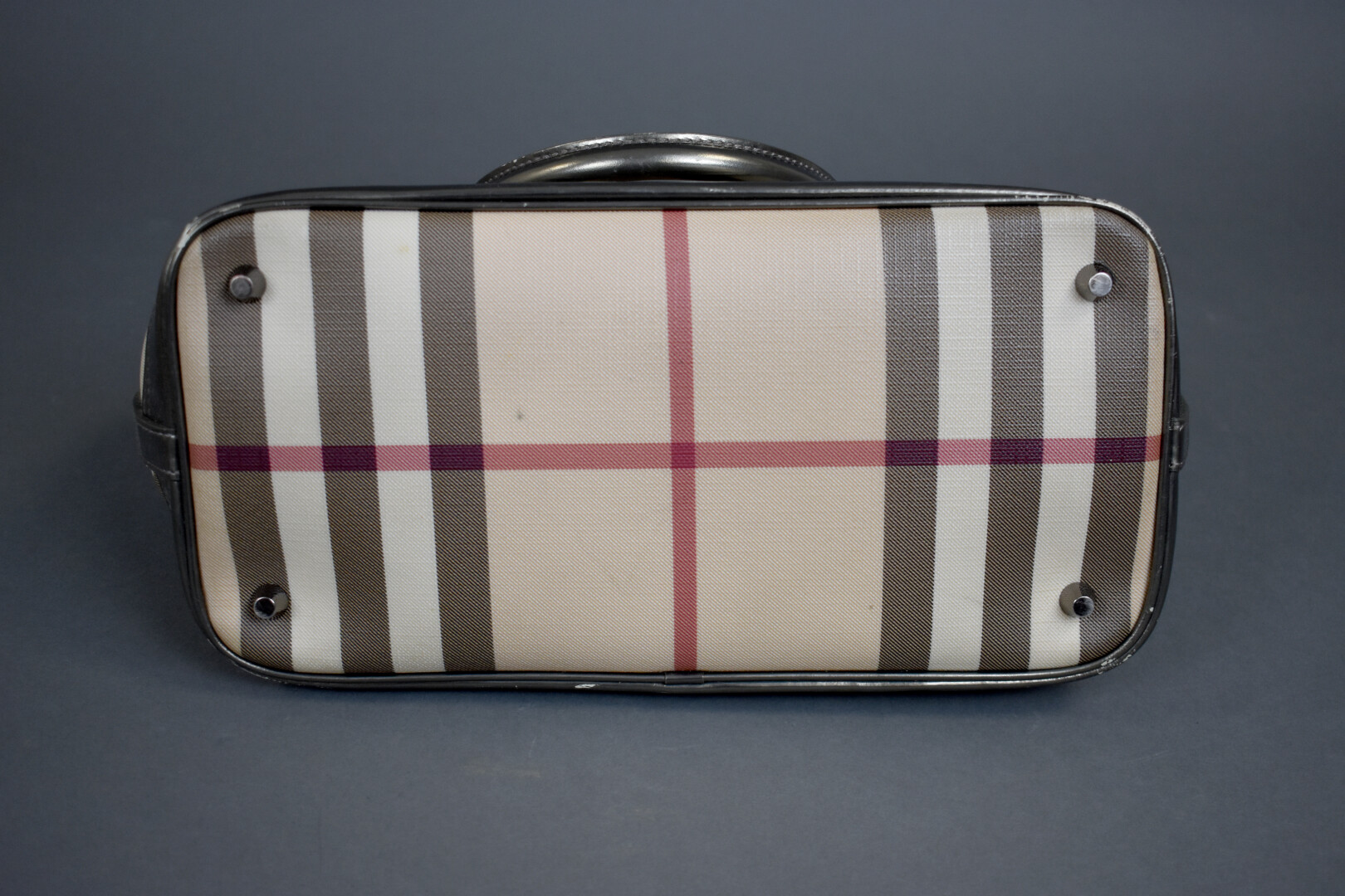 BURBERRY. Sac à main et portefeuille en toile enduite imprimée tartan beige et skaï argenté (quelques usures). Dim. sac : Haut. : 23 cm – Larg. : 30 cm – Prof. : 16 cm