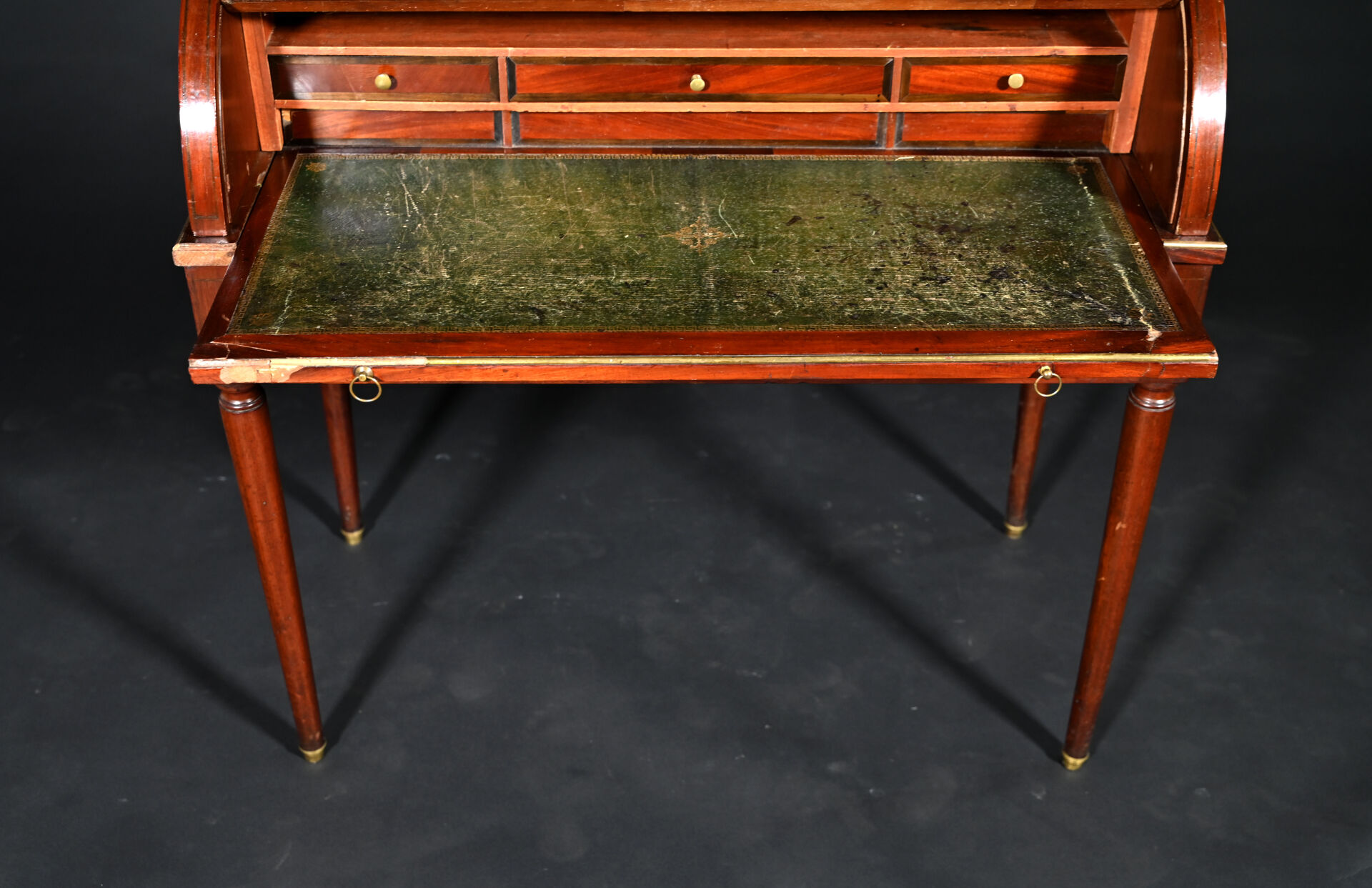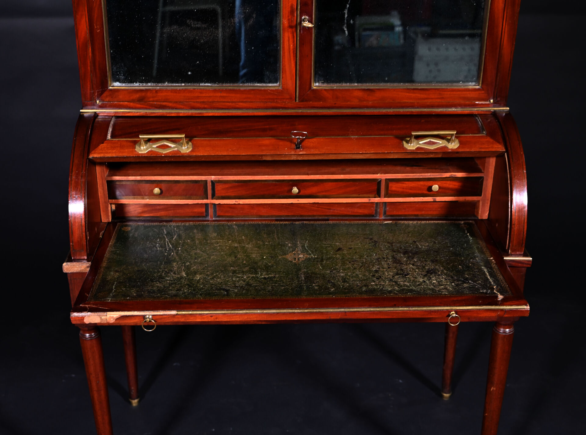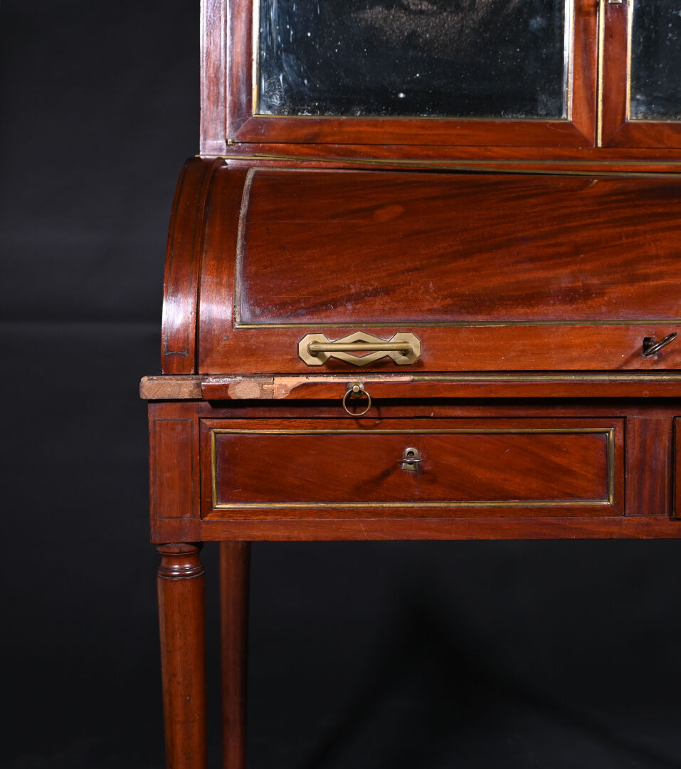 Bureau à cylindre à guillotine en acajou et placage d’acajou mouluré, ouvrant par deux tiroirs en ceinture, un cylindre découvrant trois tiroirs et un casier et deux vantaux foncés de glace en partie haute, il repose sur quatre pieds fuselés et est coiffé d’un plateau de marbre blanc veiné gris ceinturé d’une galerie à jour. Baguettes d’encadrement et poignées de tirage en laiton.