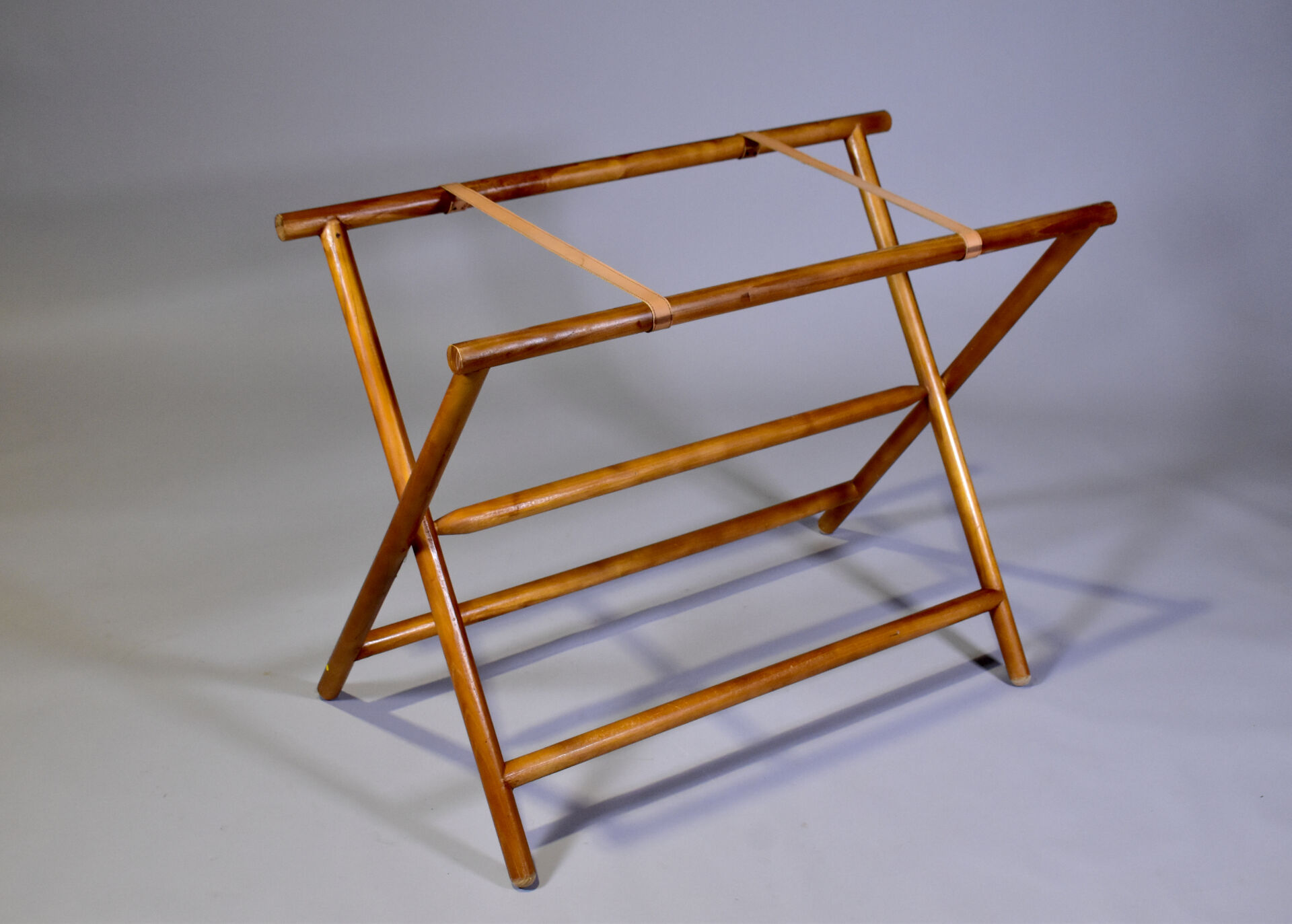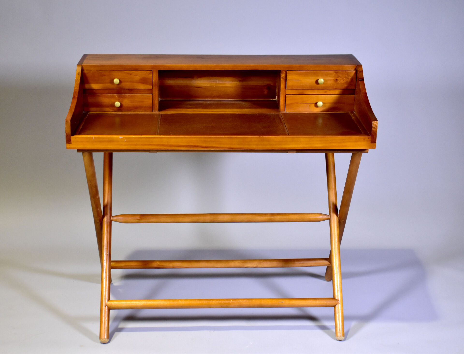 Bureau à piètement pliable en bois exotique. Il ouvre à quatre tiroirs et une niche. Plateau garni de skaï fauve (taches). Haut. : 96 cm – Larg. : 102,5 cm – Prof. : 54 cm.