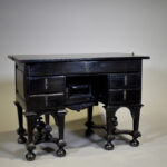 Bureau de changeur en bois mouluré et noirci (accidents et réparations), ouvrant par quatre tiroirs encadrant un guichet, le plateau brisé découvrant trois tiroirs. Il repose sur huit pieds en gaine réunis quatre par quatre par des entretoises en X à balustre central. Epoque Louis XIV. Haut. : 76 cm – Larg. : 105 cm – Prof. : 57 cm.