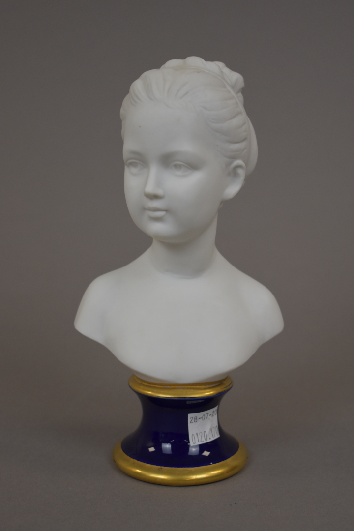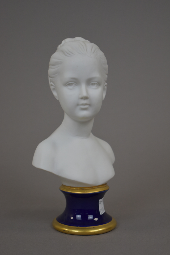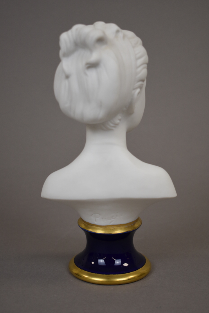 Buste de jeune fille en biscuit d’après Pucci sur piédouche bleu et or. XXe siècle.Haut. : 21 cm.
