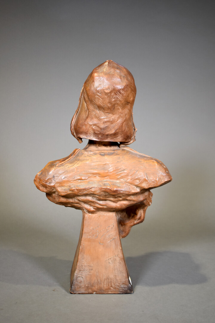 Buste de paysane en terre cuite (éclats et manques). Signée au dos avec cachets « Fabrication Française ». Dans le goût de Goldsheider. Haut. : 55 cm.