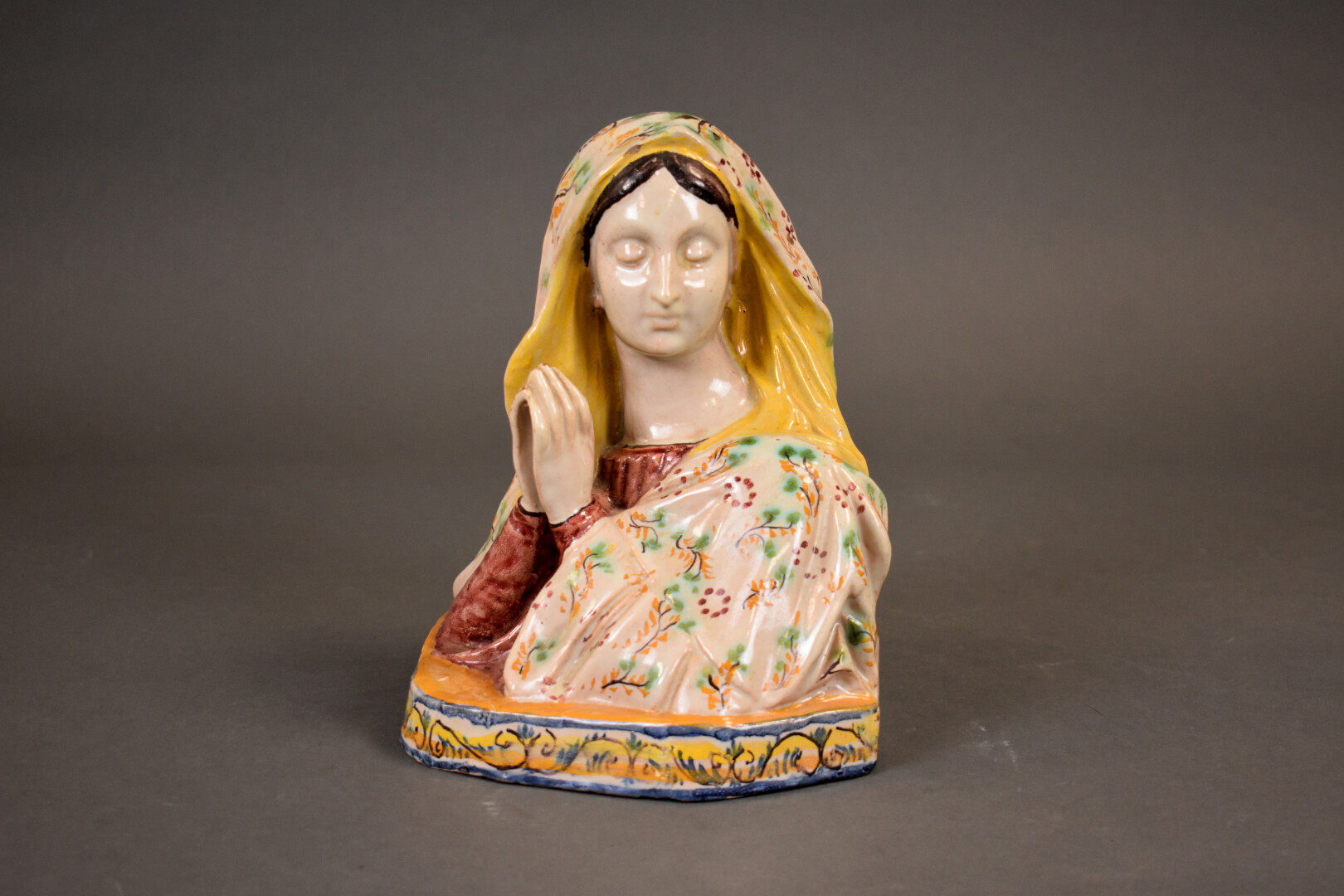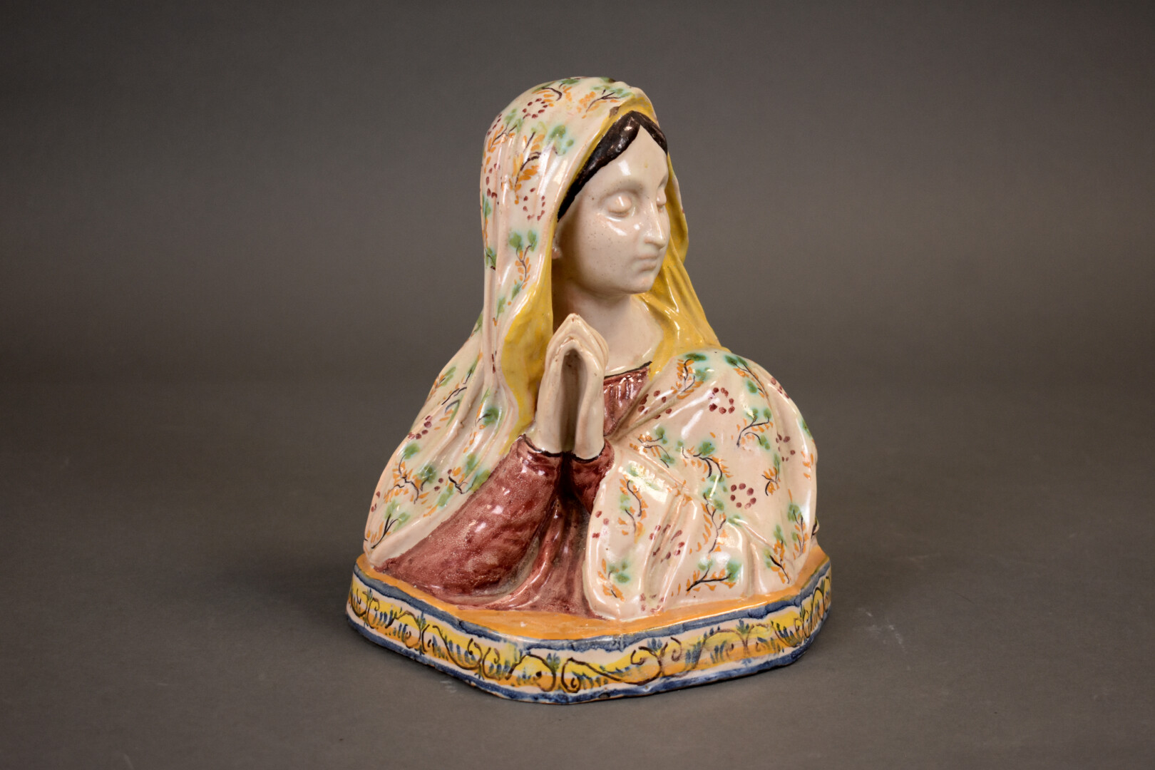 Buste de vierge en prière en faïence émaillée en polychomie. Travail dans le goût d’Angelo MINGHETTI (1822 – 1885), XXe siècle. Haut. : 23,5 cm.