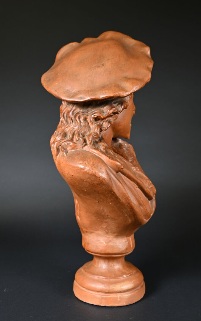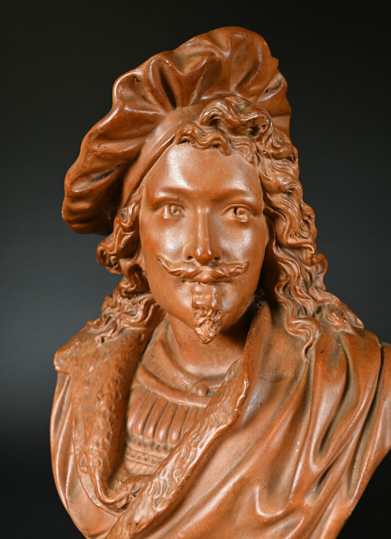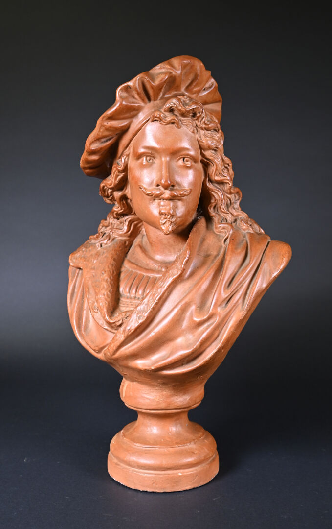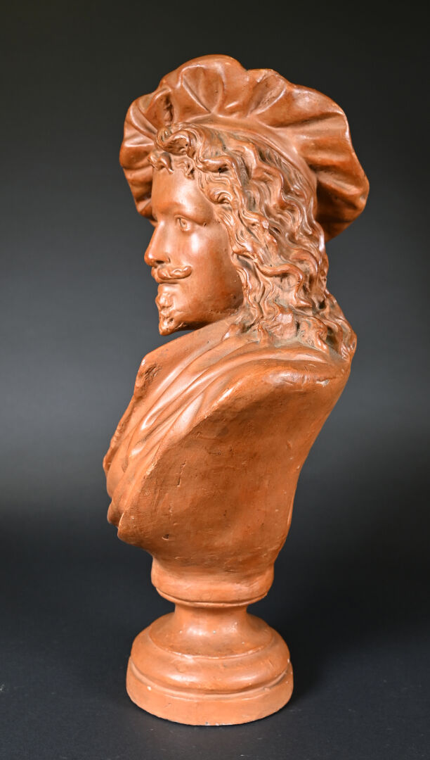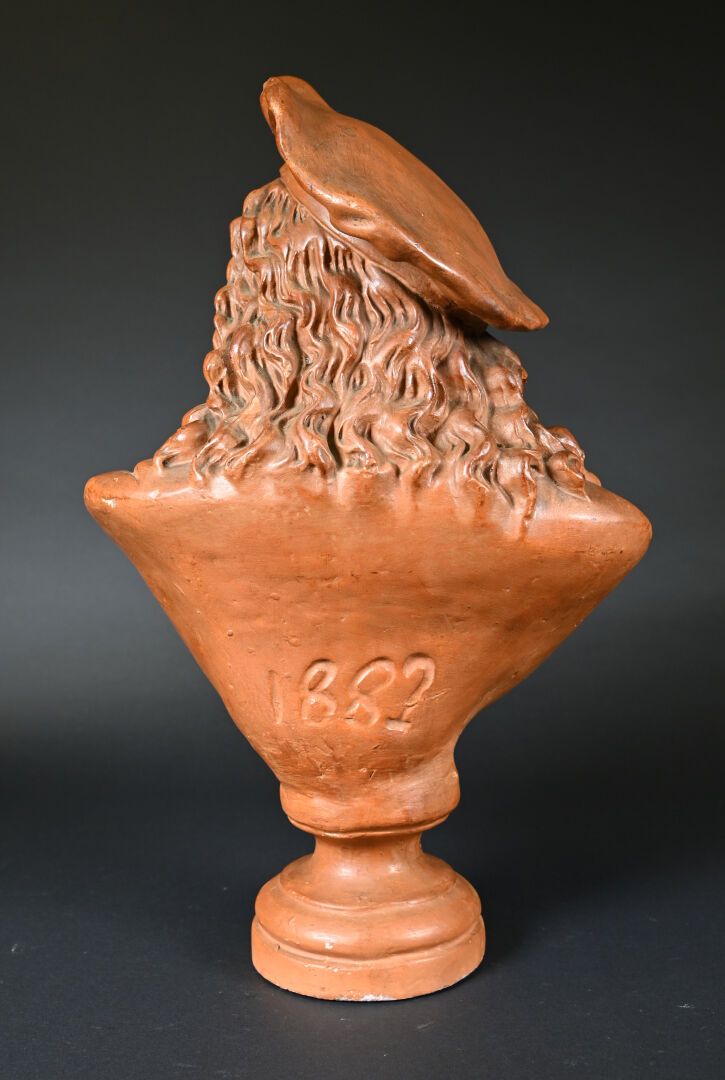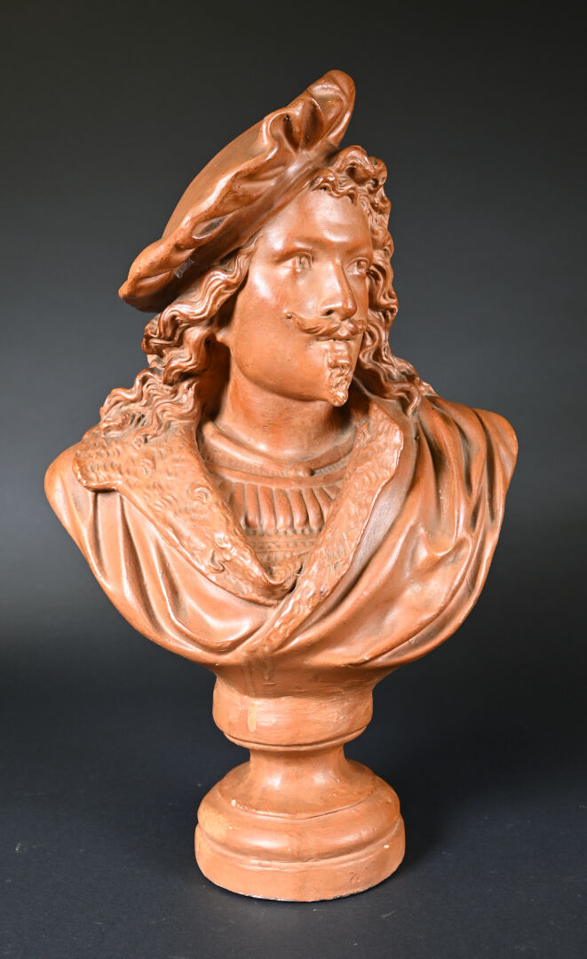 Buste en terre cuite représentant REMBRANDT, marqué 1882 au dos (égrenures, petits éclats). Fin du XIXe ou début du XXe siècle. Haut. : 57 cm.