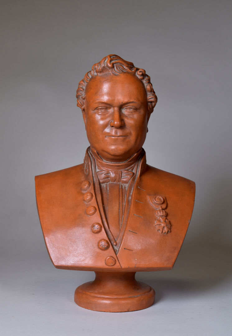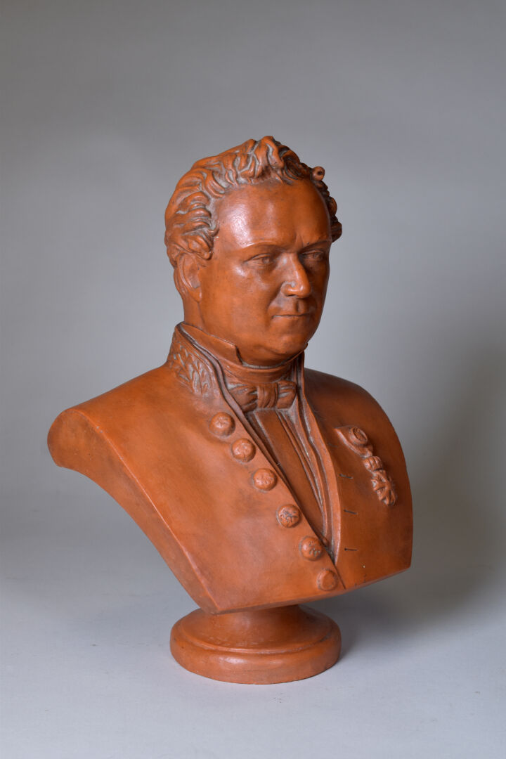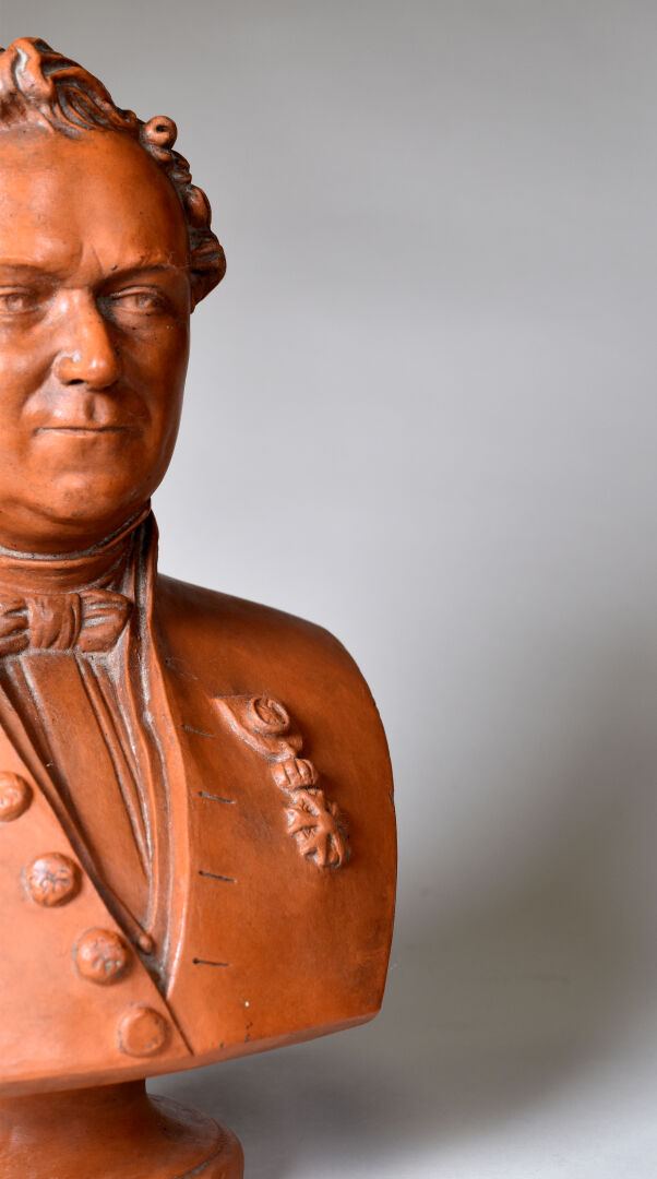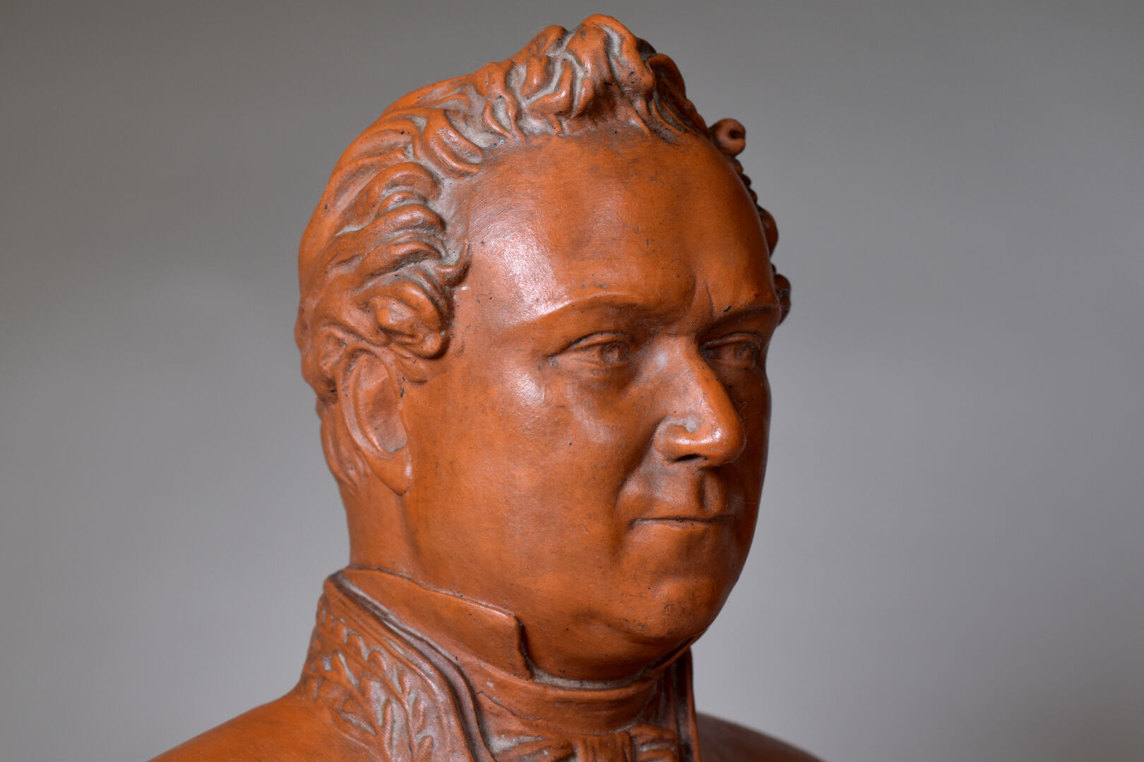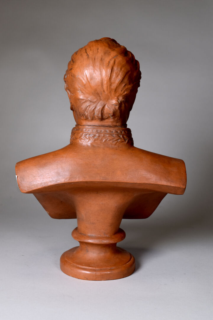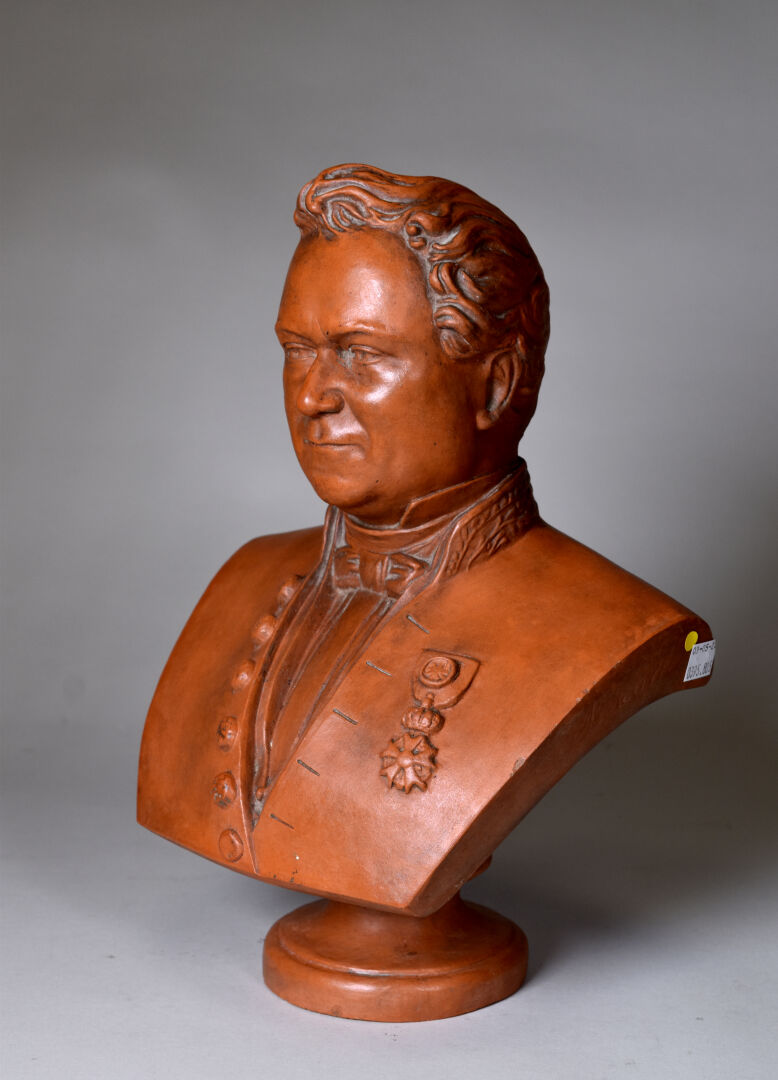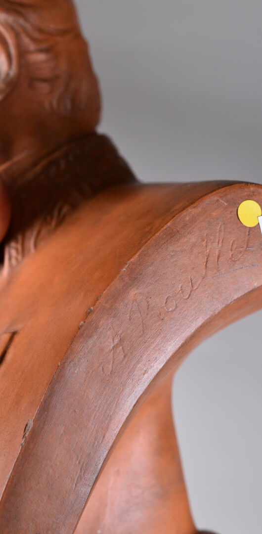 Buste en terre cuite représentant un homme médaillé de la Légion d’Honneur. Traces de signature A. ROU…Fin du XIXe ou début du XXe siècle. Haut. : 34,5 cm.