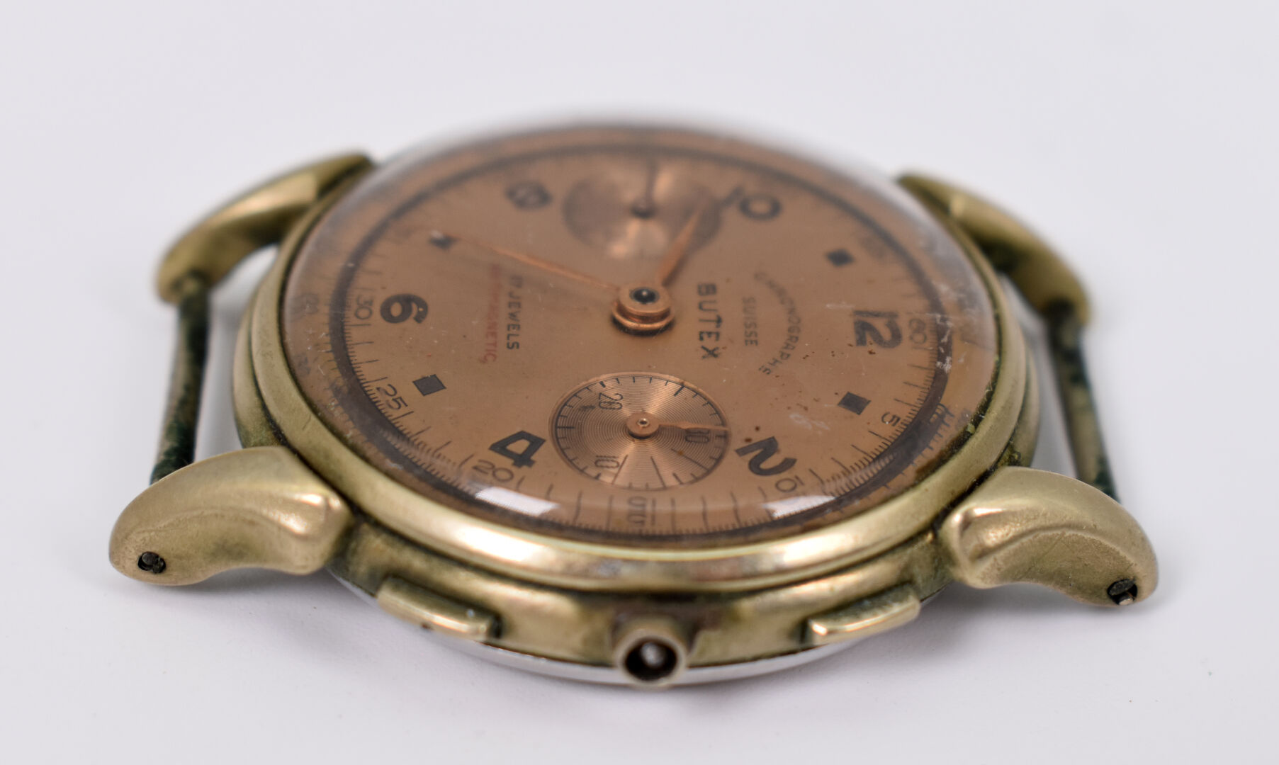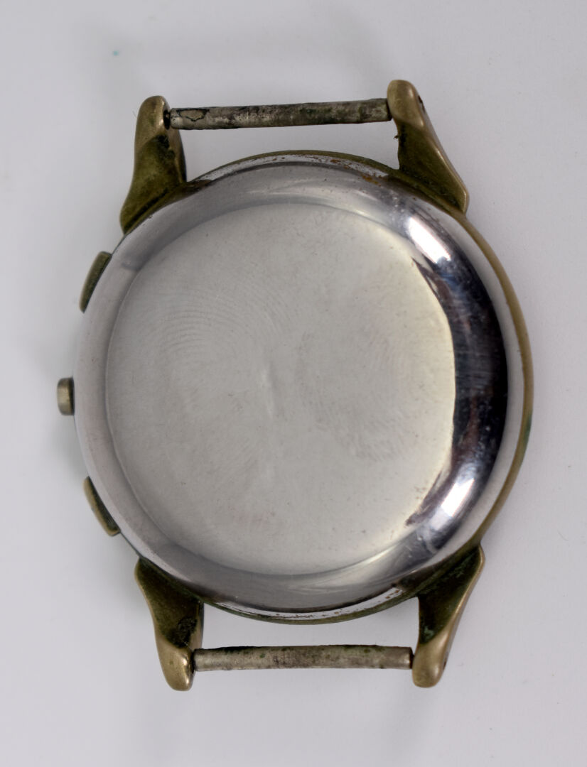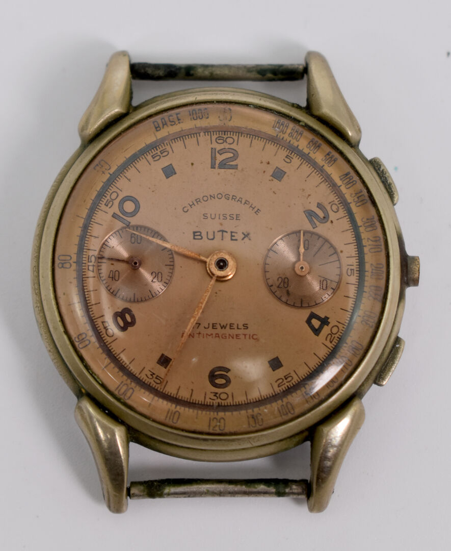 BUTEX. Boitier de montre bracelet d’homme – chronographe Suisse. Cadran circulaire à 2 complications, signé (manque le remontoir). Première moitié du XXe siècle.