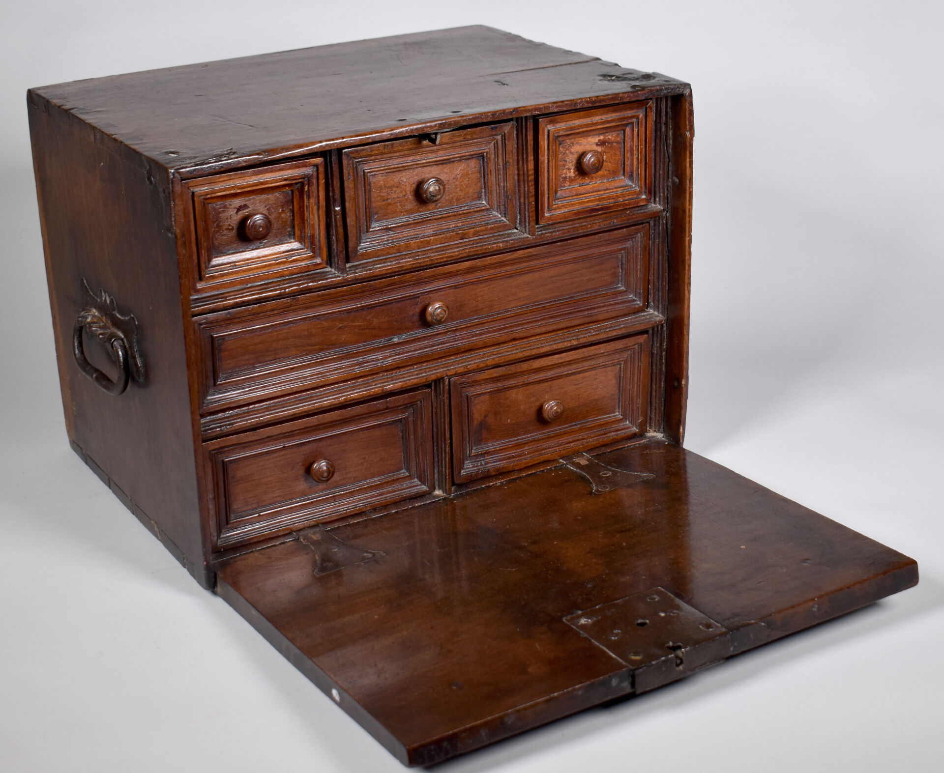 Cabinet de voyage en noyer, l’abattant découvrant huit tiroirs sur trois rangs, poignées latérales et entrée de serrure en métal.