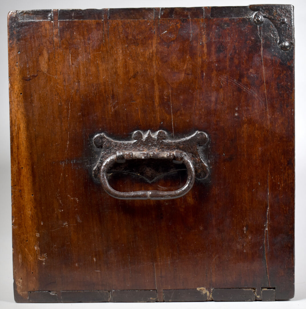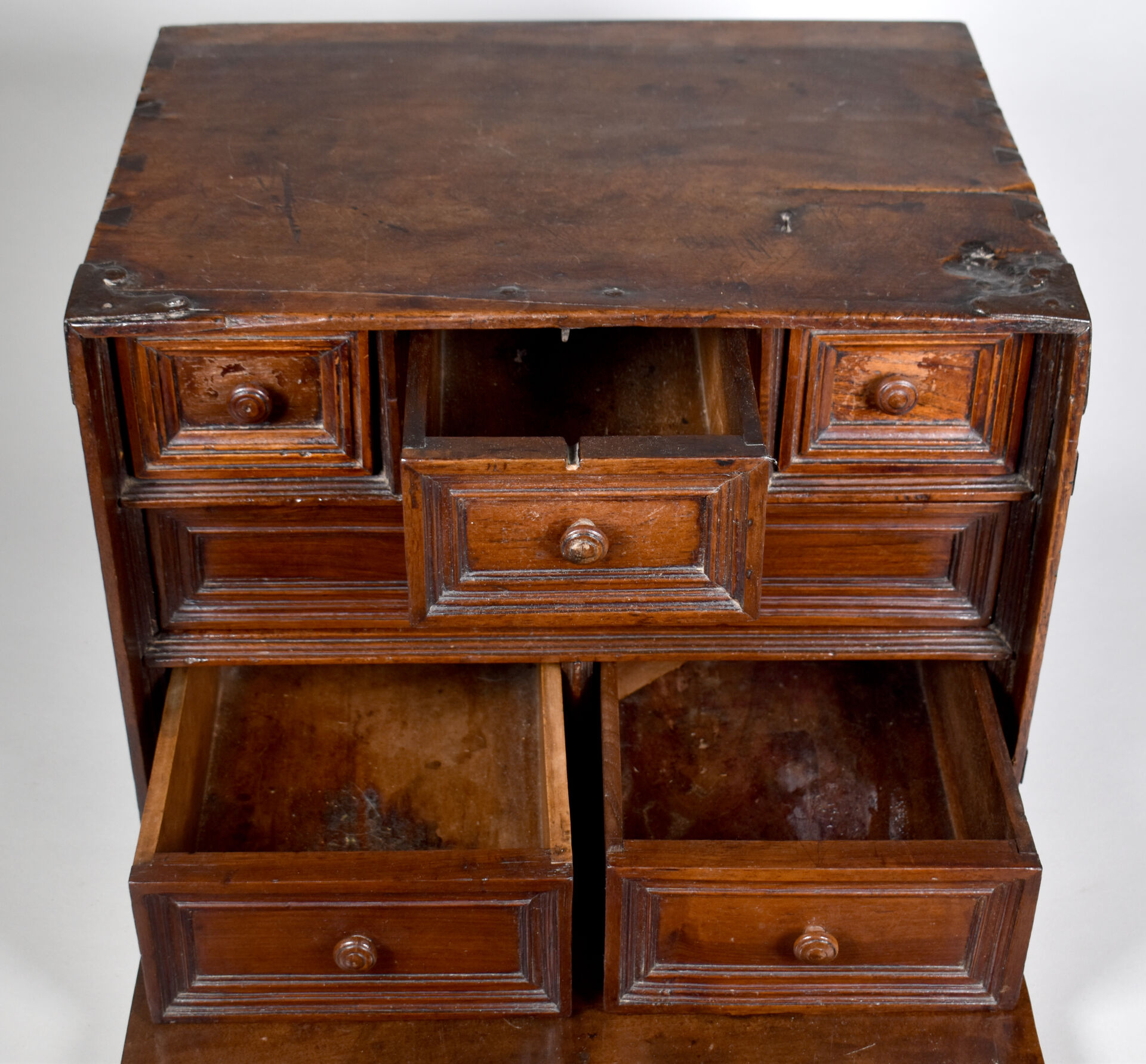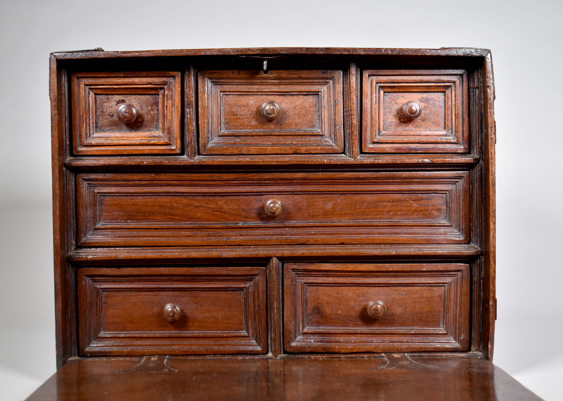 Cabinet de voyage en noyer, l’abattant découvrant huit tiroirs sur trois rangs, poignées latérales et entrée de serrure en métal. En partie d’époque Louis XIV. Haut. : 28 cm – Larg. : 38 cm – Prof. : 28 cm.