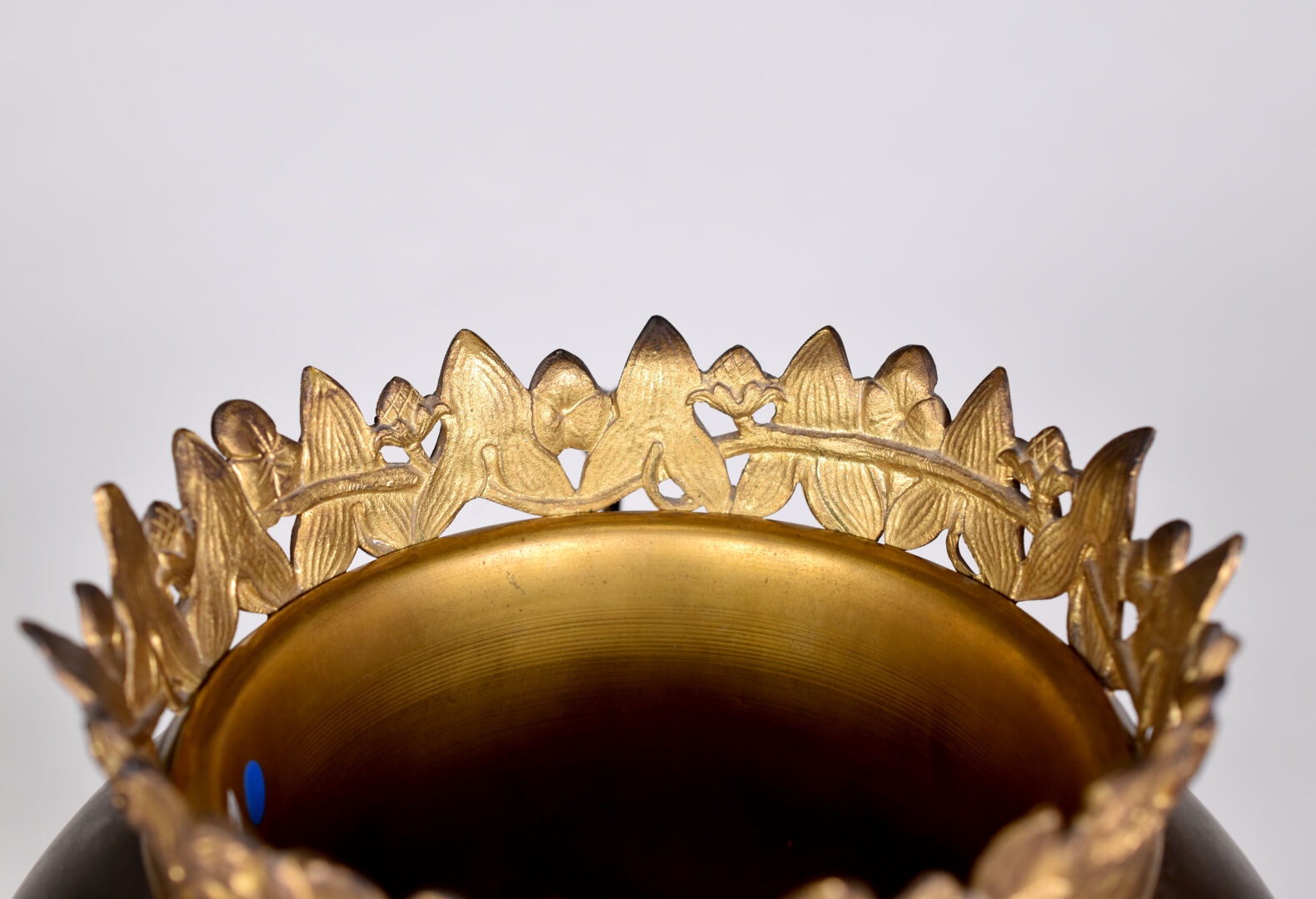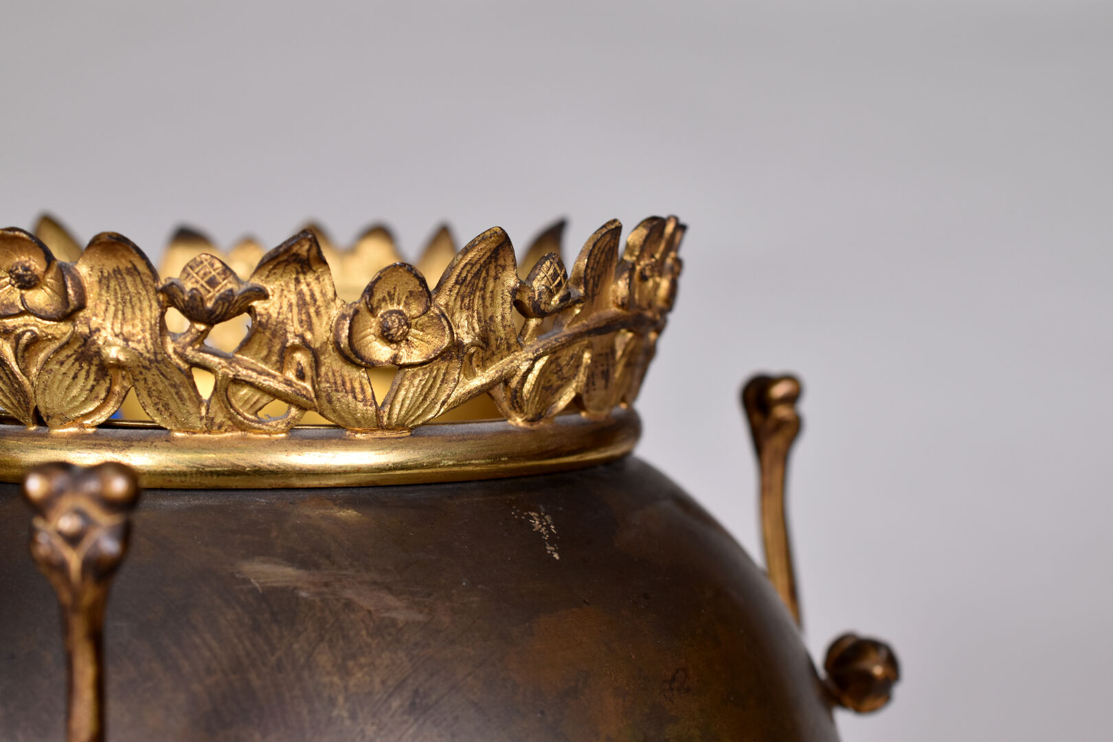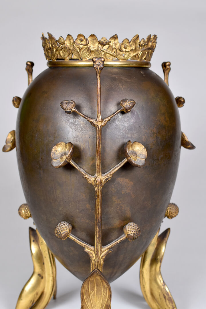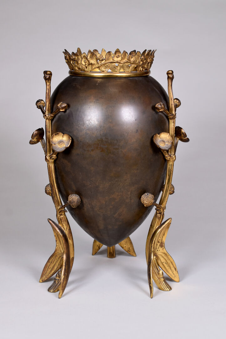 Cache pot en bronze patiné brun et or, la panse ovoïde, piètement tripode floral. L’intérieur amovible en laiton. Haut. : 38 cm.