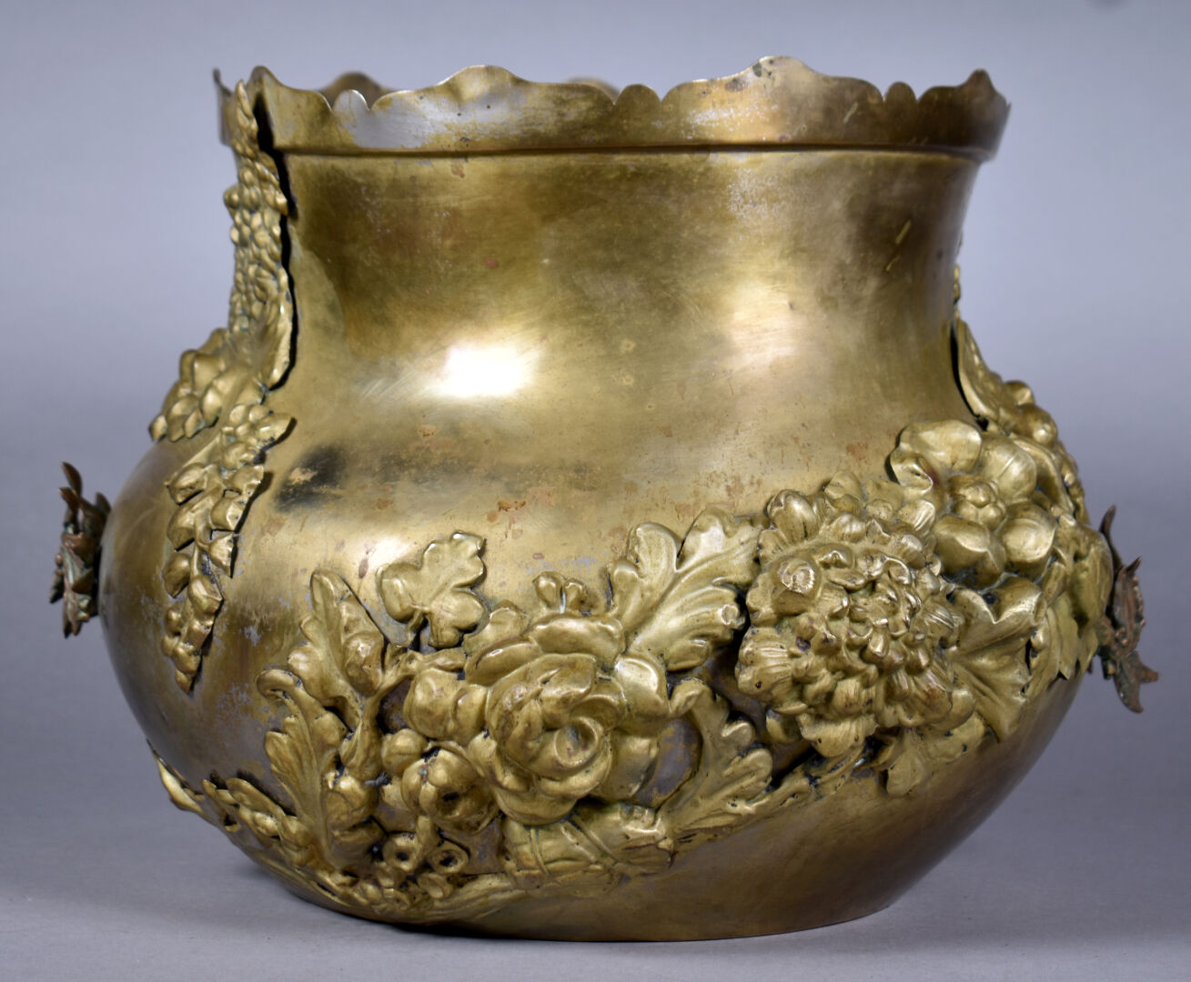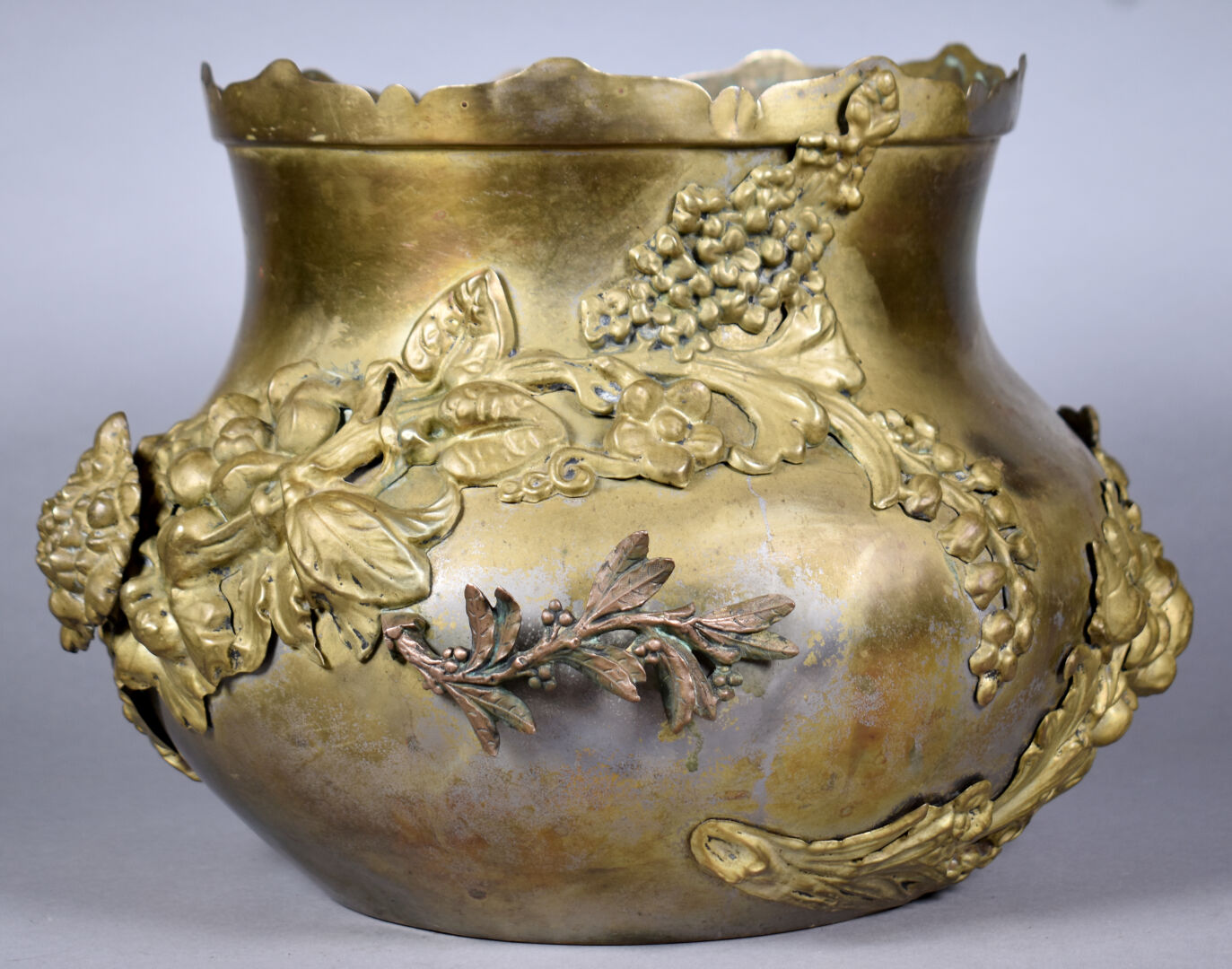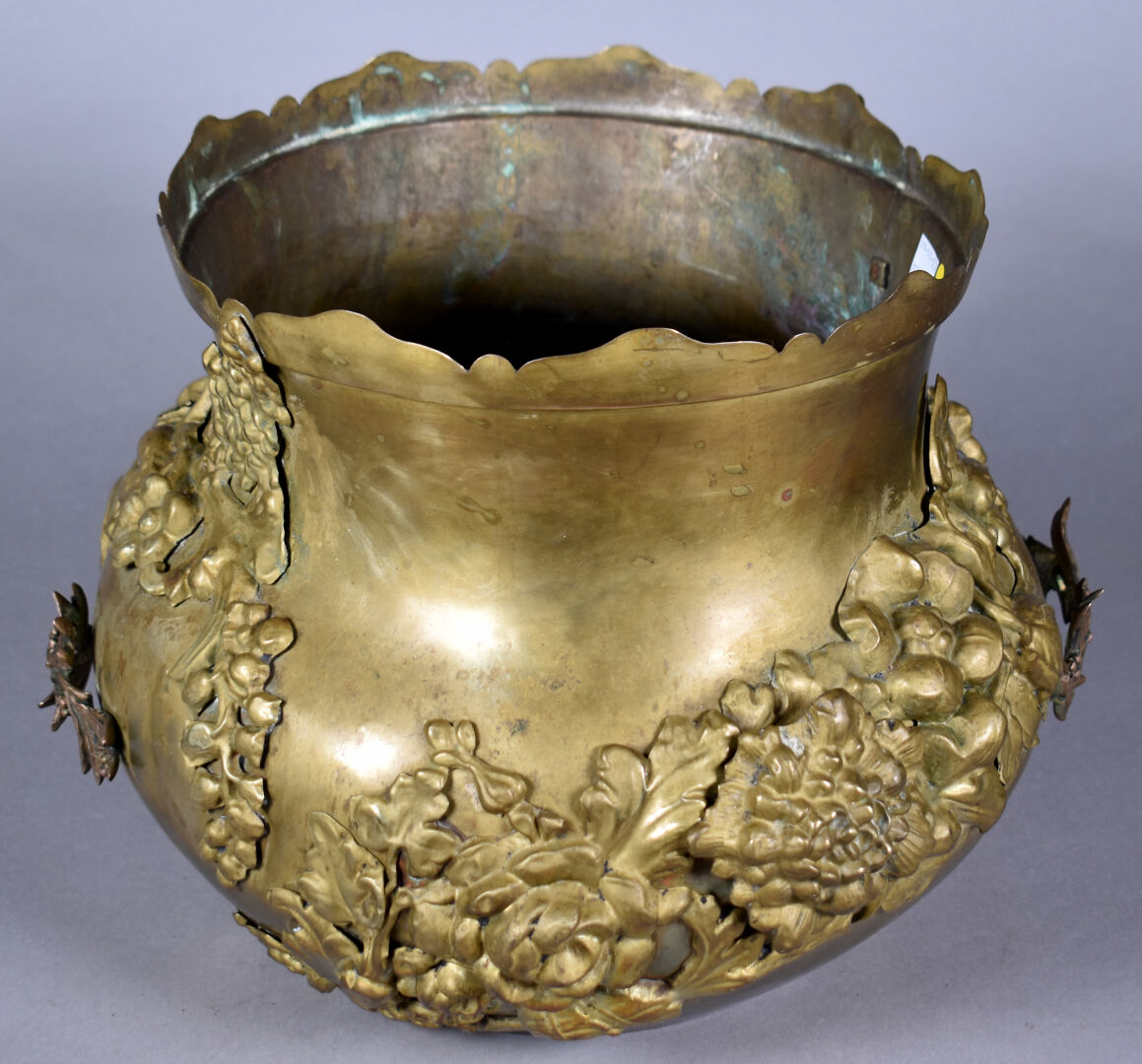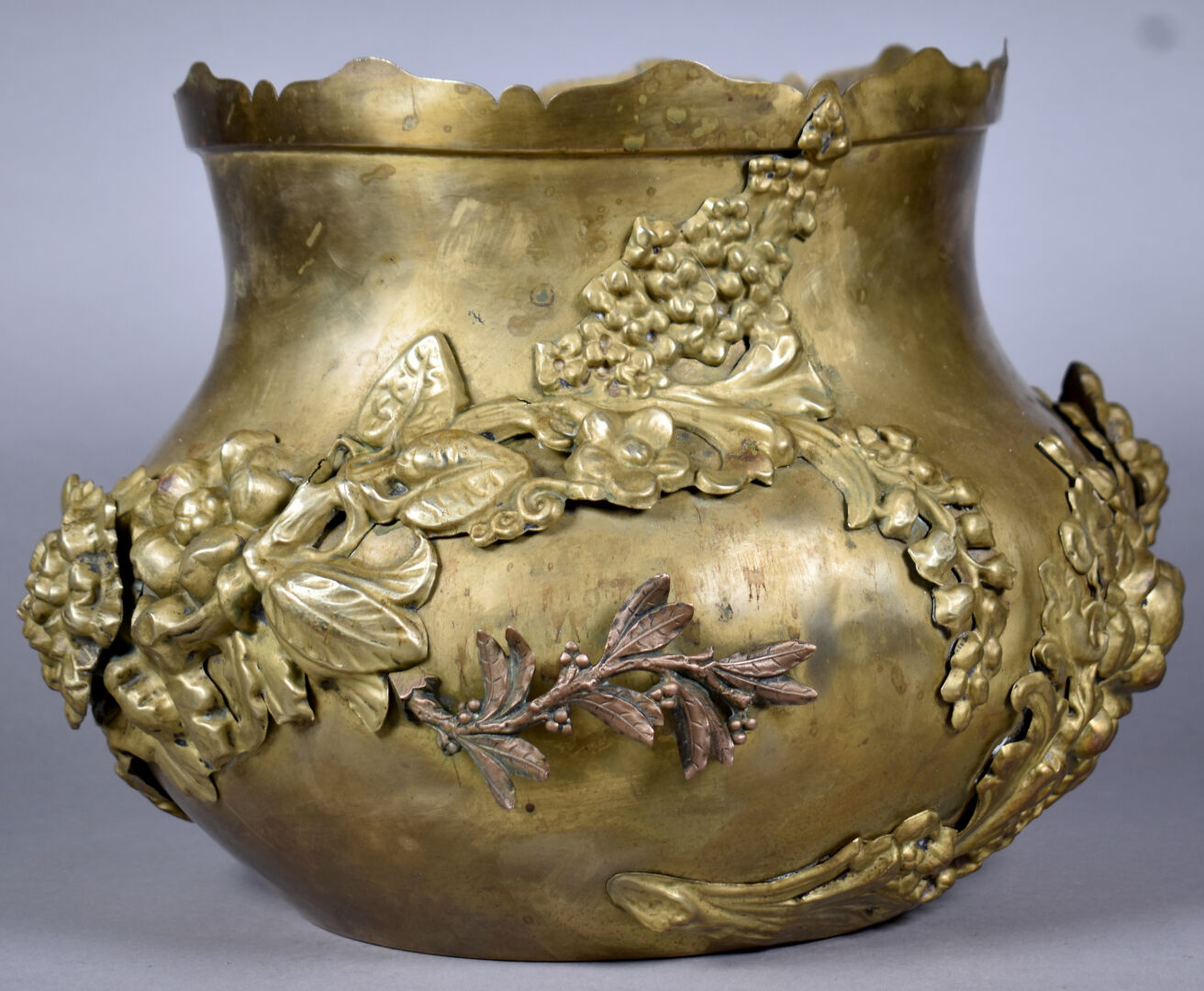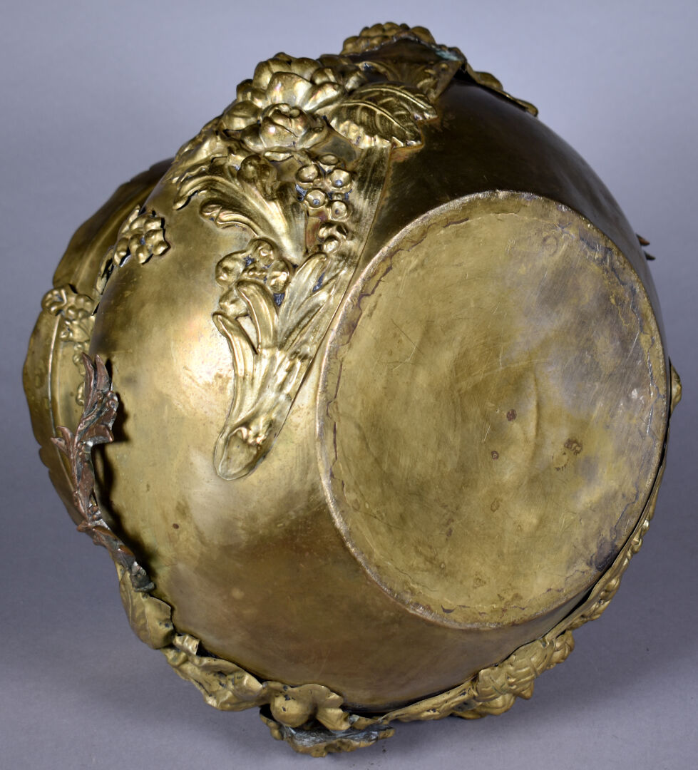 Cache pot en cuivre ou laiton à décor appliqué de fleurs. Vers 1900. Haut. : 26 cm.