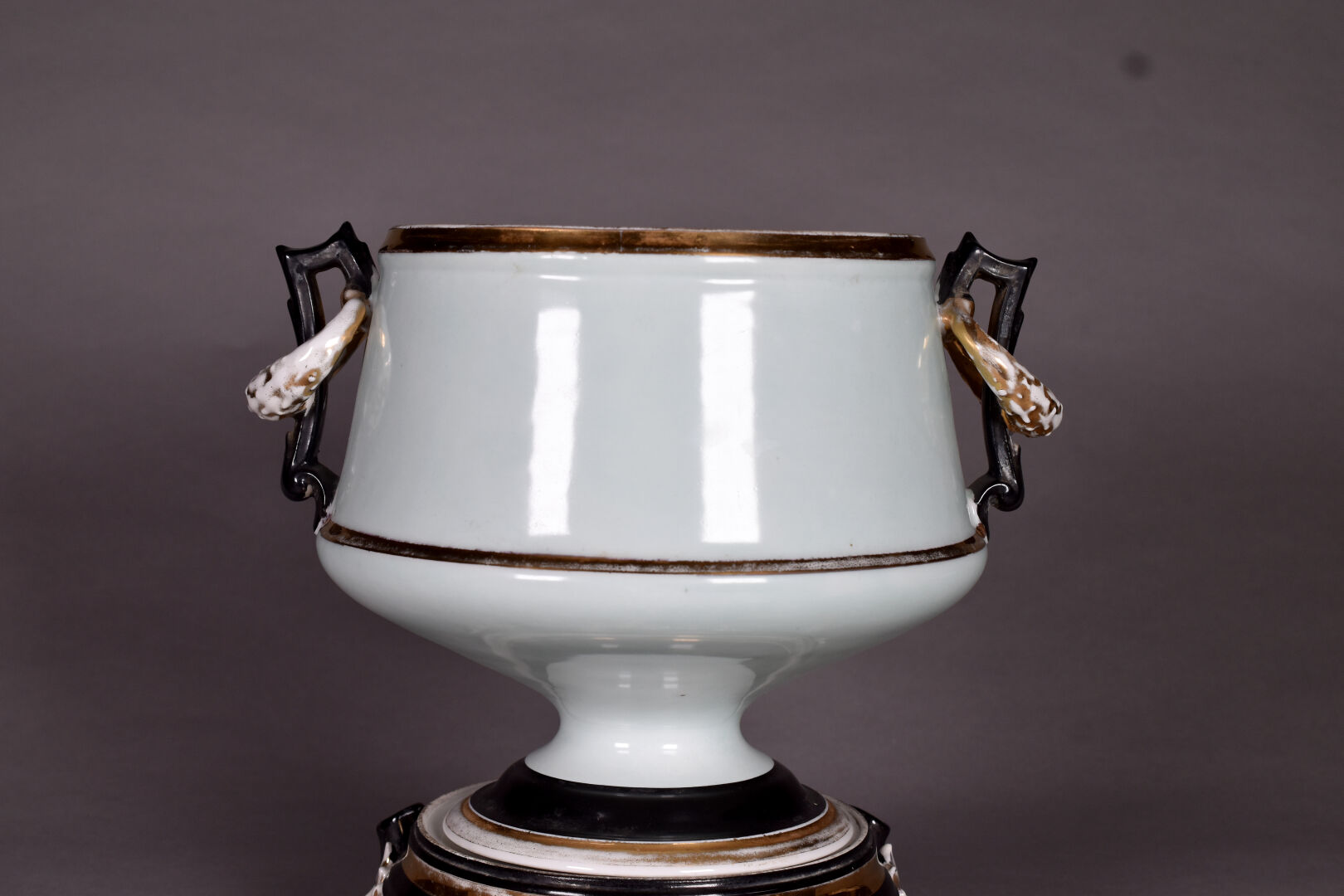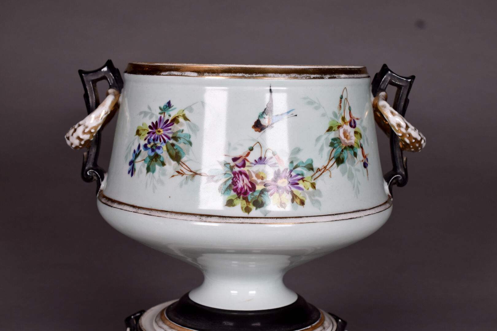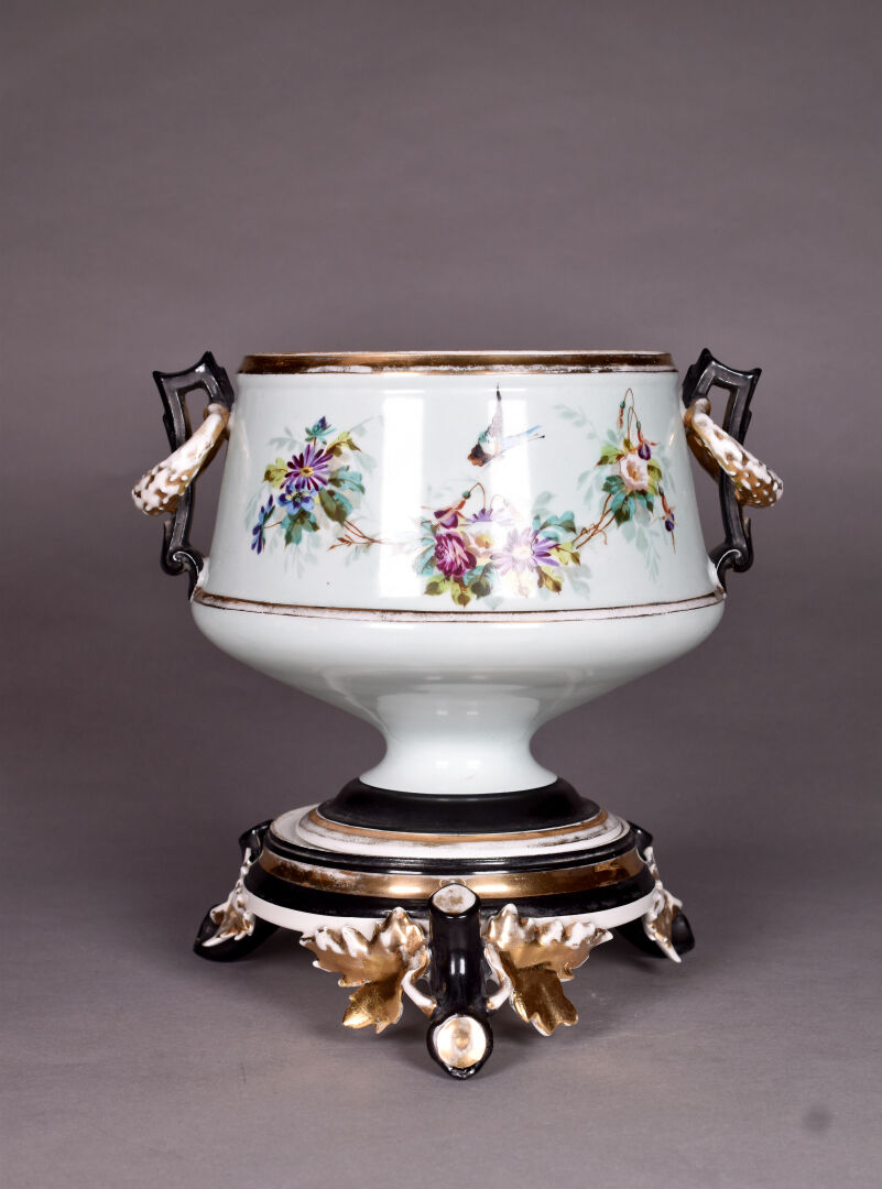 Cache pot et son socle en porcelaine noir, or et céladon à décor émaillé en polychromie de fleurs et papillon (quelques usures et restauration). Base tripode. Probablement Paris, époque Napoléon III. Haut. totale : 30 cm.