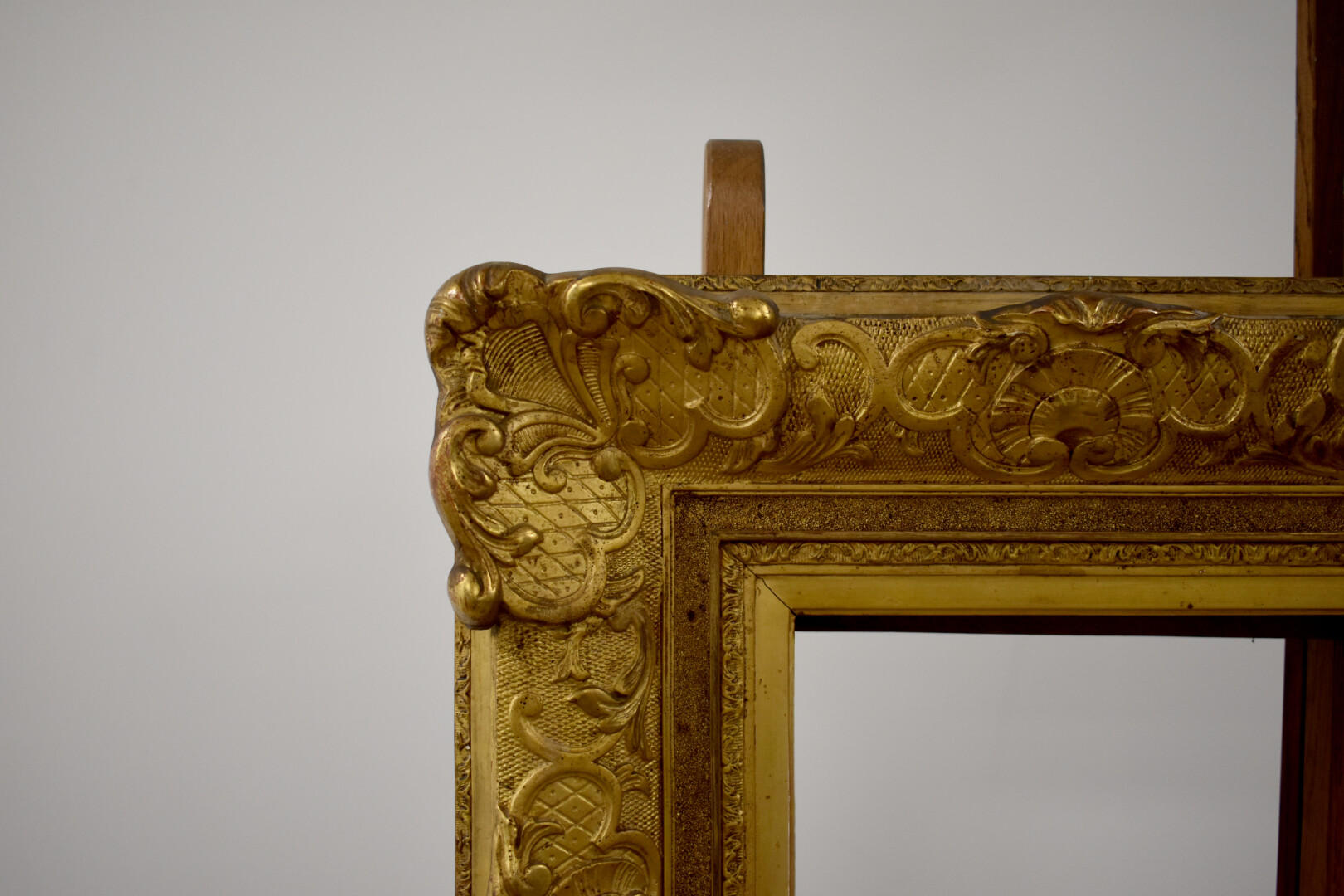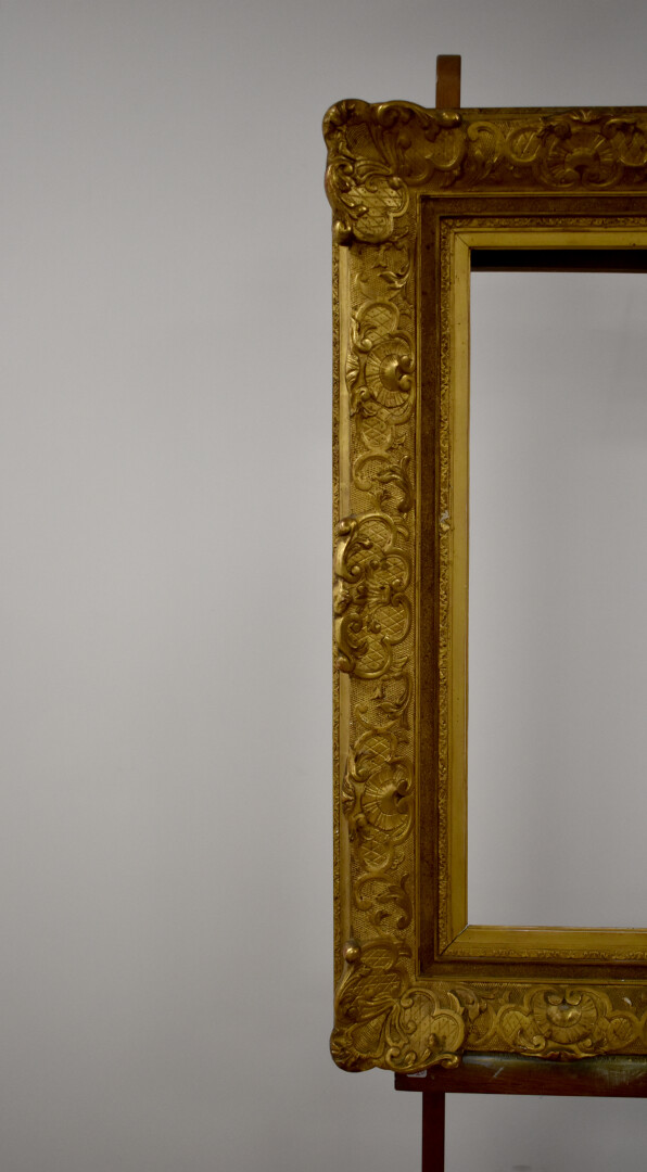 Cadre en bois sculpté doré à décor d’acanthes sur fond de croisillons (petits éclats). Fin du XIXe siècle dans le goût du XVIIIe siècle.