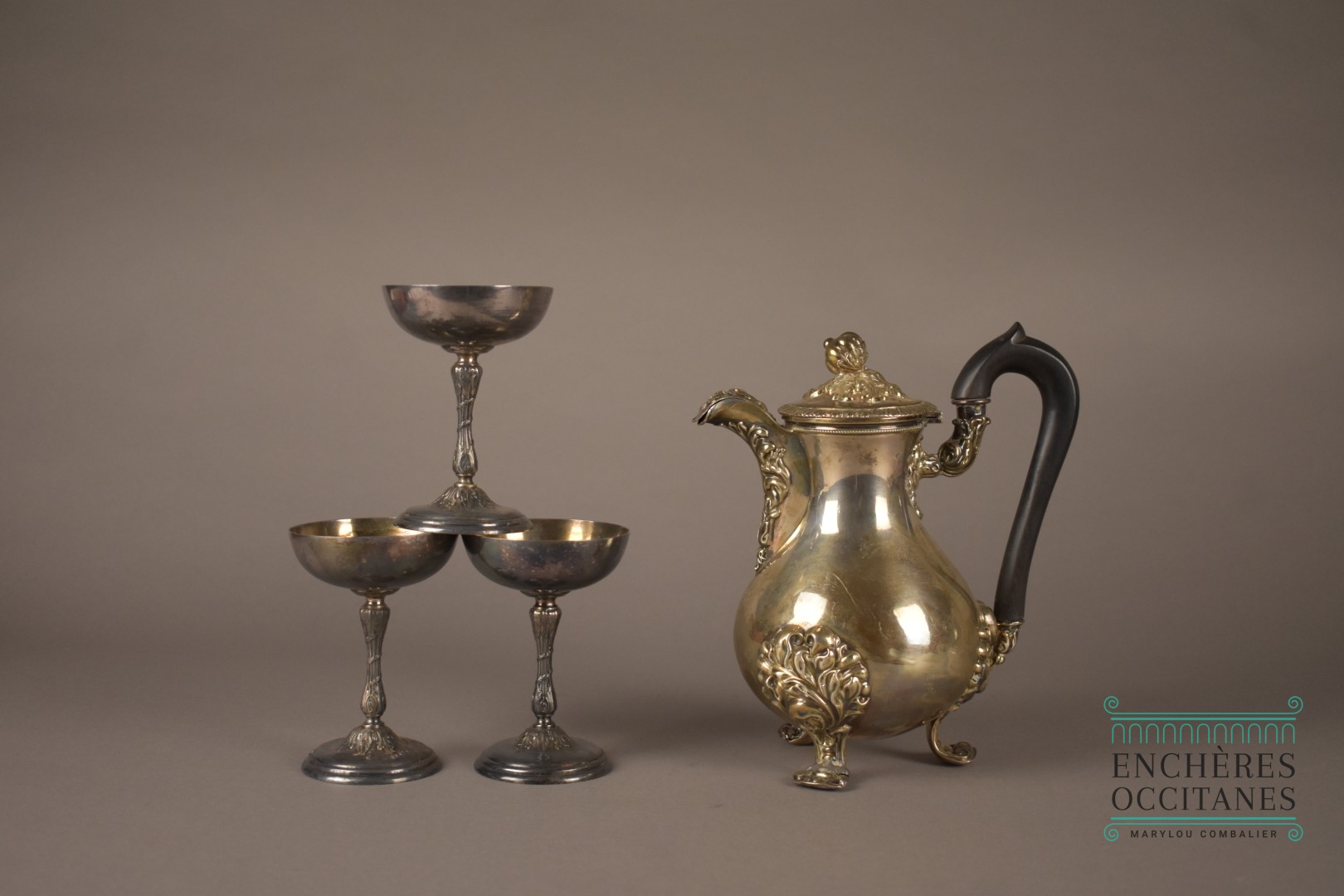 Cafetière en argent 925/1000e à décor repoussé de feuilles d’acanthe, le manche en ébène, la panse monogrammée (la prise du couvercle restaurée, petits enfoncements). Maître orfèvre Jean-François VEYRAT (1831-1840). Poids brut : 571 g. On joint trois coupes sur pied en métal argenté.