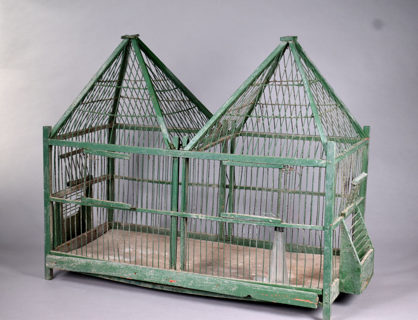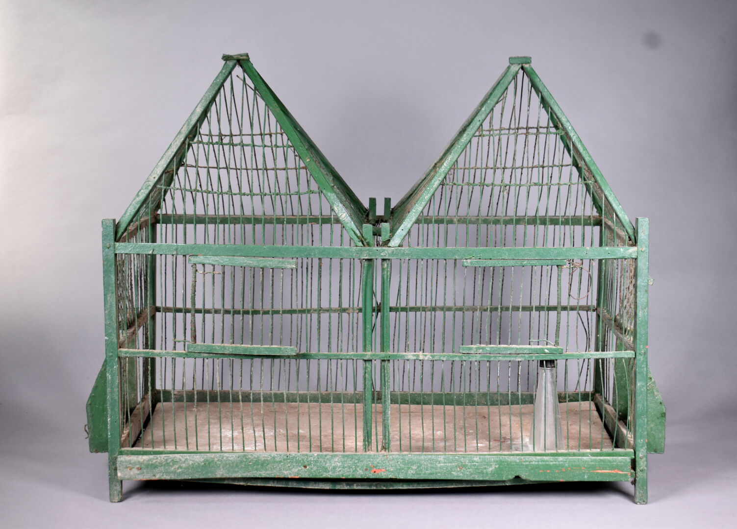 Cage en métal et bois laqué vert. XXe siècle. Haut. : 60 cm – Larg. : 81 cm – Prof. : 30 cm.