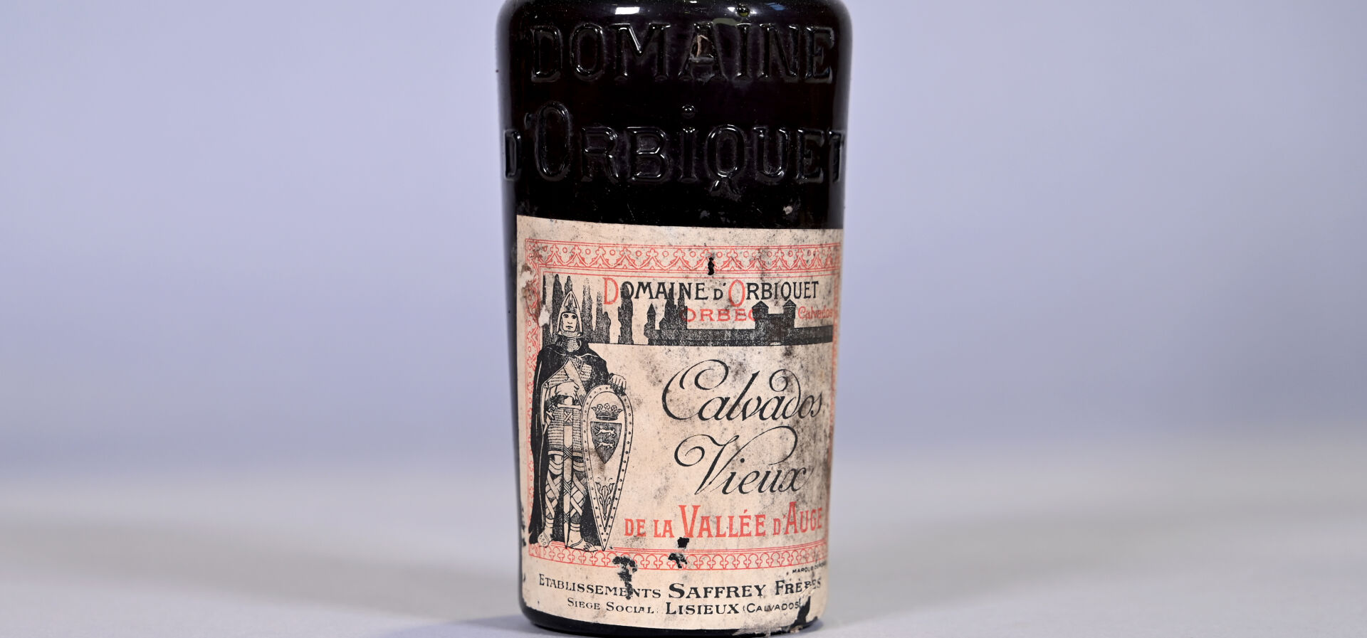 CALVADOS – 1 bouteille, Calvados Vieux de la Vallée d’Auge, Domaine d’Orbiquet, peut-être fin 19ème siècle. Niveau à l’épaule. Capsule légèrement sale. Collerette sale et très abimée. Etiquette sale à très sale et légèrement abimée.