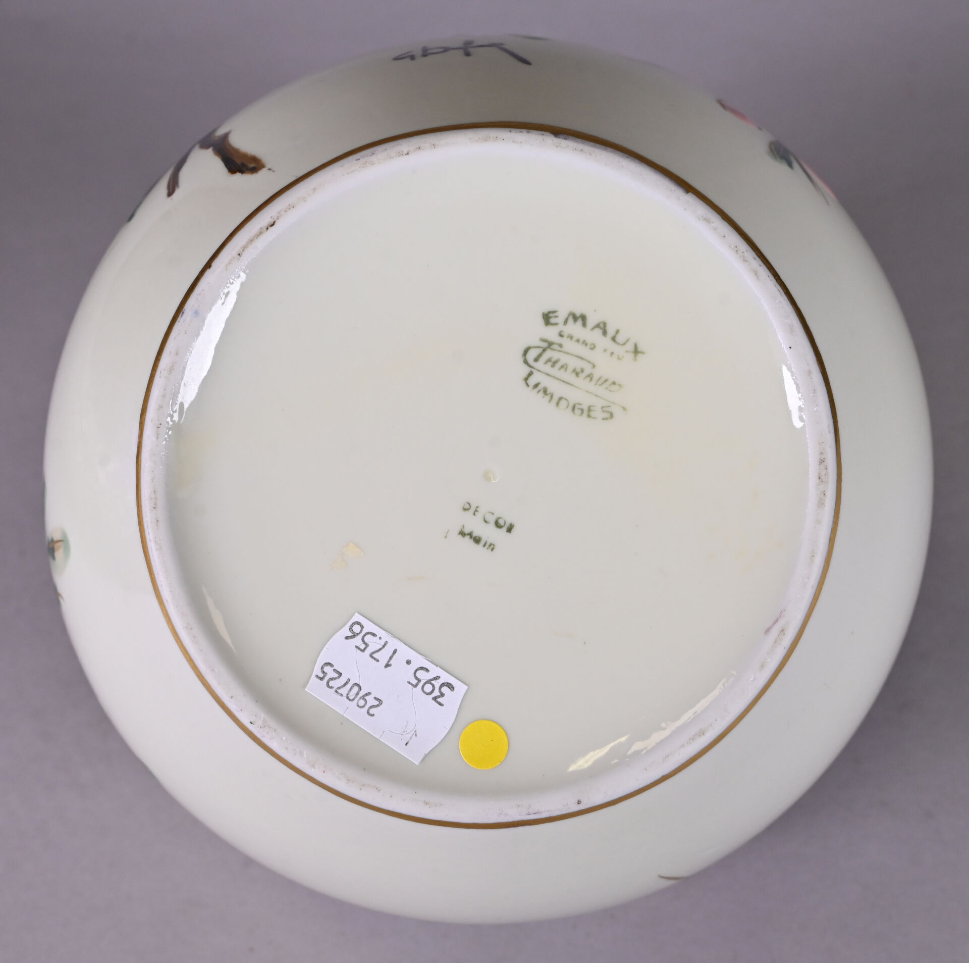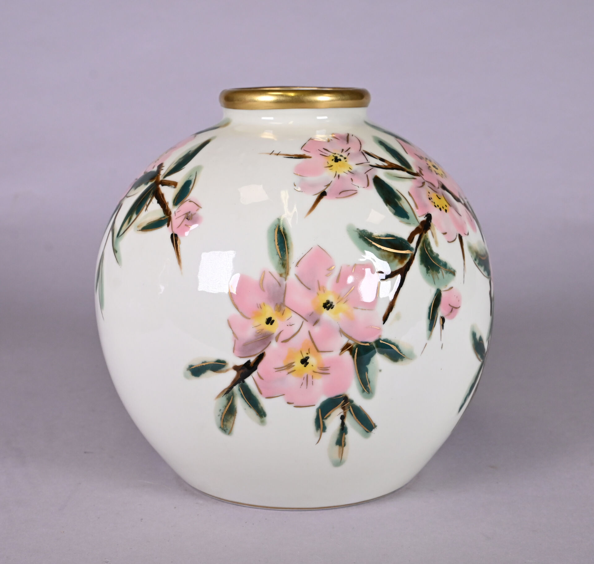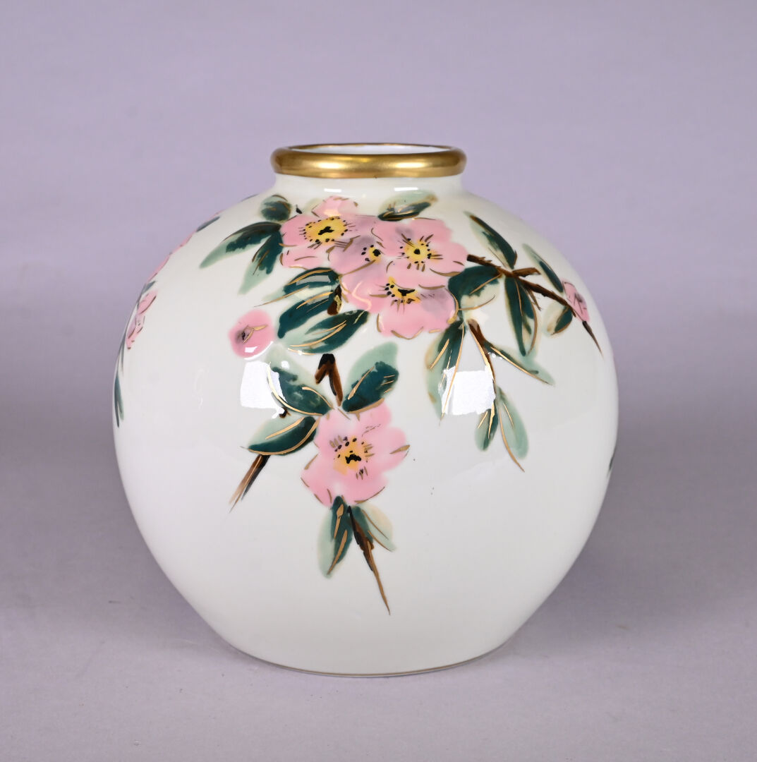 Camille THARAUD (1878-1956) Limoges. Vase boule à décor émaillé en polychromie de branches fleuries sur crème. Marqué au dessous. Signé dans le décor Germaine Dufour. Haut. : 20 cm.