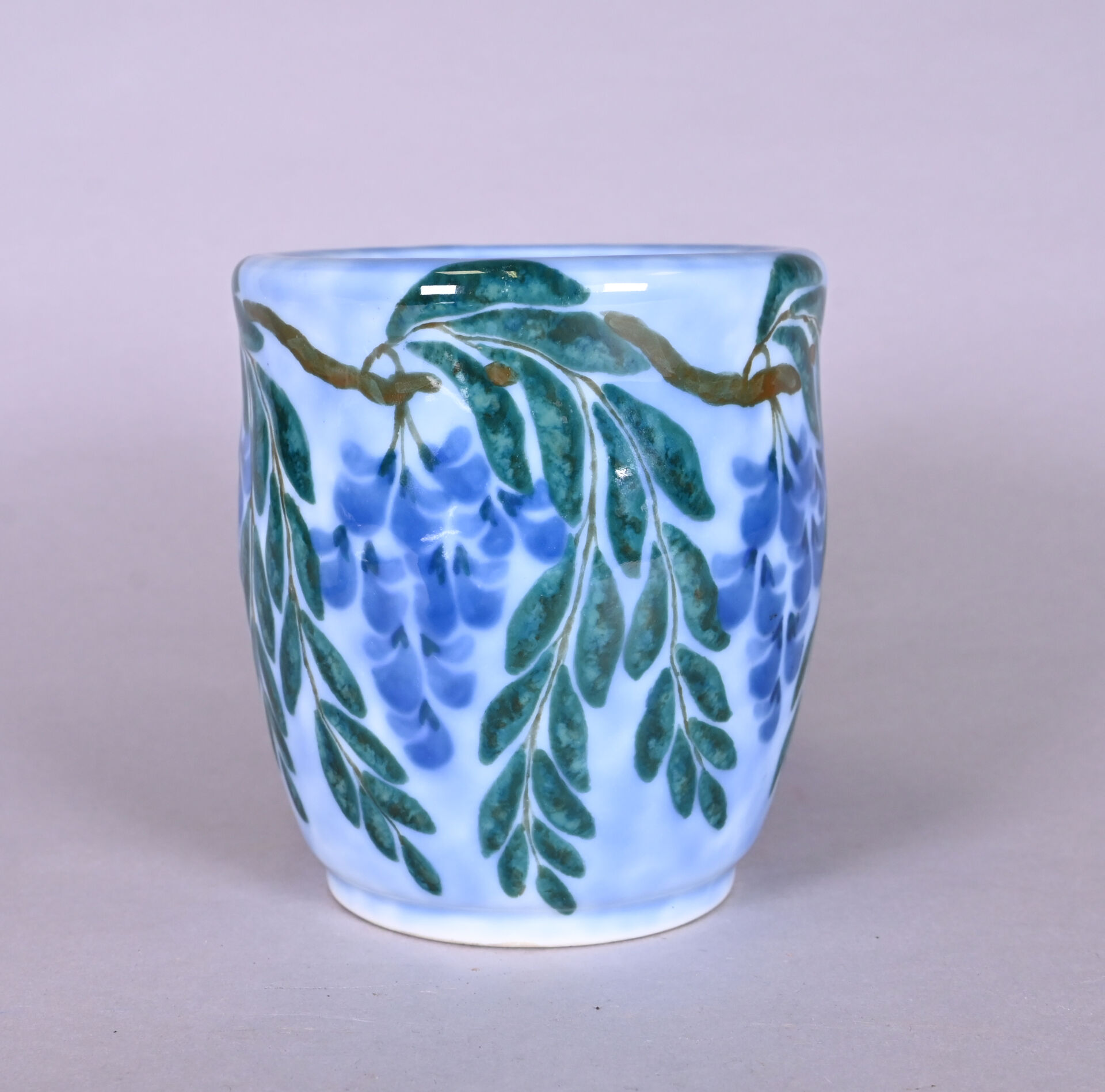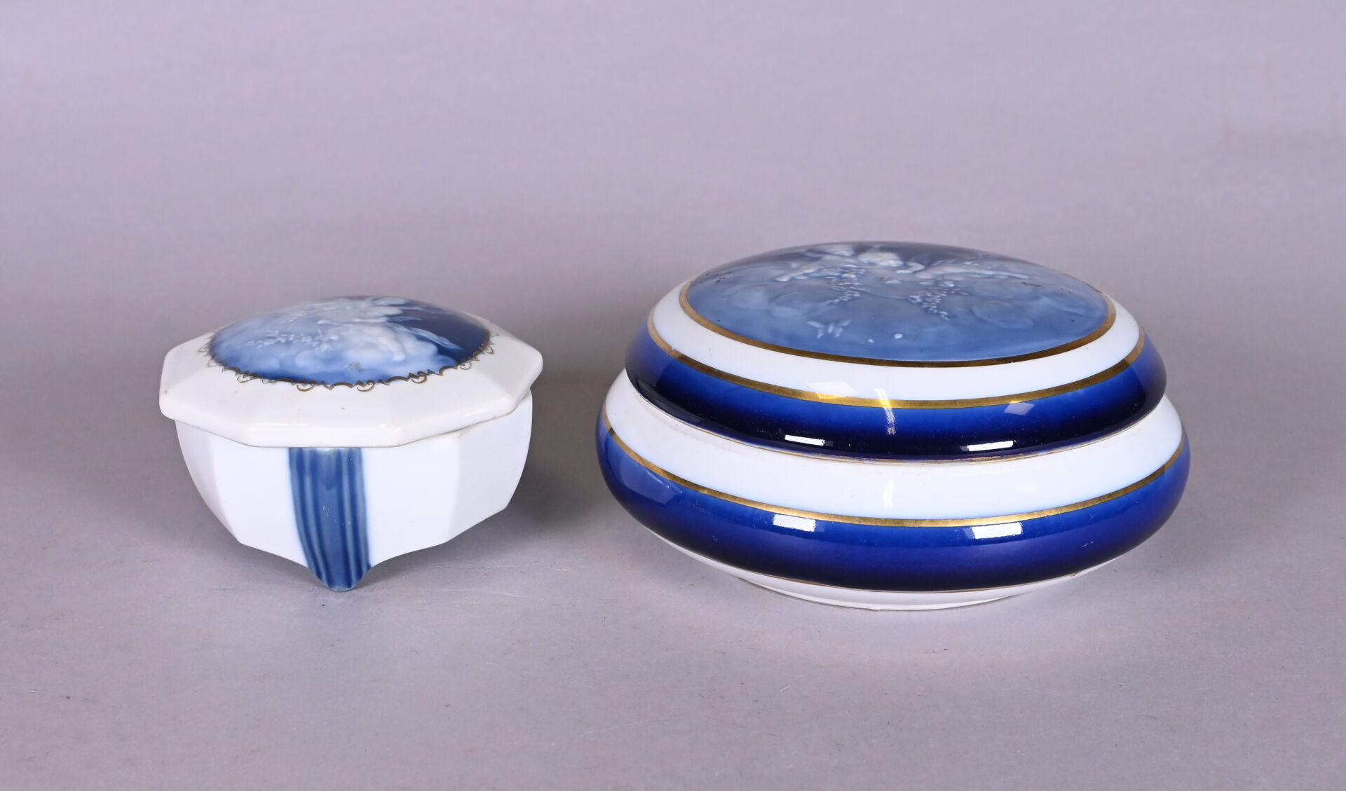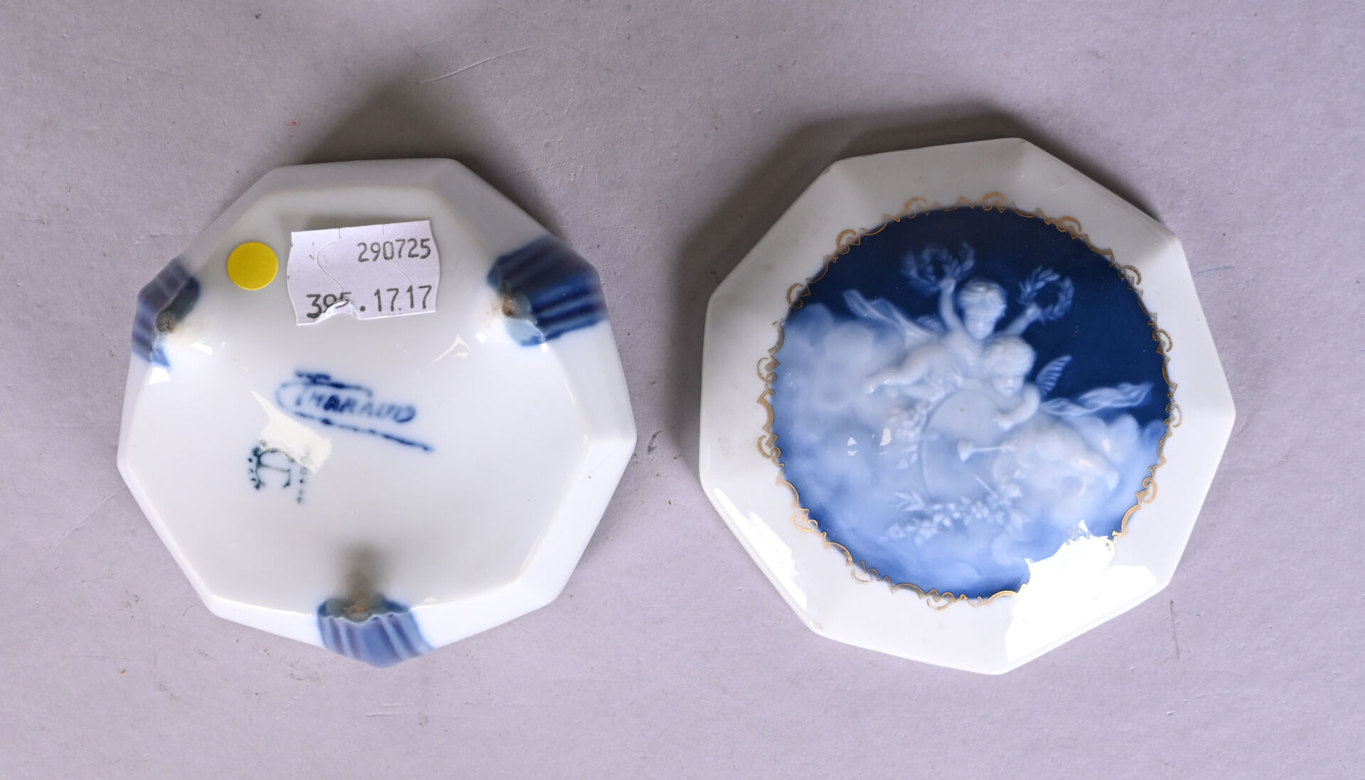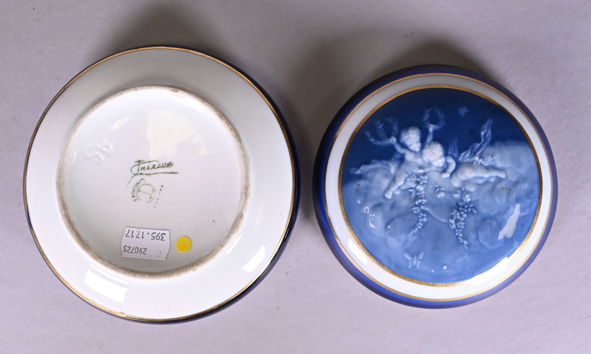 Camille THARAUD à Limoges. Ensemble en porcelaine soit un vase à décor de glycines et deux bonbonnières à décor de putti en blanc sur fond bleu. Marqués. Haut. du vase : 15 cm.