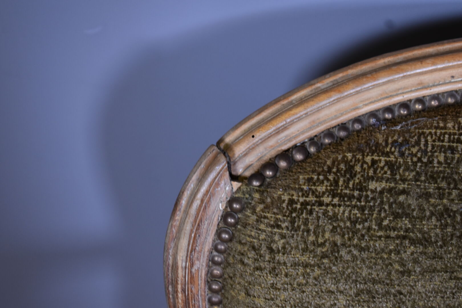 Canapé en hêtre mouluré sculpté à décor de roses, les accotoirs en coup de fouet, les pieds cambrés (restaurations et accidents). En partie d’Epoque Louis XV. Garniture de velours vert olive. Haut. : 91 cm – Larg. : 116 cm – Prof. : 72 cm.