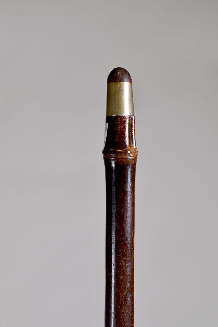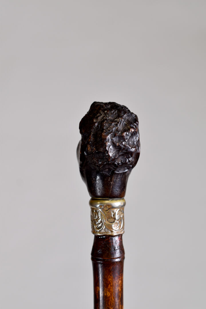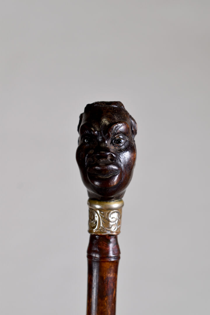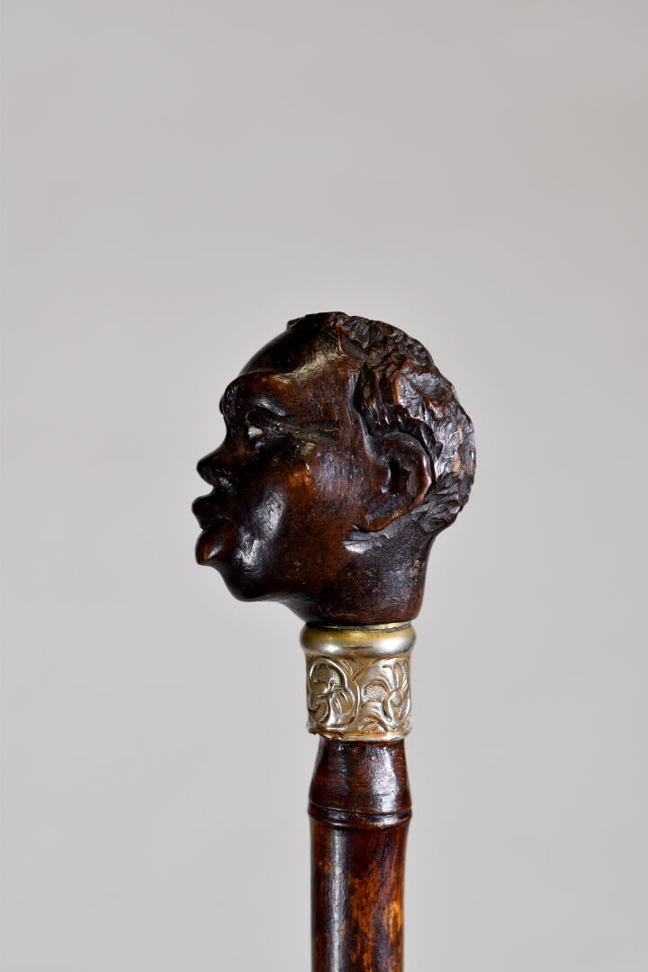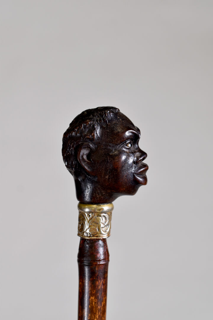 Canne à pommeau en bois sculpté d’une tête de nubien, les yeux en verre, le col en argent (usures petits enfoncements). Fin du XIXe ou début du XXe siècle. Long. : 91 cm.
