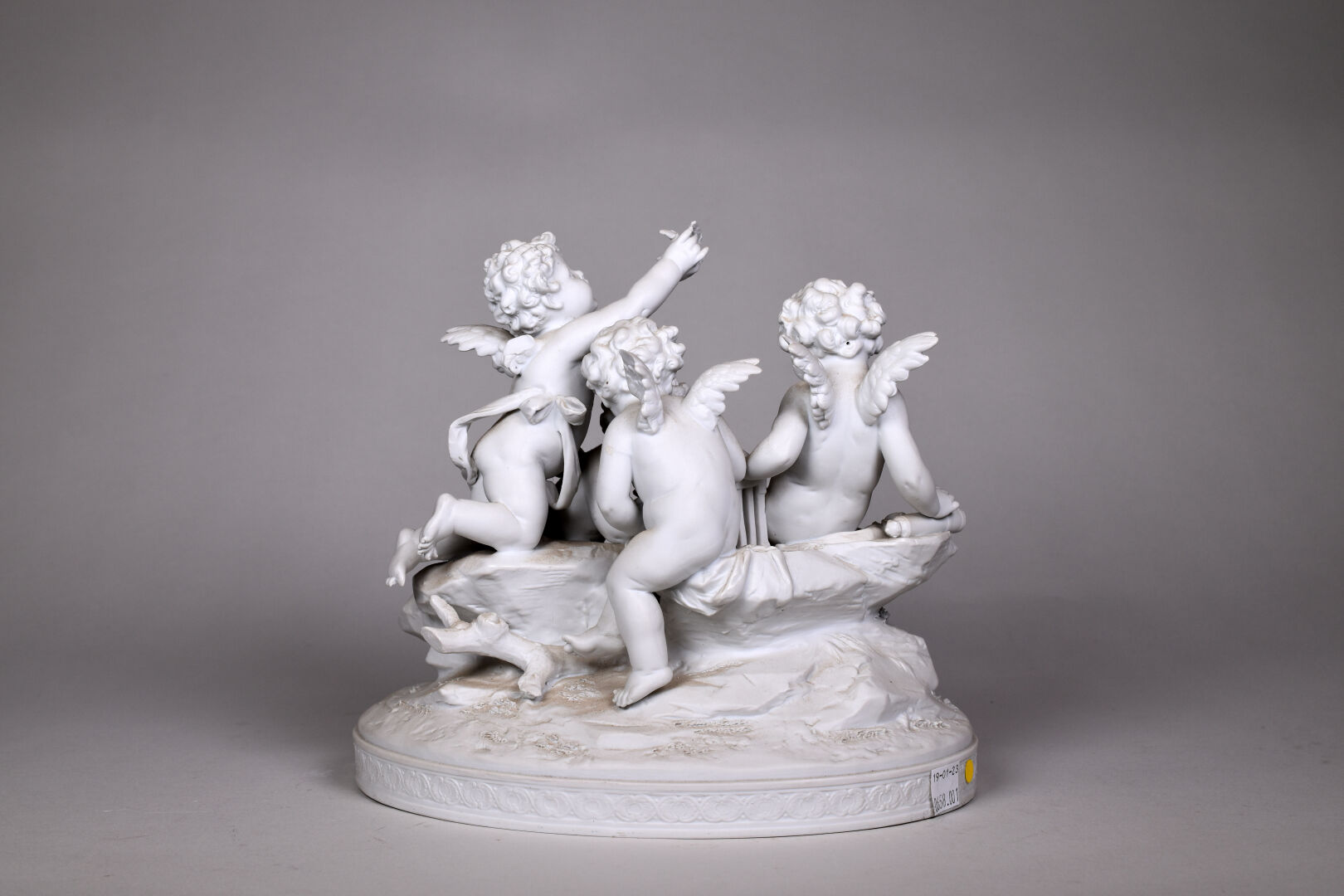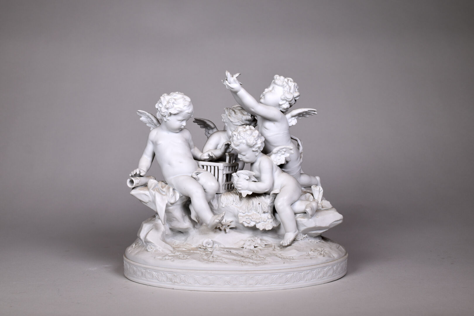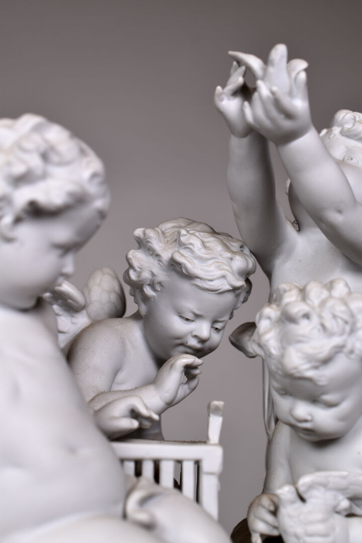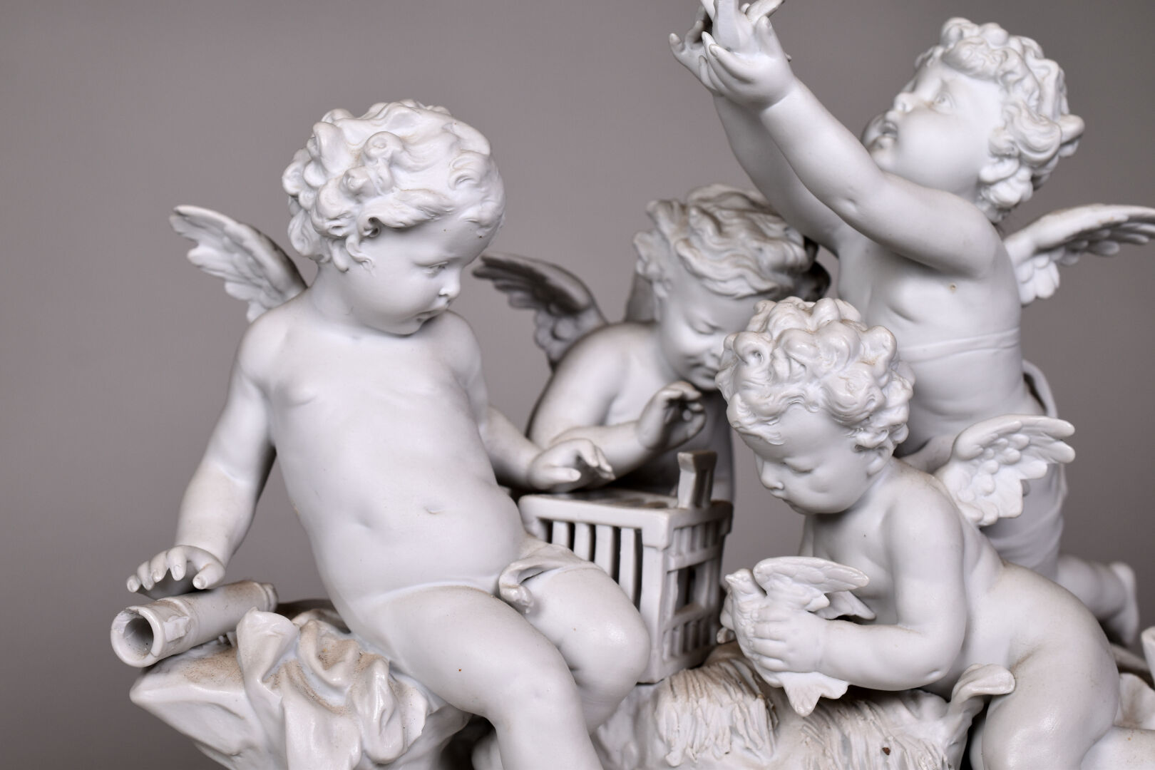 CAPODIMONTE. Groupe en biscuit figurant des angelots sortant des colombes d’une cage (éclats, une restauration). Marqué au dessous. Haut. : 23 cm.