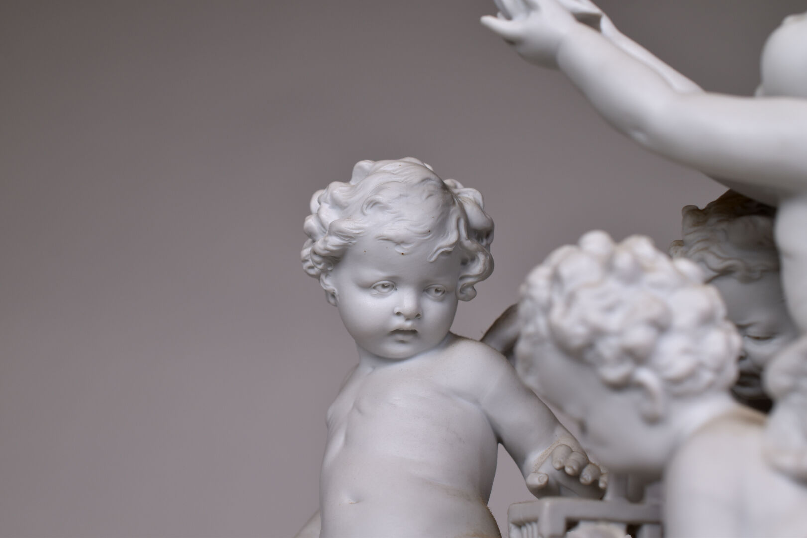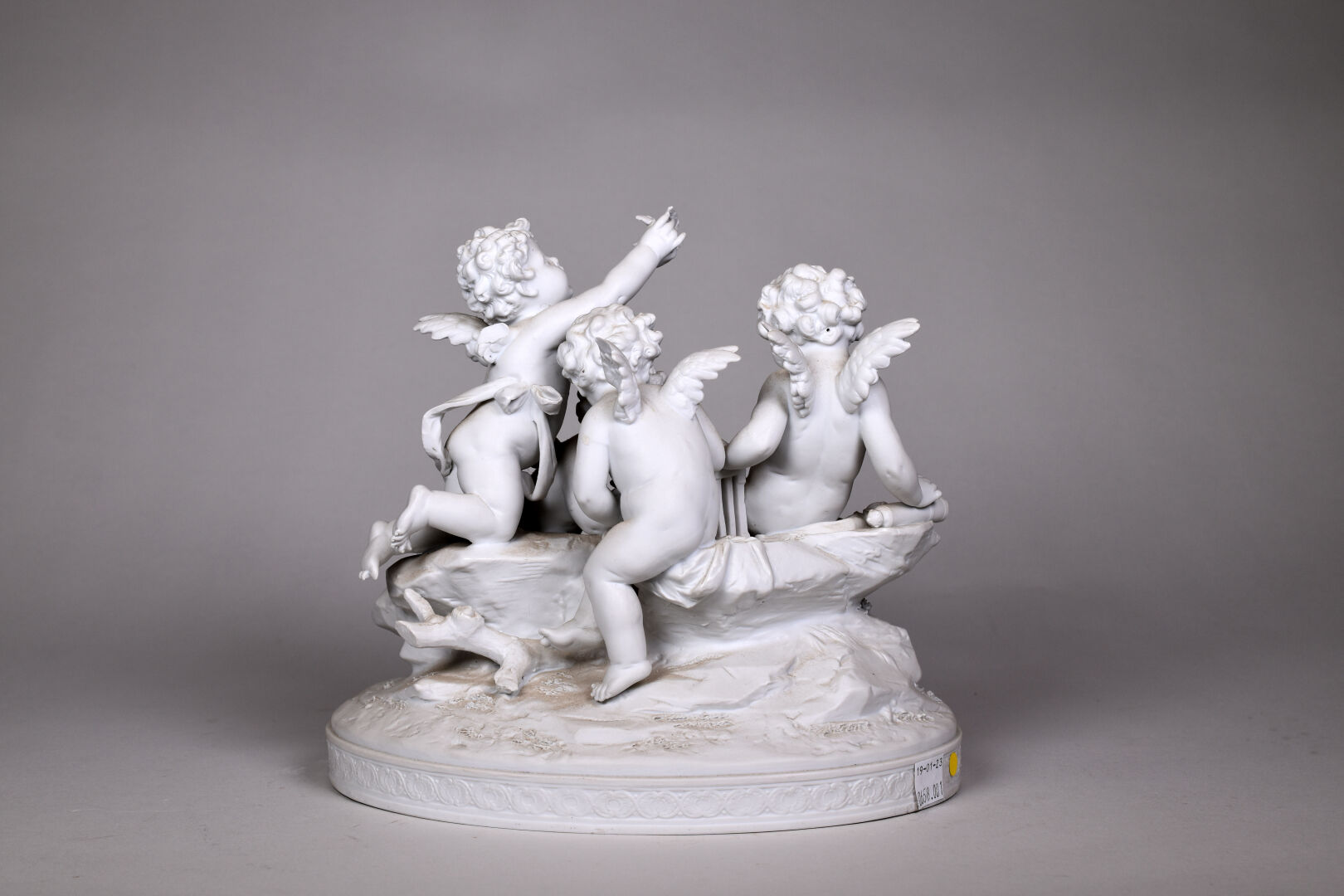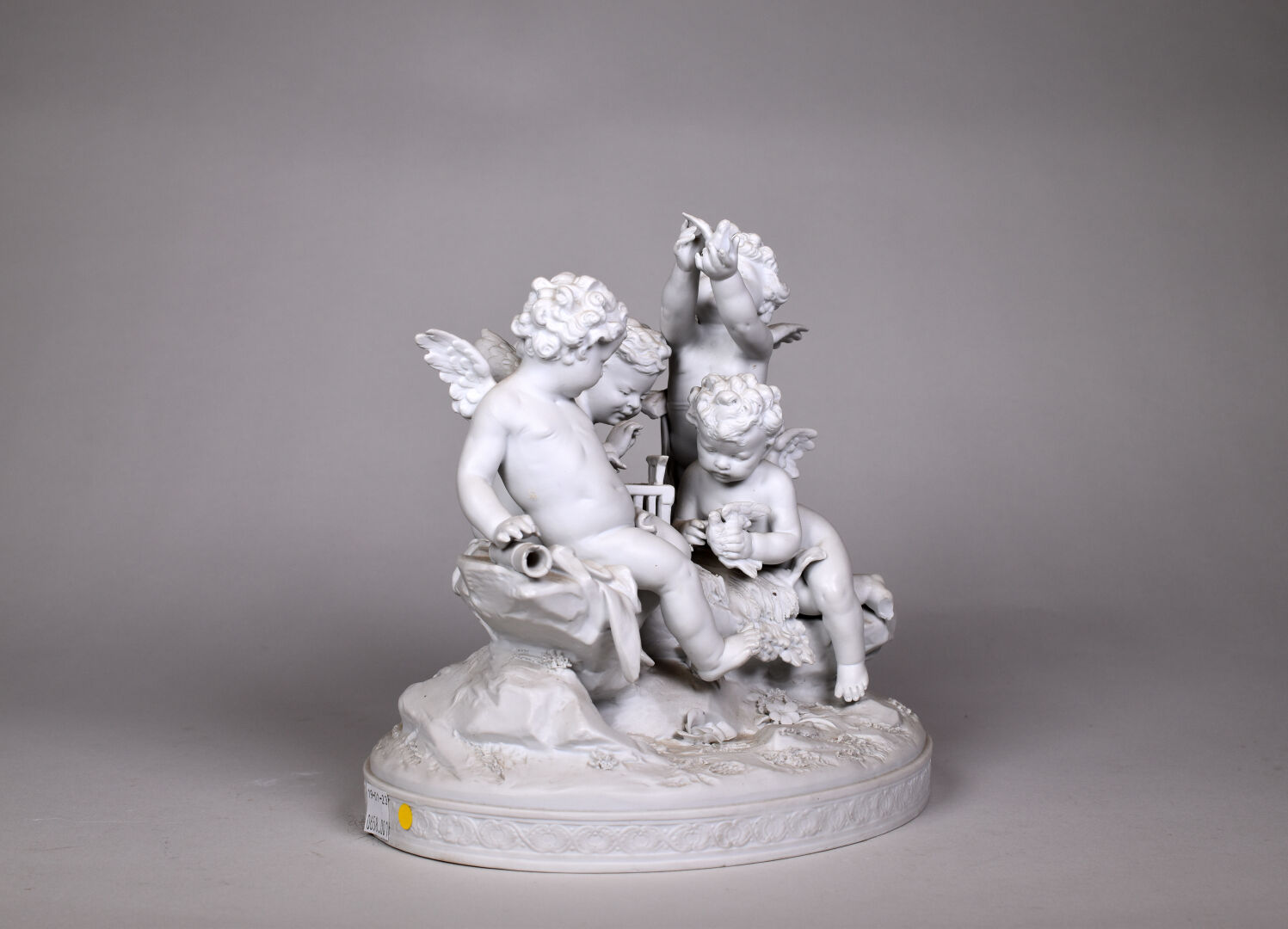 CAPODIMONTE. Groupe en biscuit figurant des angelots sortant des colombes d’une cage (éclats, une restauration). Marqué au dessous. Haut. : 23 cm.