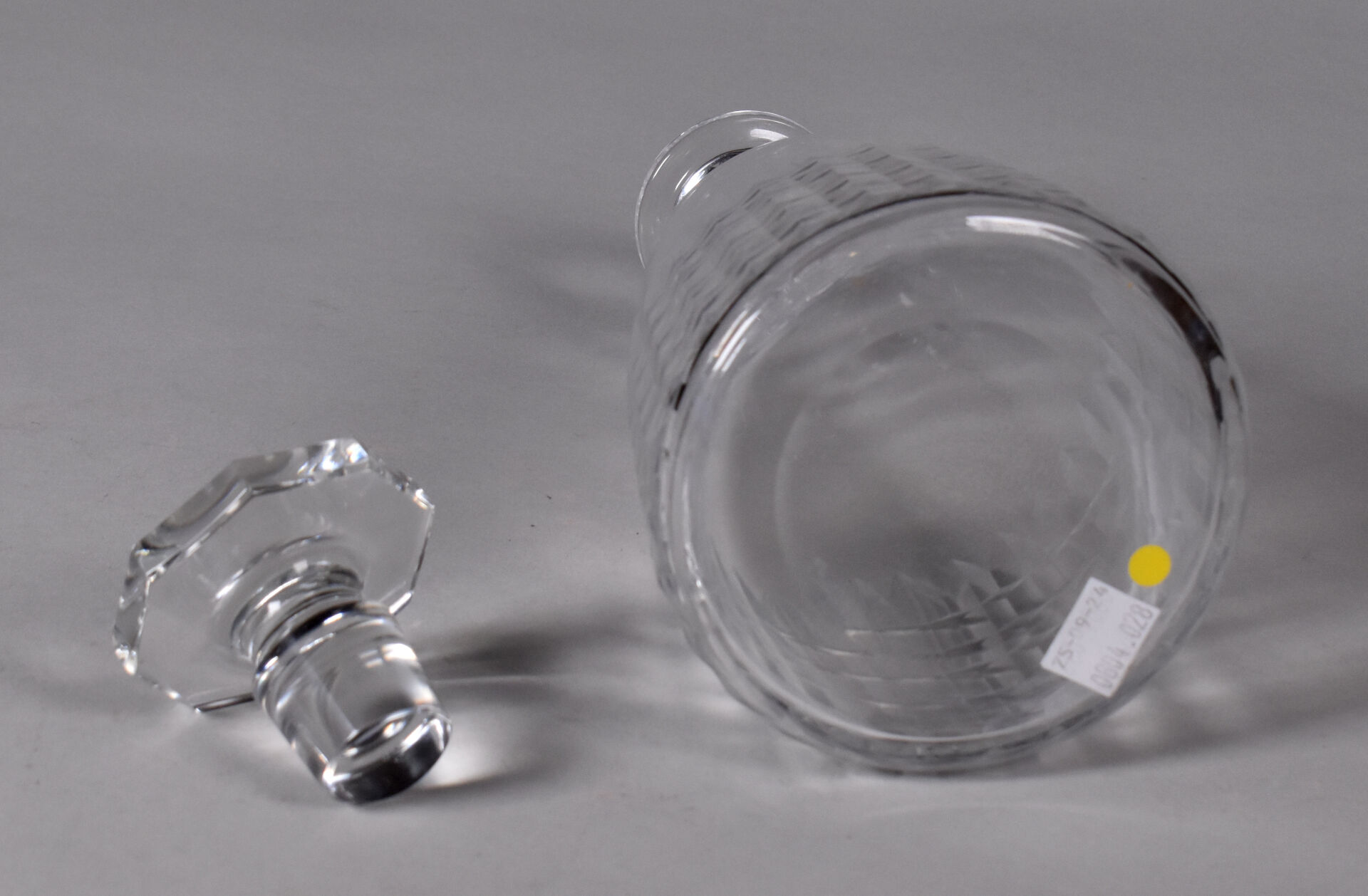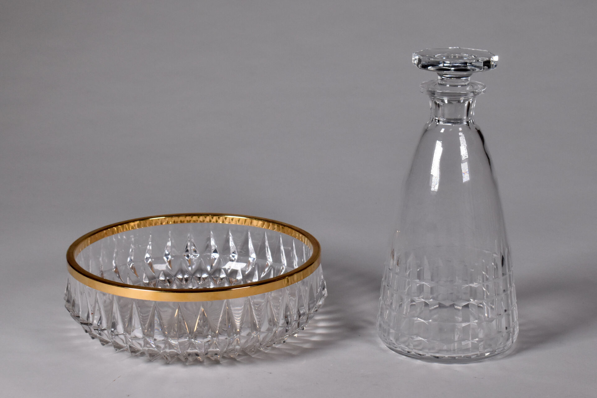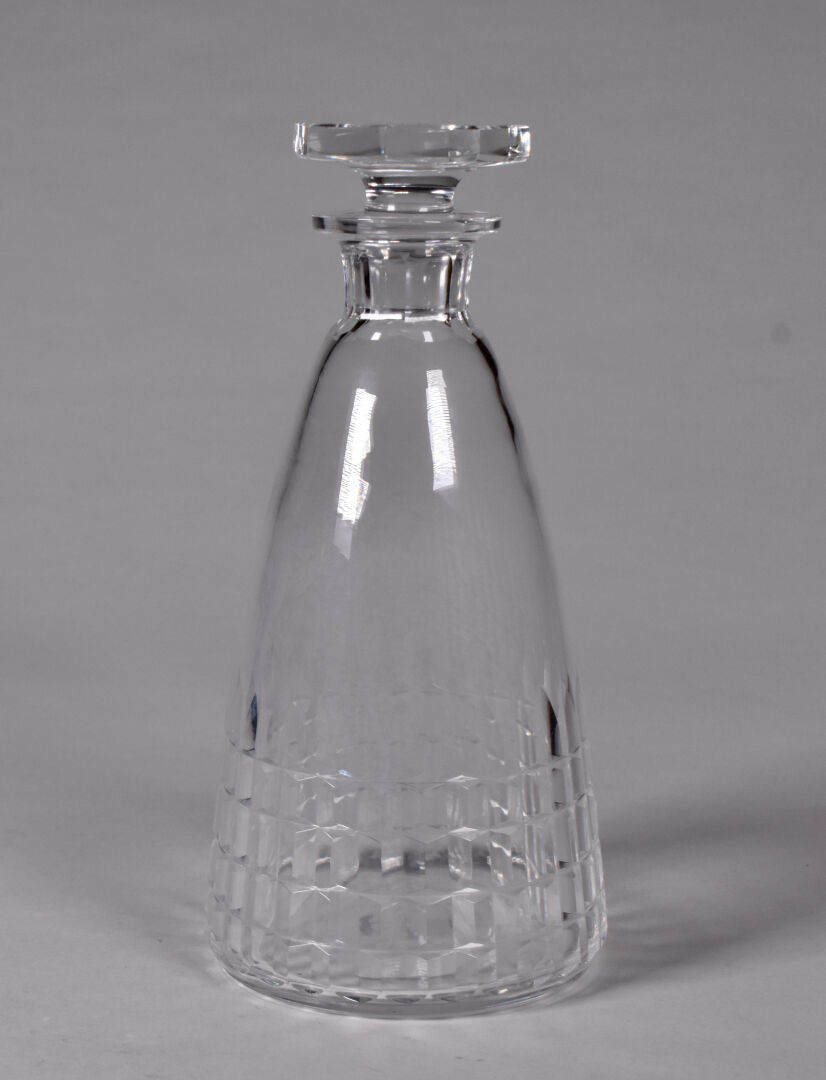 Carafe et bouchon en cristal taillé. haut. de la carafe : 25,5 cm. On joint une coupe en cristal taillé.