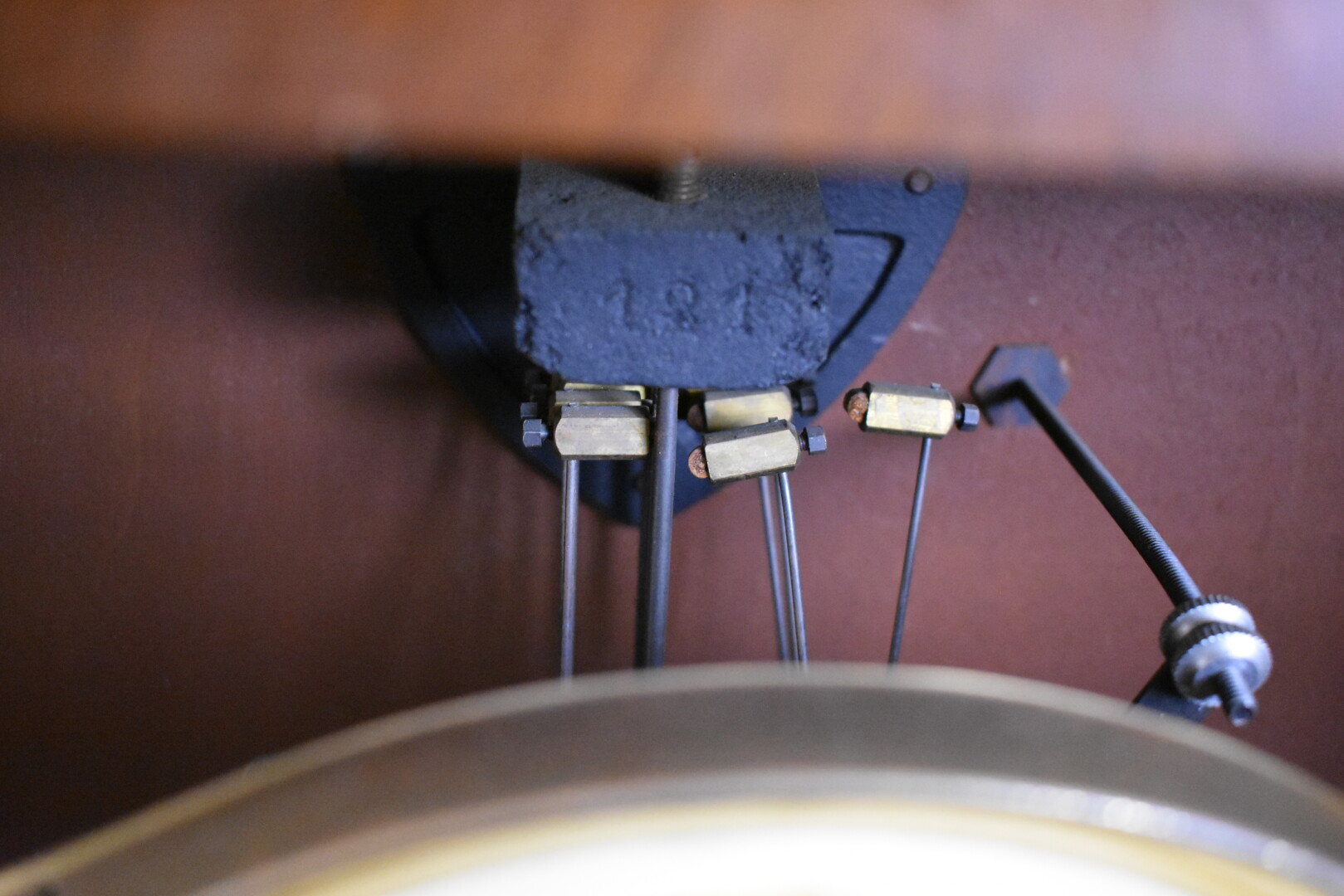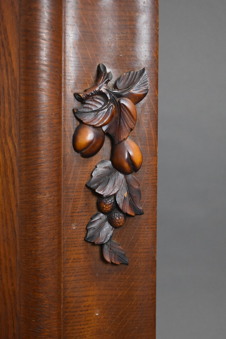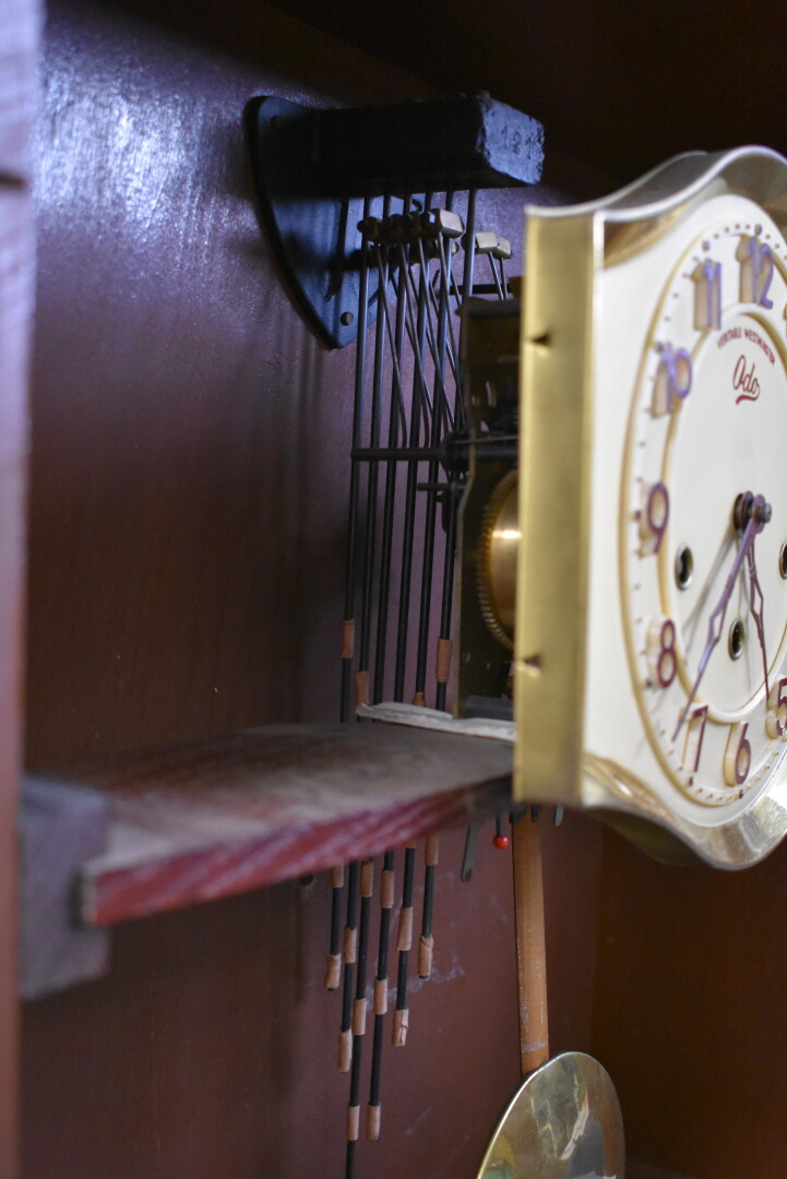 Carillon ODOT Westminster à 9 marteaux et 6 tiges. La caisse en chêne sculptée de fleurs. Vers 1930/1940. Haut. : 59,5 cm – Larg. : 55 cm – Prof. : 19 cm.