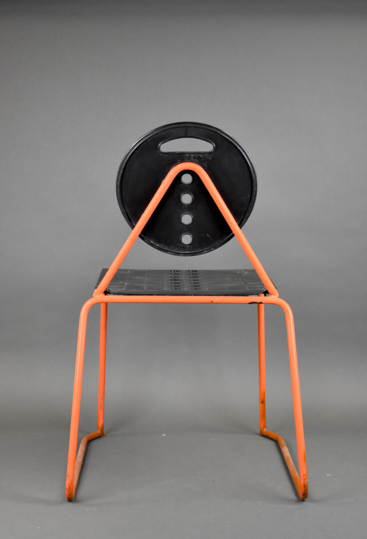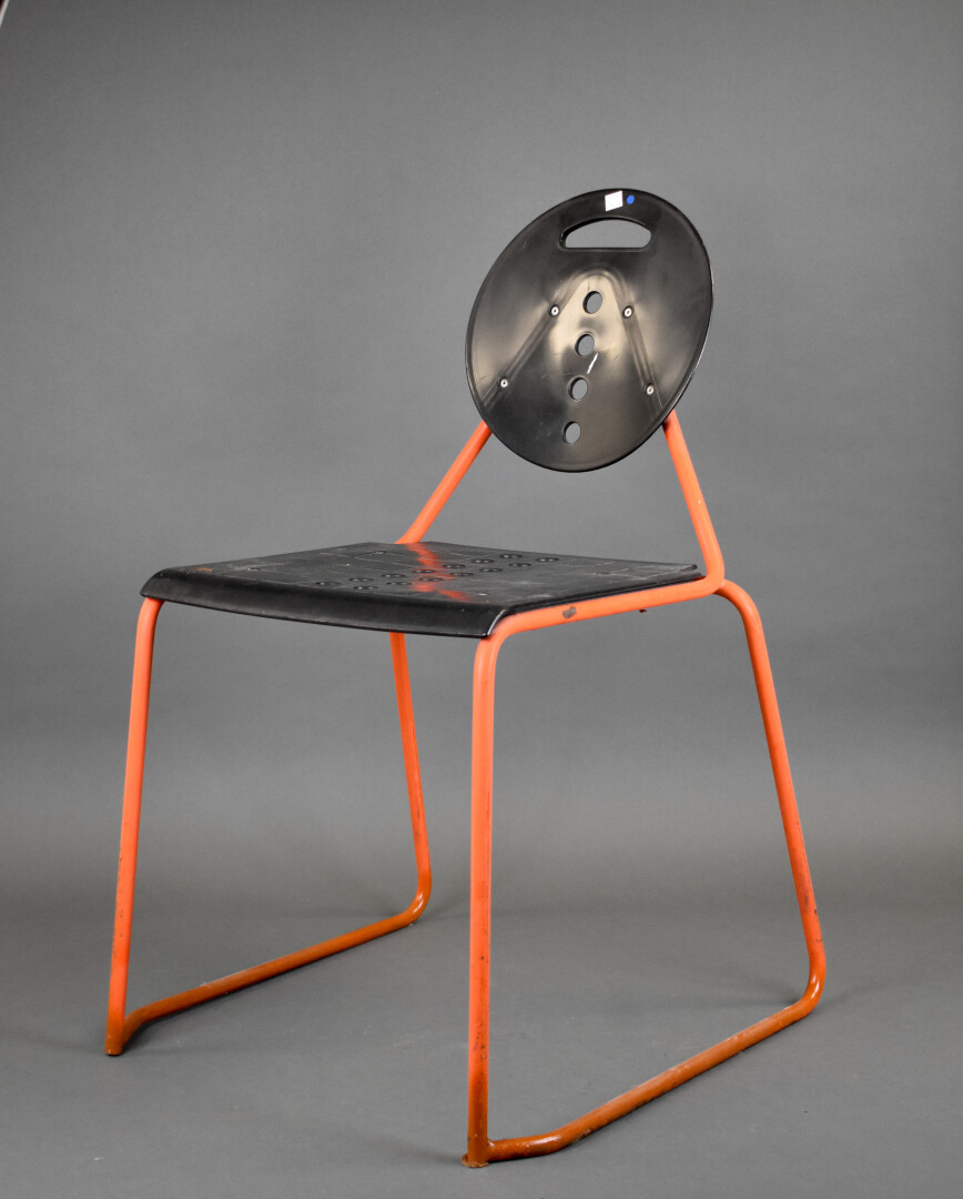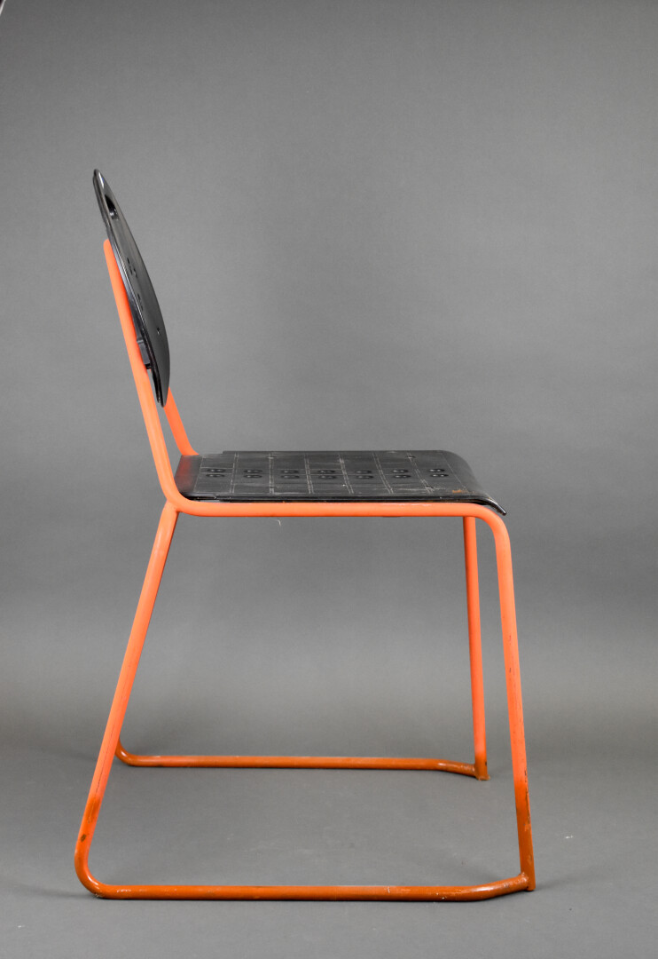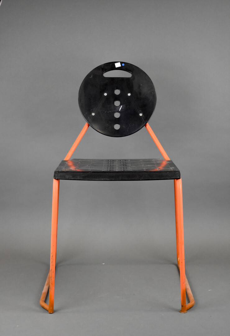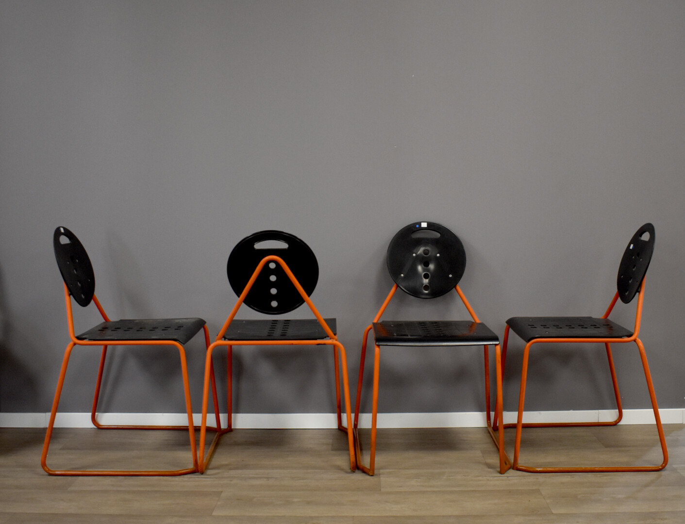 Carlo BIMBI et Nilo GIOACCHINI (XXe siècle). Suite de quatre chaises modèle Charlie à piètement en métal laqué brique et plastique noir (usures). Empilables. Marquées au-dessous de l’assise. Haut. : 82 cm.